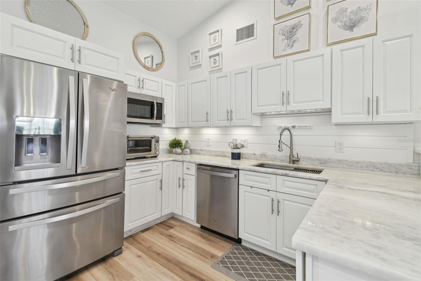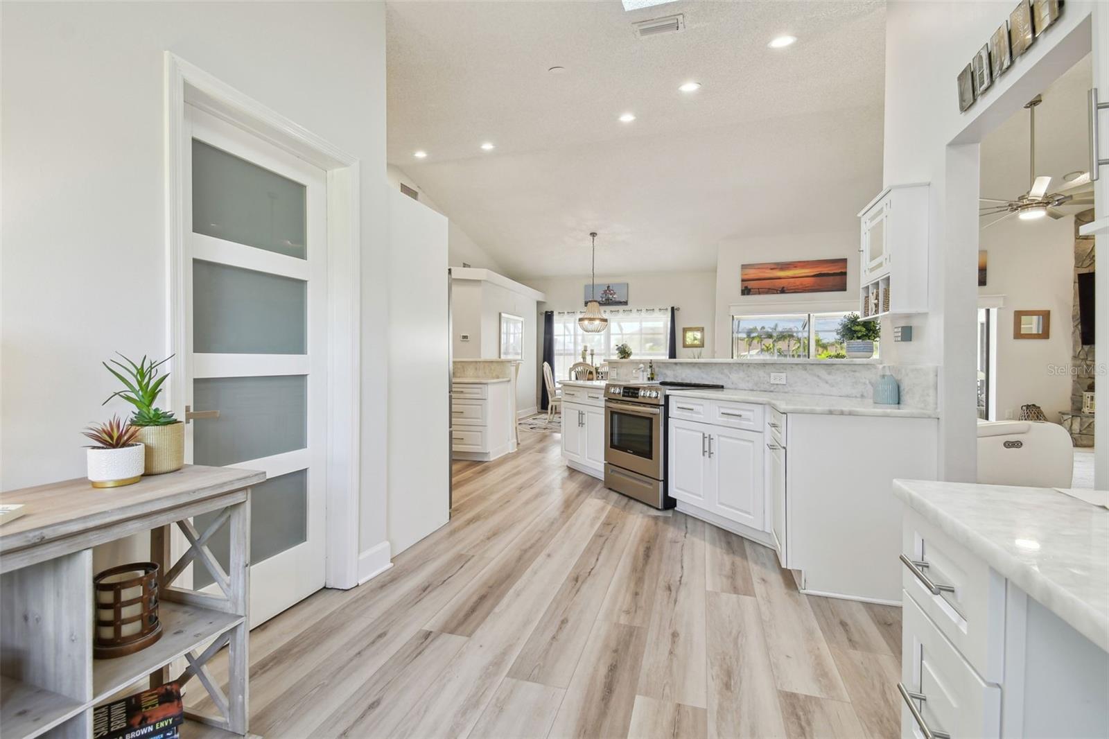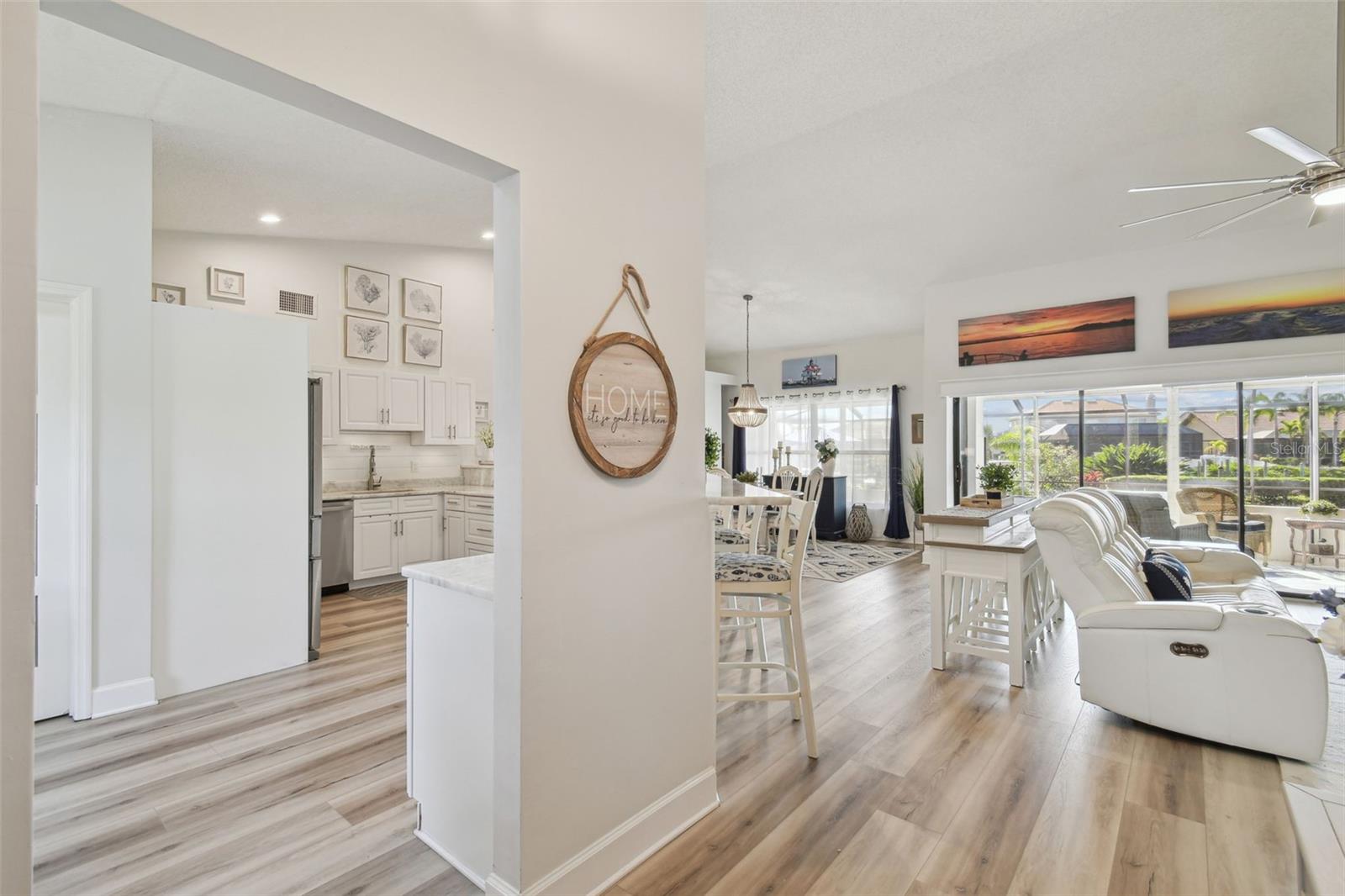 Welcome to 944 Symphony Isles Blvd, a BEAUTIFUL WATERFRONT RETREAT in the prestigious, 24-hour guard-gated community of Symphony Isles. THIS HOME IS HIGH & DRY AT 13' ELEVATION AND WAS WELL PROTECTED DURING RECENT STORMS WITH NO WATER INTRUSION. This 4-bedroom, 2-bathroom home has been thoughtfully updated with modern finishes, high-end features, and an open-concept design that maximizes space, natural light, and breathtaking water views. Step into your private oasis, where outdoor living meets resort-style luxury. Enjoy the oversized heated pool with a new variable-speed Bluetooth pool pump (2023), new pool filter (2023), and a solar cover with reel (2022). The lanai has been completely rescreened (2024), ensuring a pristine outdoor retreat. Your private dock with a newly upgraded finger pier deck (2024) and 12,000 lb boat lift provides direct access to Tampa Bay, making it effortless to enjoy boating and waterfront adventures. This home has been completely transformed with new engineered wood flooring throughout (2023), replacing all carpet. The entire interior has been freshly painted (2023), enhancing its bright, modern aesthetic. The chef’s kitchen underwent a full renovation (2022), featuring shiplap backsplash and bar fronts (2023), stylish cabinetry, and premium finishes—an entertainer’s dream. The vaulted living area seamlessly connects to the outdoors through 12’ pocket sliding doors, now enhanced with remote electronic blinds (2022). A barn door slider (2022) adds a stylish touch to the family room. All interior doors have been replaced (2023) with elegant Shaker frosted 5-panel glass/wood doors for a sleek, contemporary look. The den has been converted into a functional 4th bedroom/home office with a custom-built closet (2023), offering flexibility for your lifestyle. The guest bathroom was fully renovated (2022) with modern finishes. Three closets now feature custom organizers (2023) for optimized storage. This home is elevated for safety and equipped with power hurricane shutters (front and back) for added security. Major updates include a new roof (2021), new attic insulation throughout (2023), and an upgraded HVAC 4-ton system (2020). The driveway was widened to accommodate vehicles three-wide (2023), and a black aluminum fence was added (2022) for enhanced curb appeal. Throughout the home, you’ll find modern ceiling fans (2022) and new light fixtures that elevate every space. Outside, three new palm trees (2024) add to the lush tropical landscaping. Living in Symphony Isles means embracing a premier waterfront lifestyle with 24/7 security, a clubhouse, community pool, private beach, boat ramp, and marina—all with low HOA fees and no CDD! Plus, you’re just minutes from Apollo Beach Park, the Nature Preserve, and the Manatee Viewing Center, making it easy to explore Florida’s stunning natural beauty. Premier waterfront dining at Circle’s or Finn’s are just a golf cart or boat ride away. This is a rare opportunity to own a fully upgraded coastal paradise in one of the area’s most sought-after waterfront communities. Schedule your private tour today!