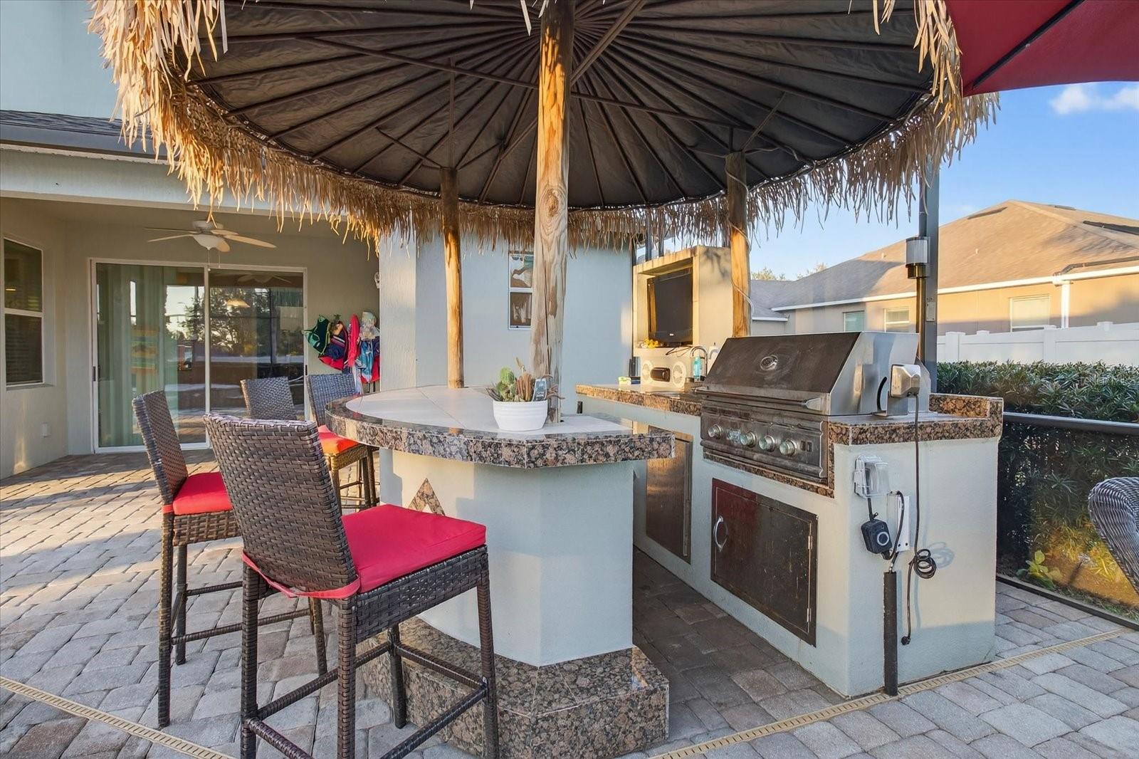 The kitchen flows seamlessly into the main living area, creating the ideal environment for hosting family and friends. Just outside, your private Florida retreat awaits. The resort-style pool isn’t just stunning… it’s fun. Complete with a slide, it turns everyday afternoons into moments of joy. Surrounding it is the ultimate outdoor living experience: a tiki bar, a grill setup, and plenty of space to host celebrations, quiet dinners, or long summer nights under the stars.
