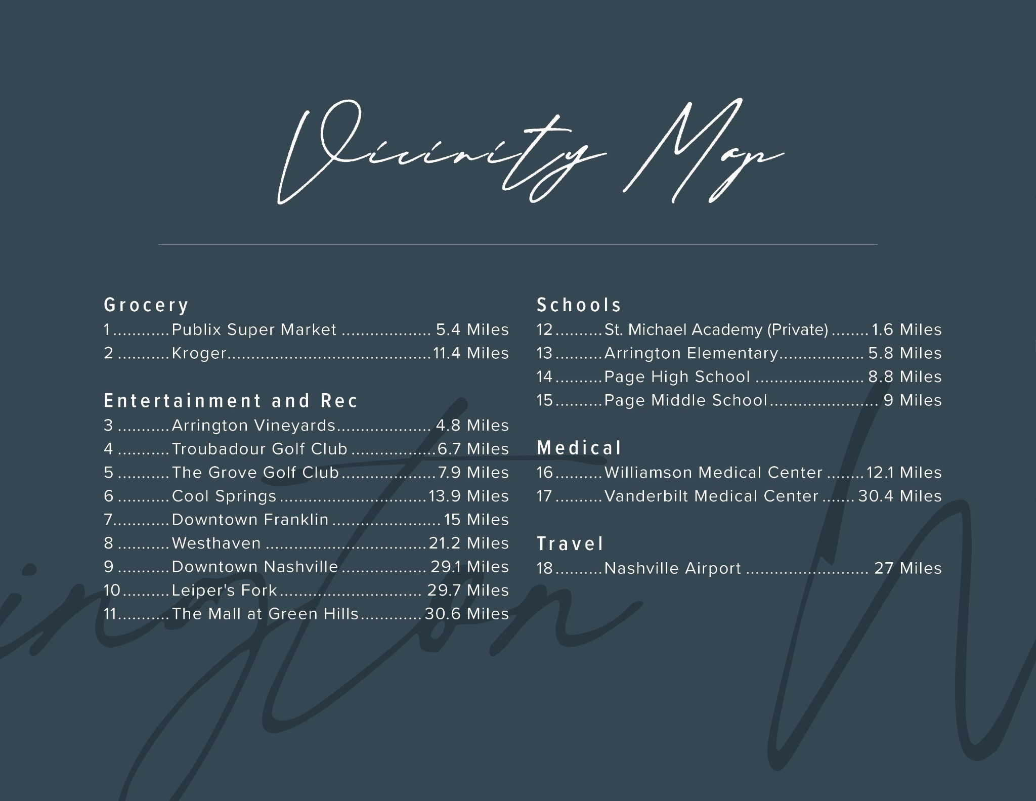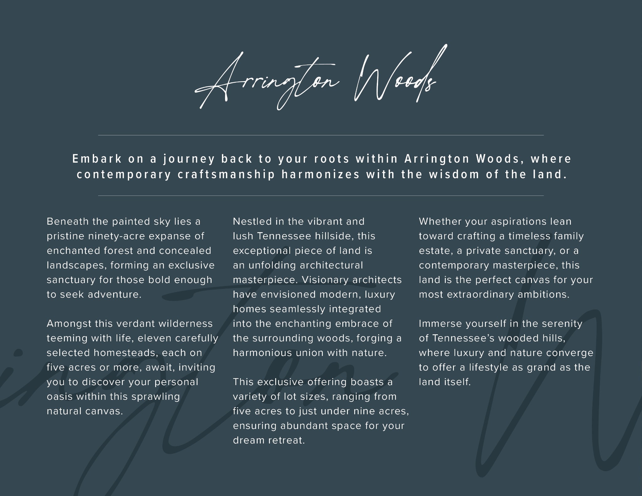 Ideally located near I-840, Arrington Vineyards, historic Downtown Franklin, and Murfreesboro, the property offers a peaceful retreat with convenient access to everyday amenities. Combining timeless natural landscapes with refined exclusivity, Arrington Woods presents a truly unparalleled opportunity to create your forever home in the heart of Williamson County.
