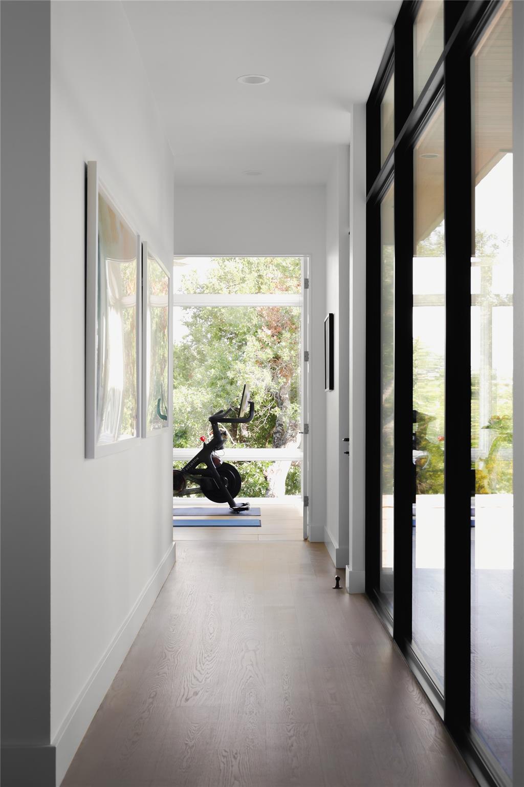 Discover an extraordinary fusion of contemporary sophistication and Hill Country charm within the prestigious gates of Spanish Oaks—Austin's premier golf course community. This singular architectural achievement by renowned Kai Geschke Architects presents a striking study in modern minimalism, where crisp white walls and refined neutral palettes create an exquisite canvas for discerning art collectors. Expansive floor-to-ceiling windows frame breathtaking landscape vistas while flooding every room with glorious natural light. This meticulously crafted single-story residence flows effortlessly throughout, featuring a seamless great room design and an open-concept living, kitchen, and dining area complemented by an elegant formal dining space. Beyond the main living areas, a thoughtfully designed upper level offers an additional 591 square feet of finished, climate-controlled space—bonus square footage that enhances the home's versatility without being included in the primary floor plan, perfect for a private office, studio, or flexible living area. Built for generations with premium, enduring materials, this home seamlessly integrates cutting-edge technology with environmental consciousness. Energy-efficient systems, comprehensive LED lighting, intelligent mirrors, and sophisticated automation create an unexpectedly low-maintenance luxury lifestyle. The outdoor sanctuary centers around a magnificent 60-foot lap pool and spa, perfectly positioned alongside a chef-caliber outdoor kitchen equipped with integrated heating and cooling systems. Wellness enthusiasts will appreciate the private gym with adjoining steam room for the ultimate experience. Nestled on an exclusive enclave overlooking the first hole of Spanish Oaks' championship golf course—masterfully designed by former PGA architect Bobby Weed—this retreat offers complete serenity within one of Austin's most coveted gated communities.