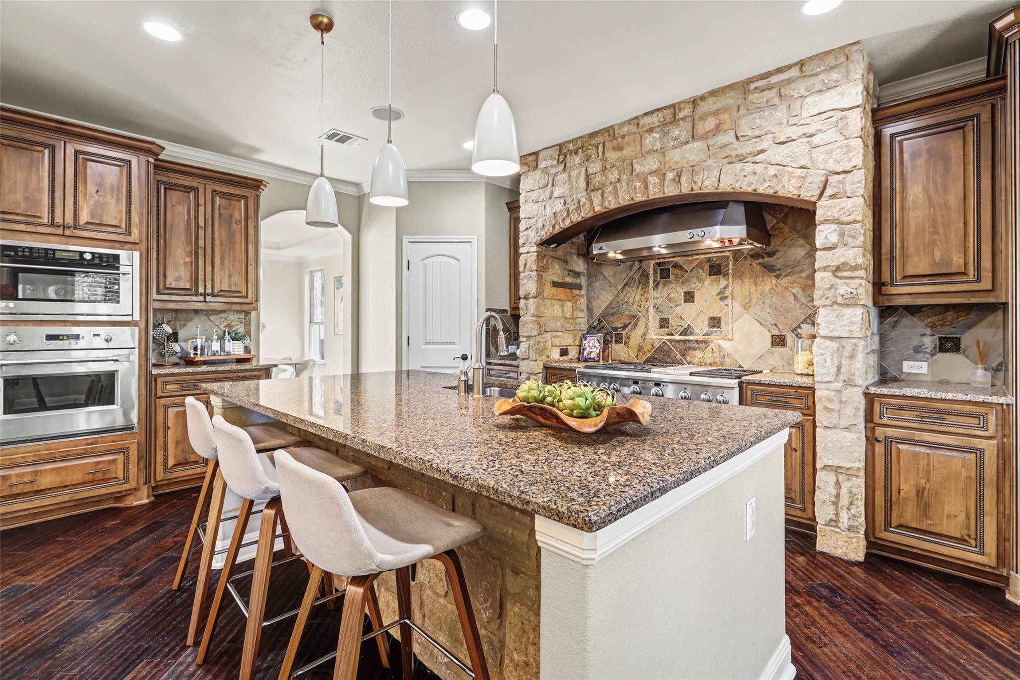 Set on a rare 70’ wide lot in a gated enclave of a master-planned community with Blue Ribbon schools, this Italian-inspired executive residence offers 4,225 square feet of refined living with exceptional privacy, backing to the federally protected Balcones Canyon Preserve. Designed to impress yet live effortlessly, the home features 5 bedrooms, a private office, flex space, media room, and a dramatic two-story living room filled with natural light. The backyard is a true resort-style, year-round retreat with an in-ground pool and spa, upgraded outdoor kitchen w/ grill, fridge, sink & built-in ice chest. Automated exterior shades and misters are perfect for entertaining or unwinding under the covered patio amid serene, tree-lined views. Inside, a recent $300k luxury remodel of the primary suite delivers spa-level indulgence with nautical-grade solid walnut cabinetry, a fully enclosed steam shower with a 6’ slab bench & Waterworks fixtures. Two expansive walk-in closets feature walnut professional organizers, a wall safe, and a discreet hydraulic in-ground safe. Additional highlights include a remodeled Jack-and-Jill bathroom, chef’s kitchen with built-in refrigerator, oversized island, newer commercial grade appliances, automated interior shades, plantation shutters, tankless water heater, water softener, whole-home audio, and generous attic storage. Custom built-ins enhance both the office and flex space. A three-car garage with epoxy floors and separate A/C completes this exceptional home—where luxury, privacy, and timeless design converge. Steiner Ranch is a master planned community just 30 minutes from downtown Austin, Apple or Dell campuses. Prized for it's rolling hill landscape down to Lake Austin, private boat ramp, 25+ miles of hiking & biking trails in addition to numerous parks, dog park, restaurants, professional services & grocer within the neighborhood.
