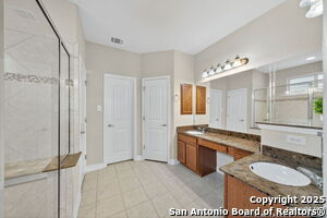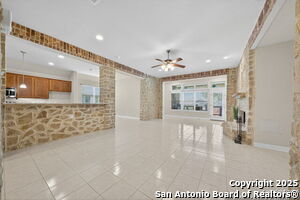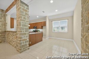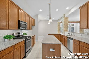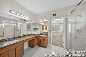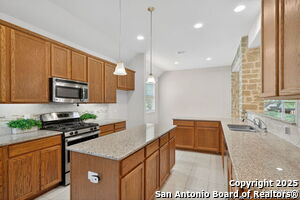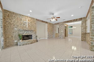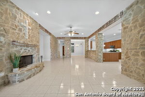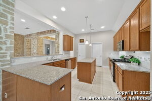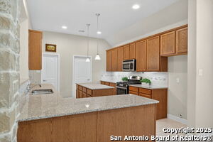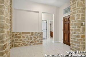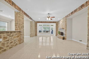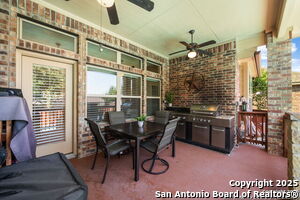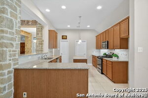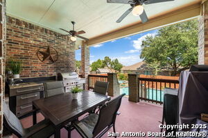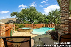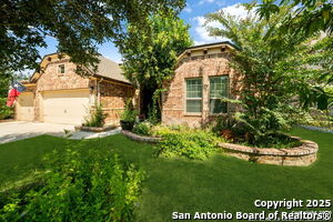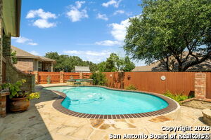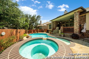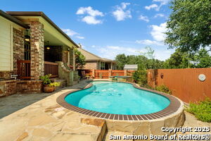 Experience Hill Country elegance in this beautifully crafted single-story residence located in the gated community of Balcones Creek. Designed to impress, this home offers 2,316 square feet of thoughtfully planned living space with four spacious bedrooms, three bathrooms, and a formal dining area. At the heart of the home, a floor-to-ceiling stone fireplace with custom hearth and brick mantle serves as a stunning centerpiece, complemented by soaring tray ceilings and abundant natural light. Expansive sight lines connect the inviting family room to the gourmet kitchen, where upgraded granite countertops, rich cabinetry, a large center island, and stainless steel appliances create the perfect setting for everyday living and entertaining. The serene primary suite offers a luxurious retreat, featuring dual vanities, a walk-in shower, and a generous closet. Secondary bedrooms provide flexibility for family, guests, or a dedicated office. Throughout the home, custom rock and brickwork elevates the architectural character, with the living room fireplace designed to the ceiling and a cross inlay seamlessly worked into the stone. Stepping outside, you'll discover a private backyard oasis built for relaxation and entertaining. A covered patio overlooks the sparkling pool and spa, surrounded by thoughtful upgrades that include a custom rocked firepit, brick light columns, curved rock patio stairwell, brick-framed benches, and an outdoor kitchen designed for alfresco gatherings. Extensive exterior stonework continues throughout, from the stucco chimney to the brick patio columns, ensuring a timeless and durable finish that sets this property apart. Custom LED lighting illuminates both interior and exterior spaces, including the pool and spa, creating an inviting ambiance after sunset. This home is as functional as it is beautiful, featuring a smart home system with alarm and full irrigation, a CPS-approved $30,000 home power backup system with discreet south-facing panels, and the highly desirable Tesla Powerwall 3-an industry-leading backup power solution eligible for a 30 rebate from the federal government. Garden enthusiasts will appreciate the raised vegetable and herb garden with internet-controlled irrigation that extends to backyard flower beds, while those who enjoy poolside living will benefit from the recently rebuilt pool and spa equipment, complete with new display, valves, pump, and natural gas heating for efficient year-round use. A new HVAC system, with most critical components replaced in 2025 and under warranty, provides peace of mind for years to come. Balcones Creek is a premier Hill Country community offering gated privacy, a planned junior Olympic pool, scenic trails, and close proximity to Boerne's charming Main Street, top-rated schools, and the conveniences of San Antonio just minutes away. Whether enjoying quiet evenings under the Hill Country sky or hosting unforgettable gatherings by the pool, this property offers a lifestyle that is both elevated and enduring.