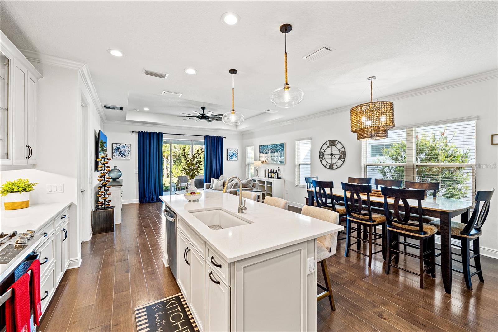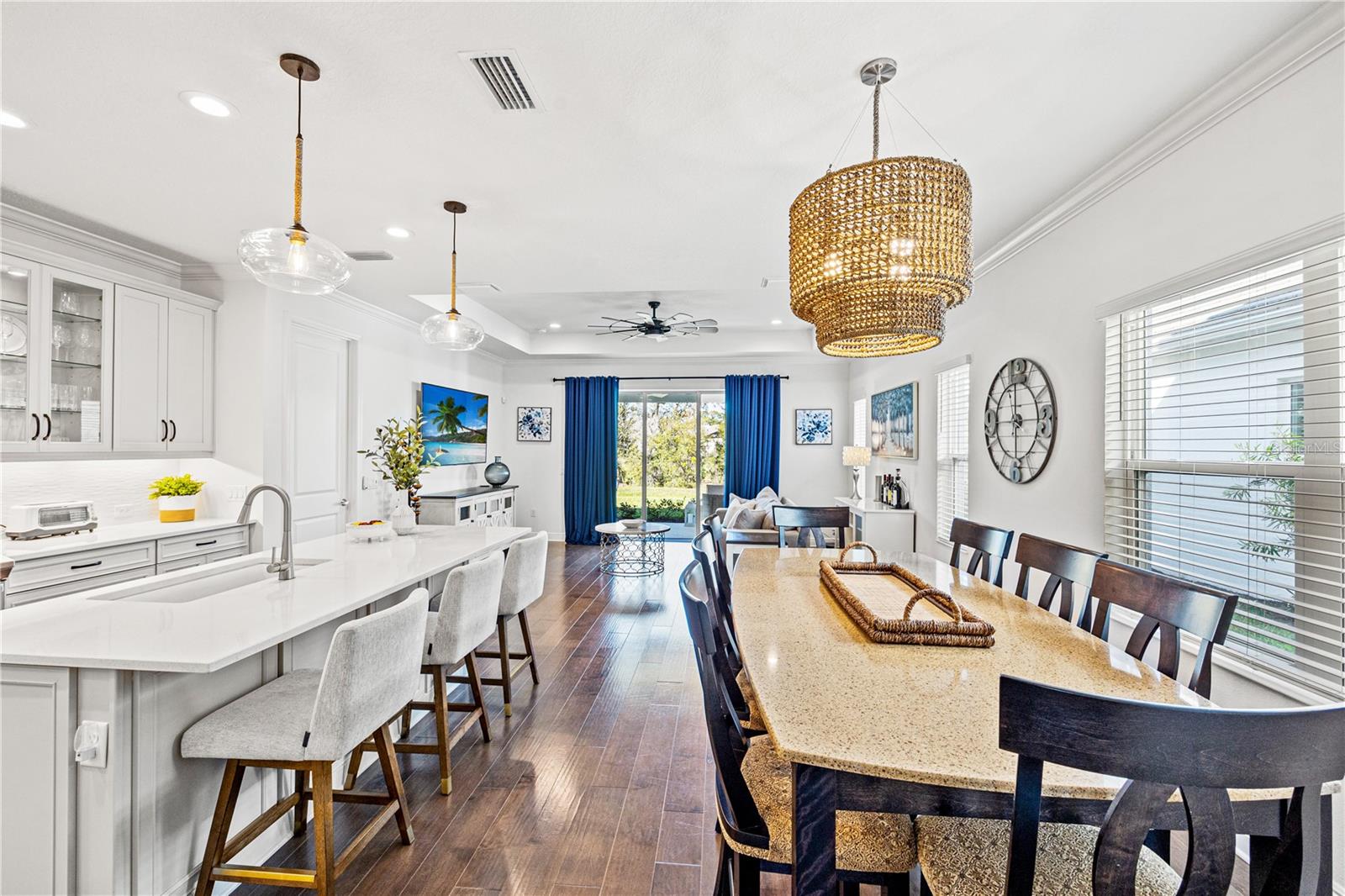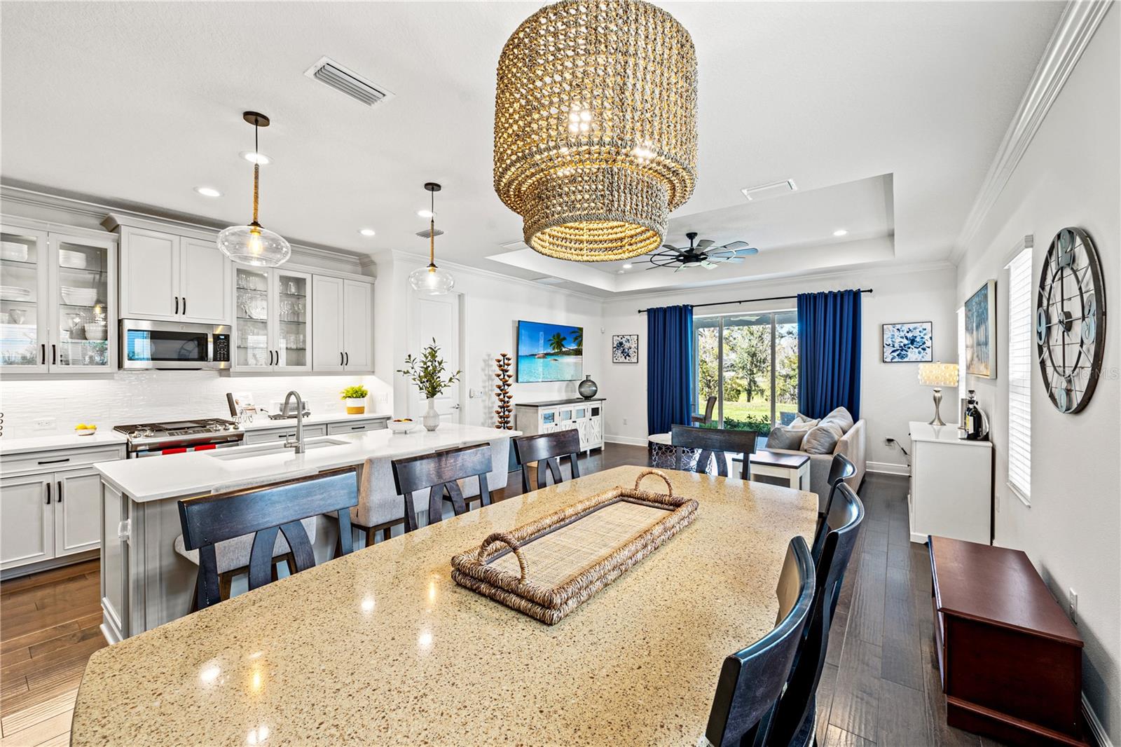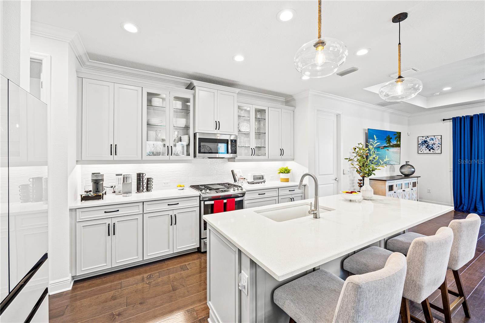 Inside, the Great Room welcomes you with soaring tray ceilings and stylish luxury flooring, creating a seamless flow throughout the main living area. At the heart of the home, the gourmet kitchen is designed for both style and functionality. The oversized island with quartz countertops, custom cabinetry with glass accents, and sleek stainless steel appliances set the tone for a high-end feel. Contemporary pendant lighting adds a touch of sophistication, while the walk-in pantry with a stylish glass door provides ample storage. Cooking is effortless with a gas range, built-in microwave, deep sink, and elegant white cabinetry accented by a modern backsplash.