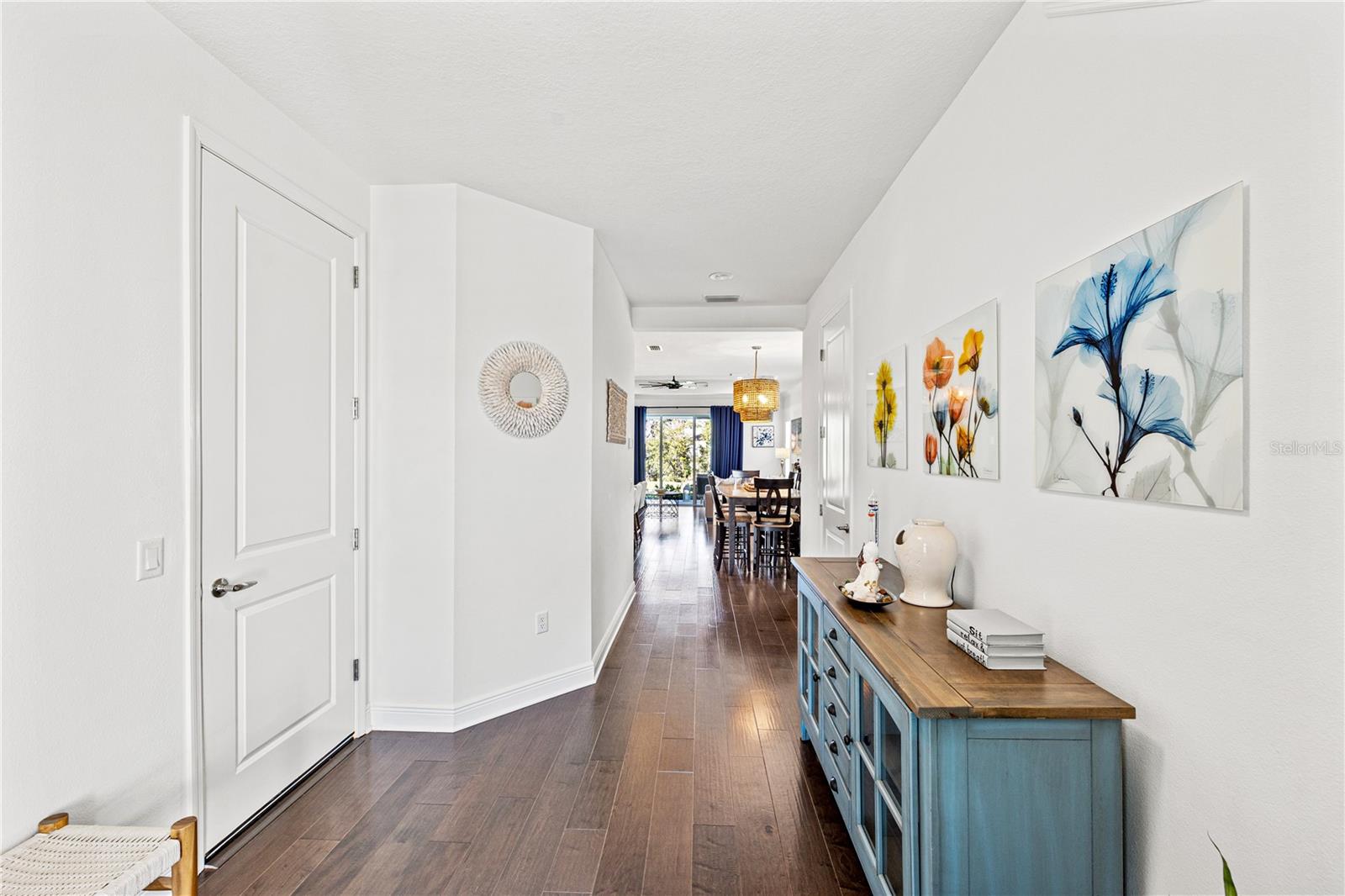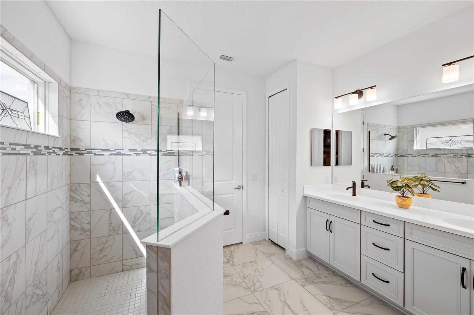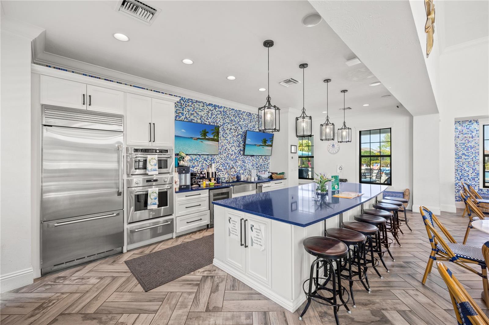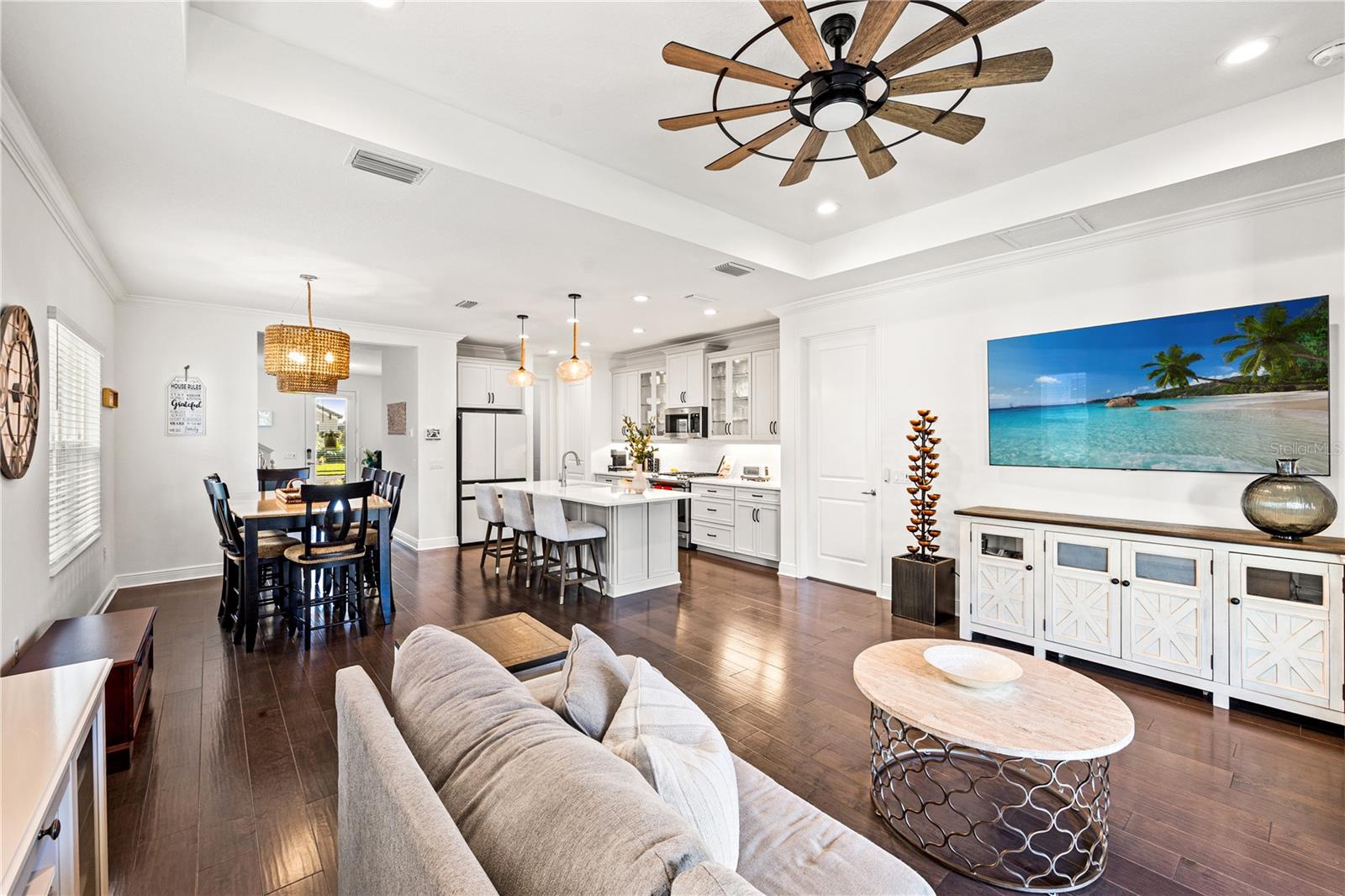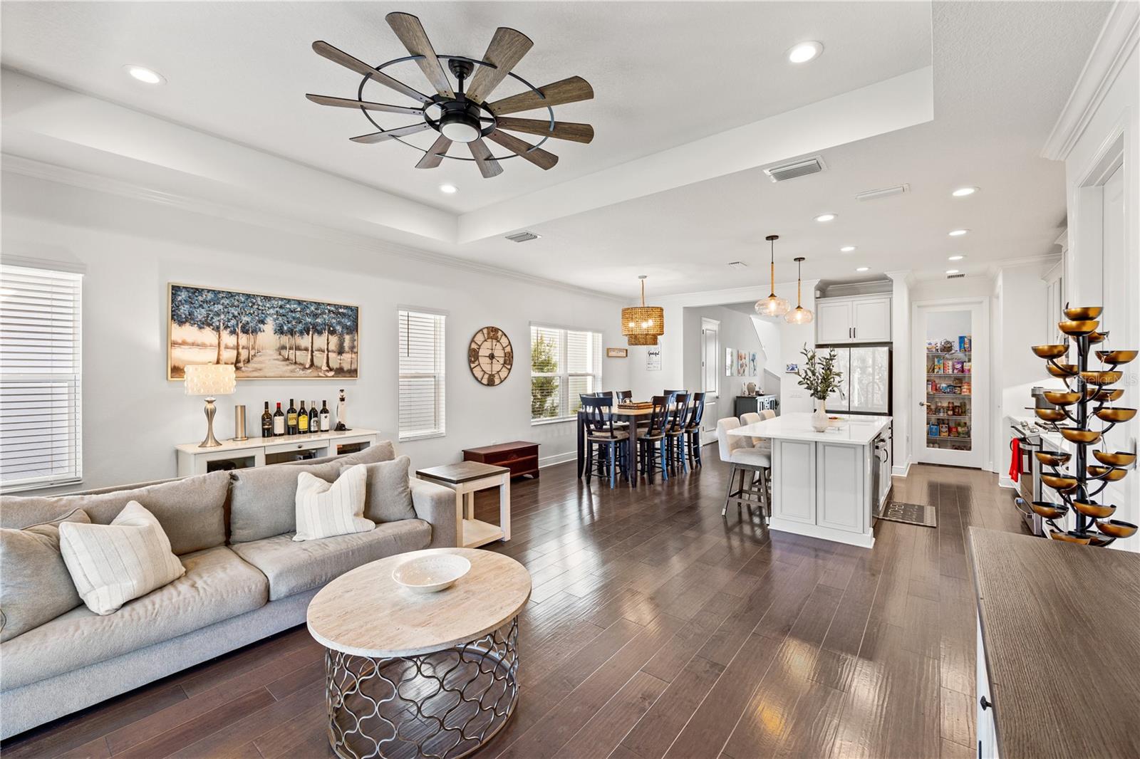 Inside, the Great Room welcomes you with soaring tray ceilings and stylish luxury flooring, creating a seamless flow throughout the main living area. At the heart of the home, the gourmet kitchen is designed for both style and functionality. The oversized island with quartz countertops, custom cabinetry with glass accents, and sleek stainless steel appliances set the tone for a high-end feel. Contemporary pendant lighting adds a touch of sophistication, while the walk-in pantry with a stylish glass door provides ample storage. Cooking is effortless with a gas range, built-in microwave, deep sink, and elegant white cabinetry accented by a modern backsplash.