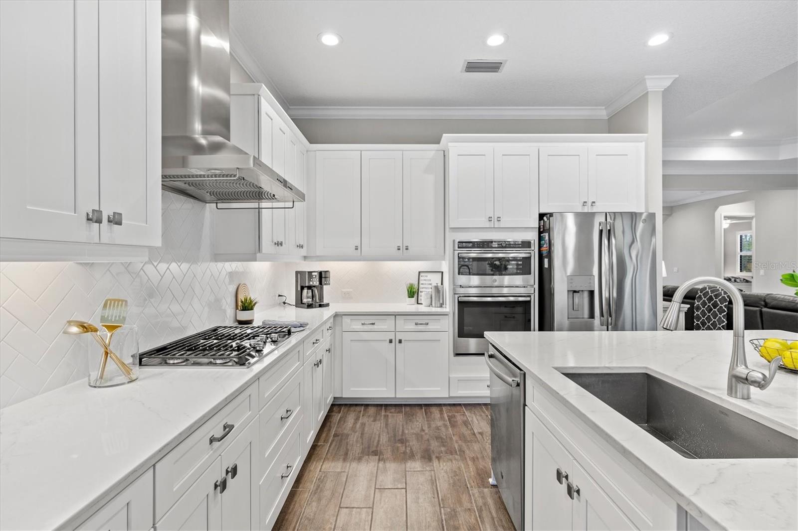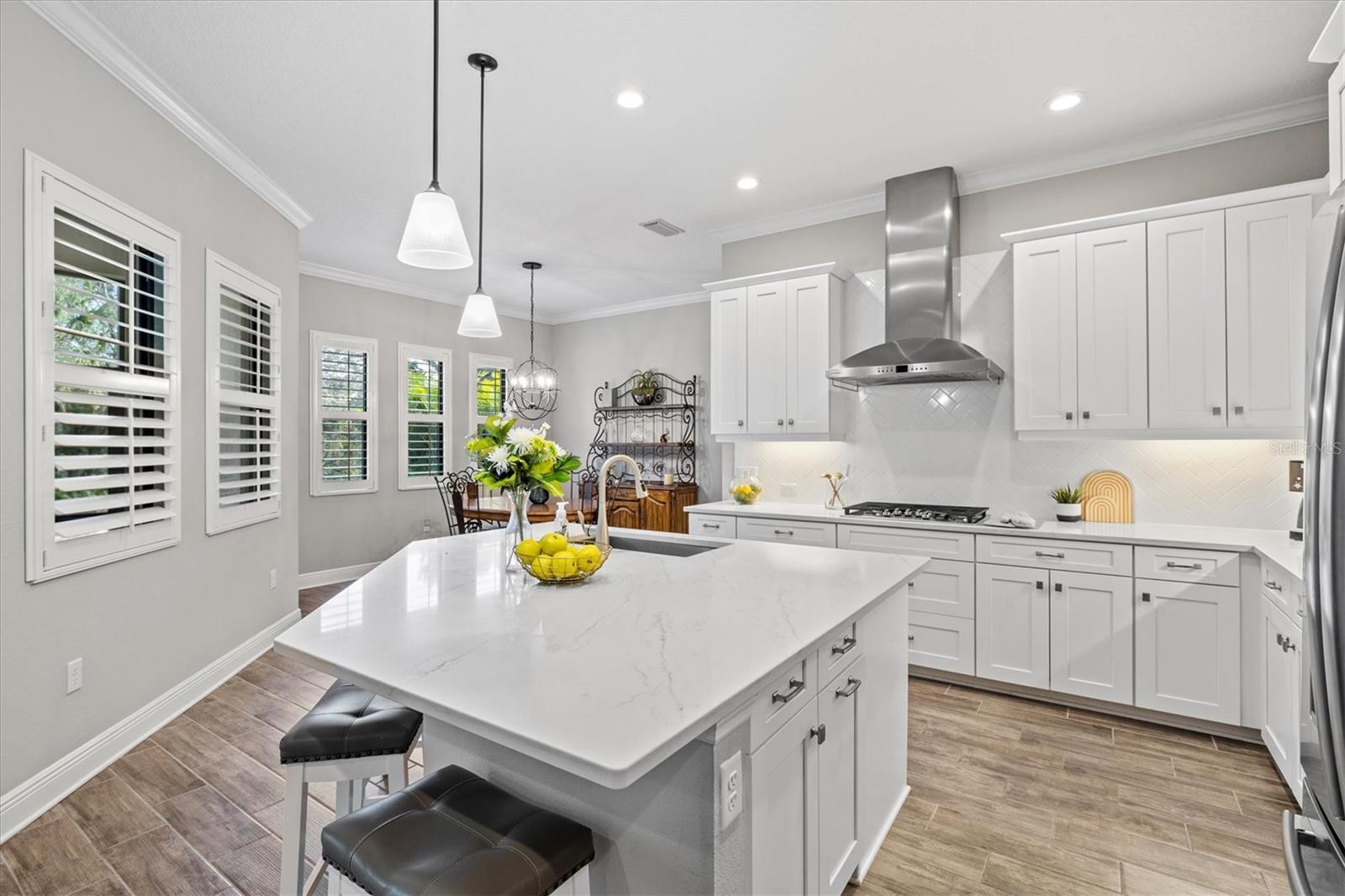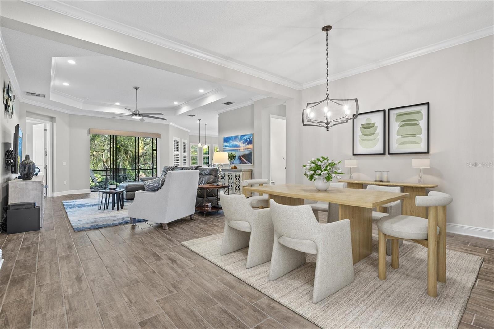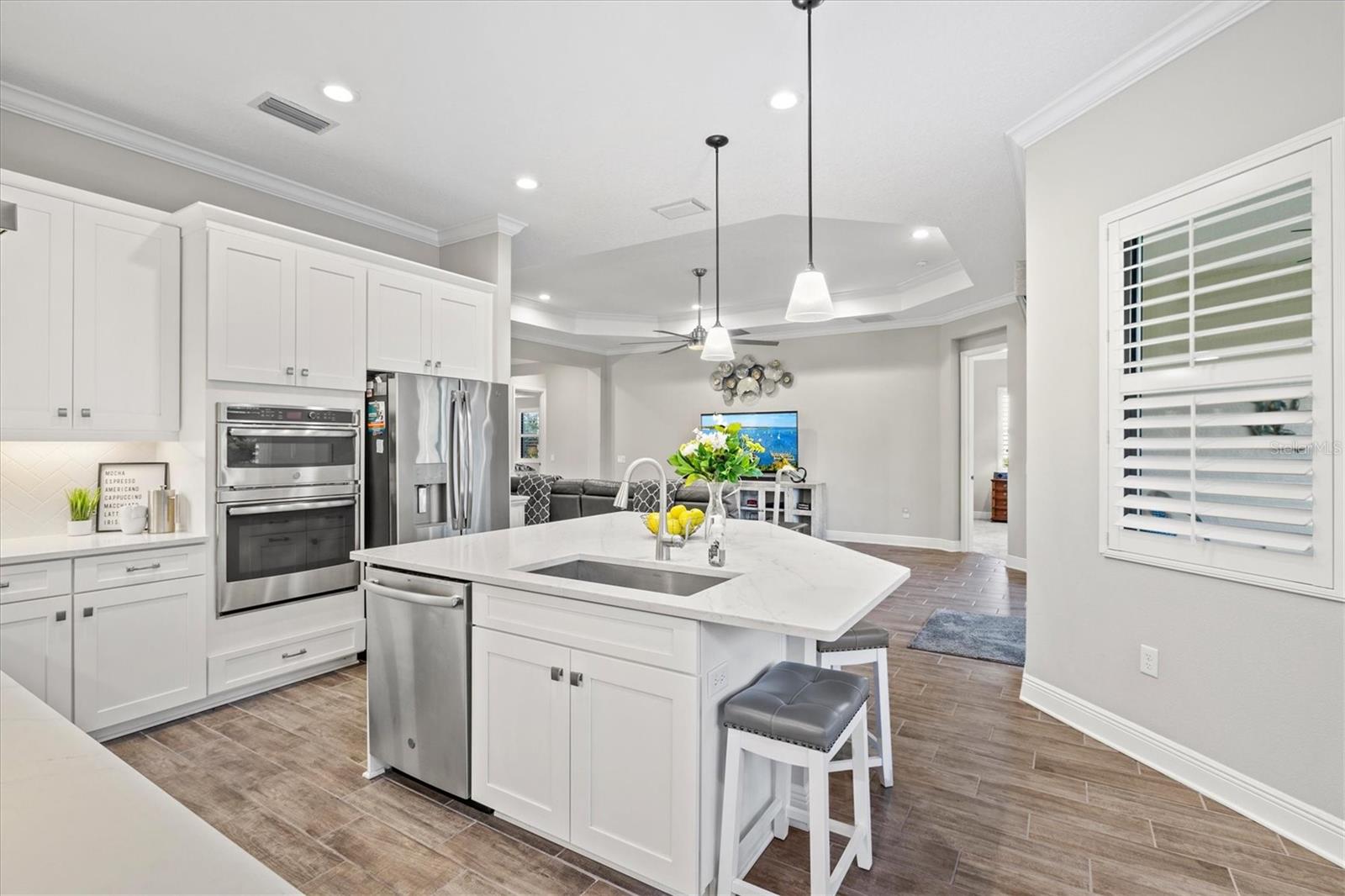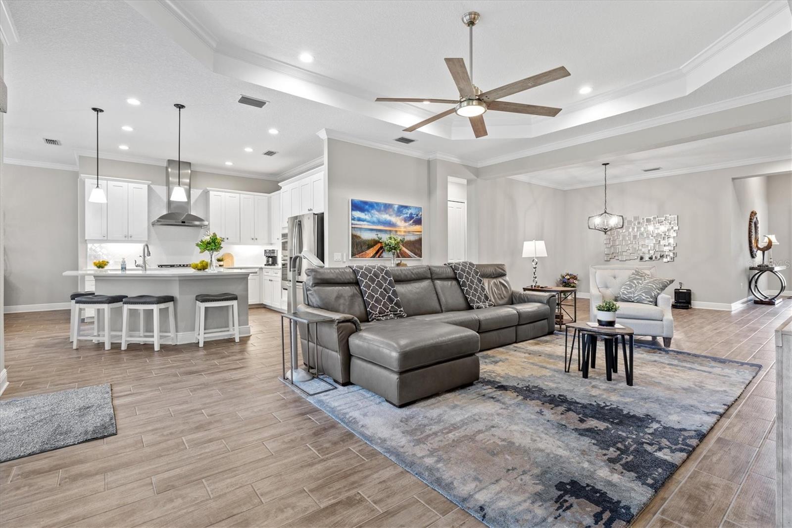 The heart of the home is a true showstopper. A chef’s dream kitchen awaits, appointed with a sprawling quartz island illuminated by designer pendant lights, an oversized walk-in pantry, premium stainless steel appliances, and crisp white cabinetry—all perfectly positioned for seamless entertaining. Adjacent, the open-concept dining and living areas, framed by elegant tray ceilings, flow effortlessly onto the lanai, revealing peaceful preserve views that create a breathtaking backdrop for everyday living and special gatherings alike.
