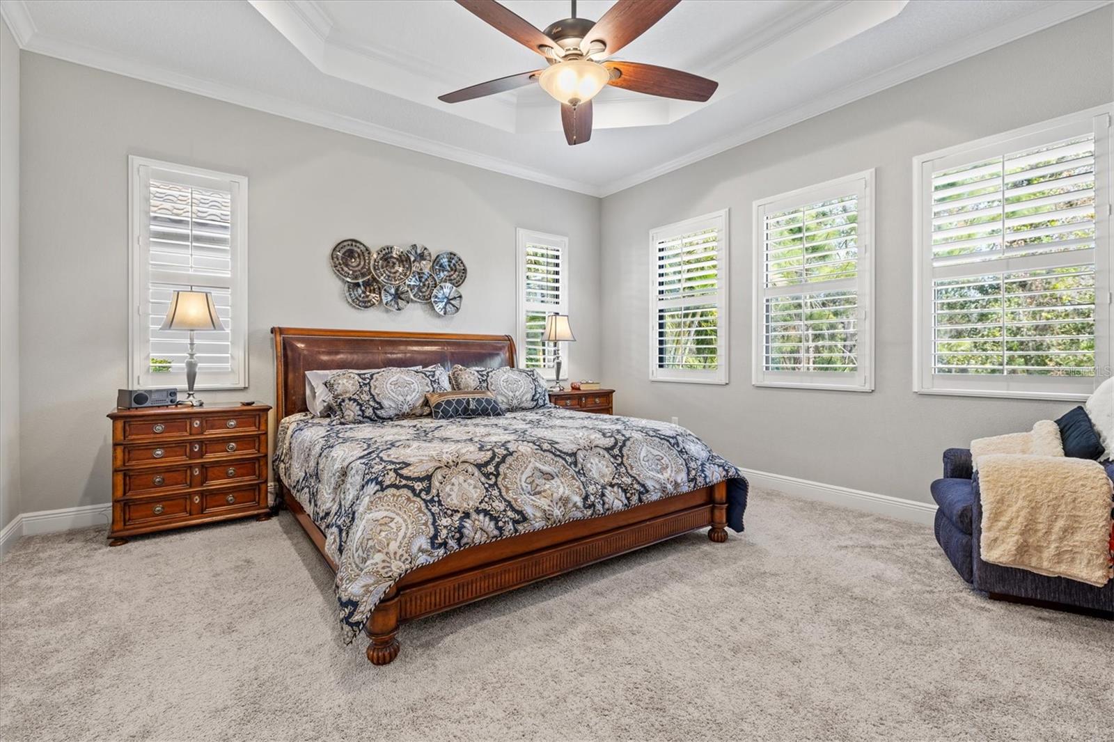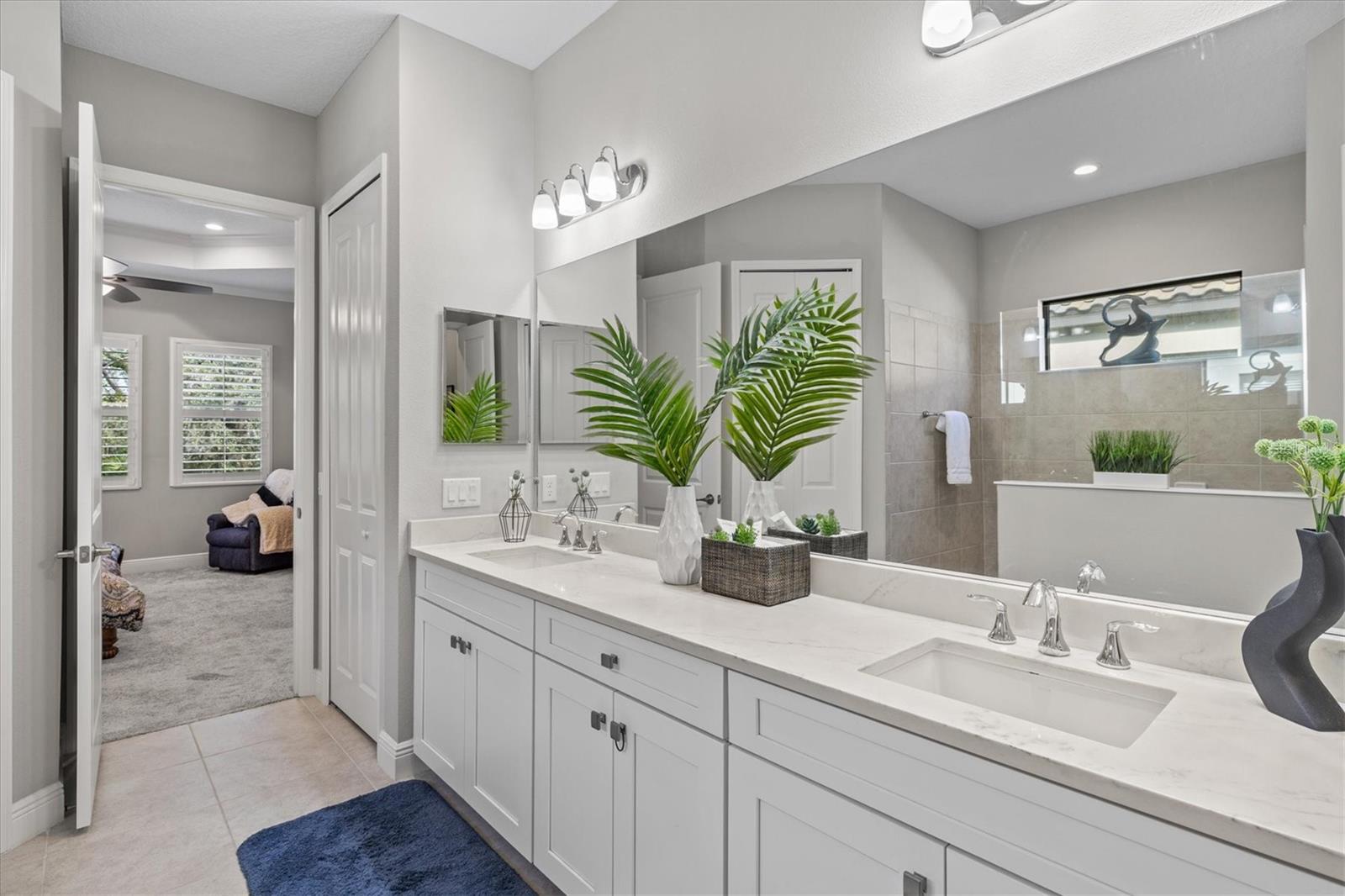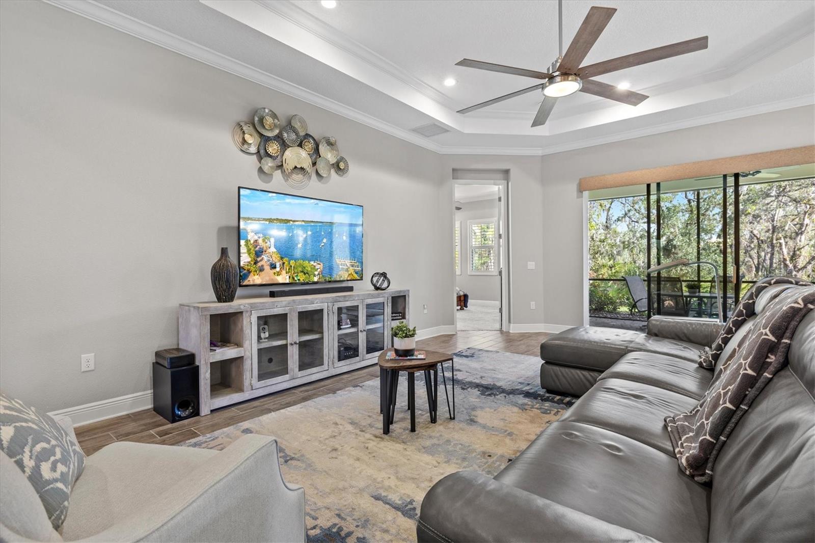 A striking glass-inset front door welcomes you into a sun-drenched foyer, where natural light dances across sleek ceramic tile floors and soaring tray ceilings set a grand tone. Attention to detail is evident throughout—plantation shutters, crown molding, and designer lighting accents elevate every space with timeless style.