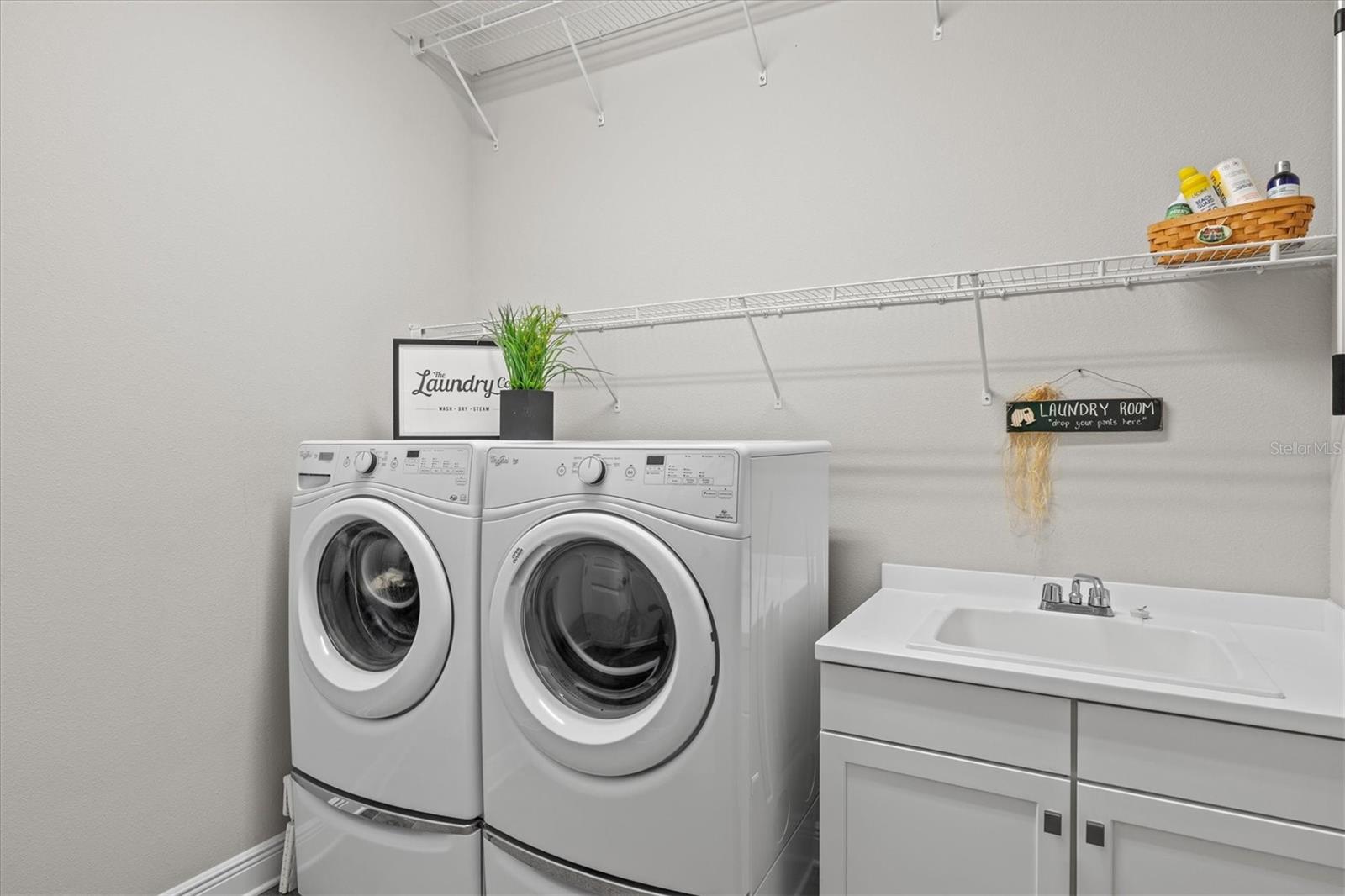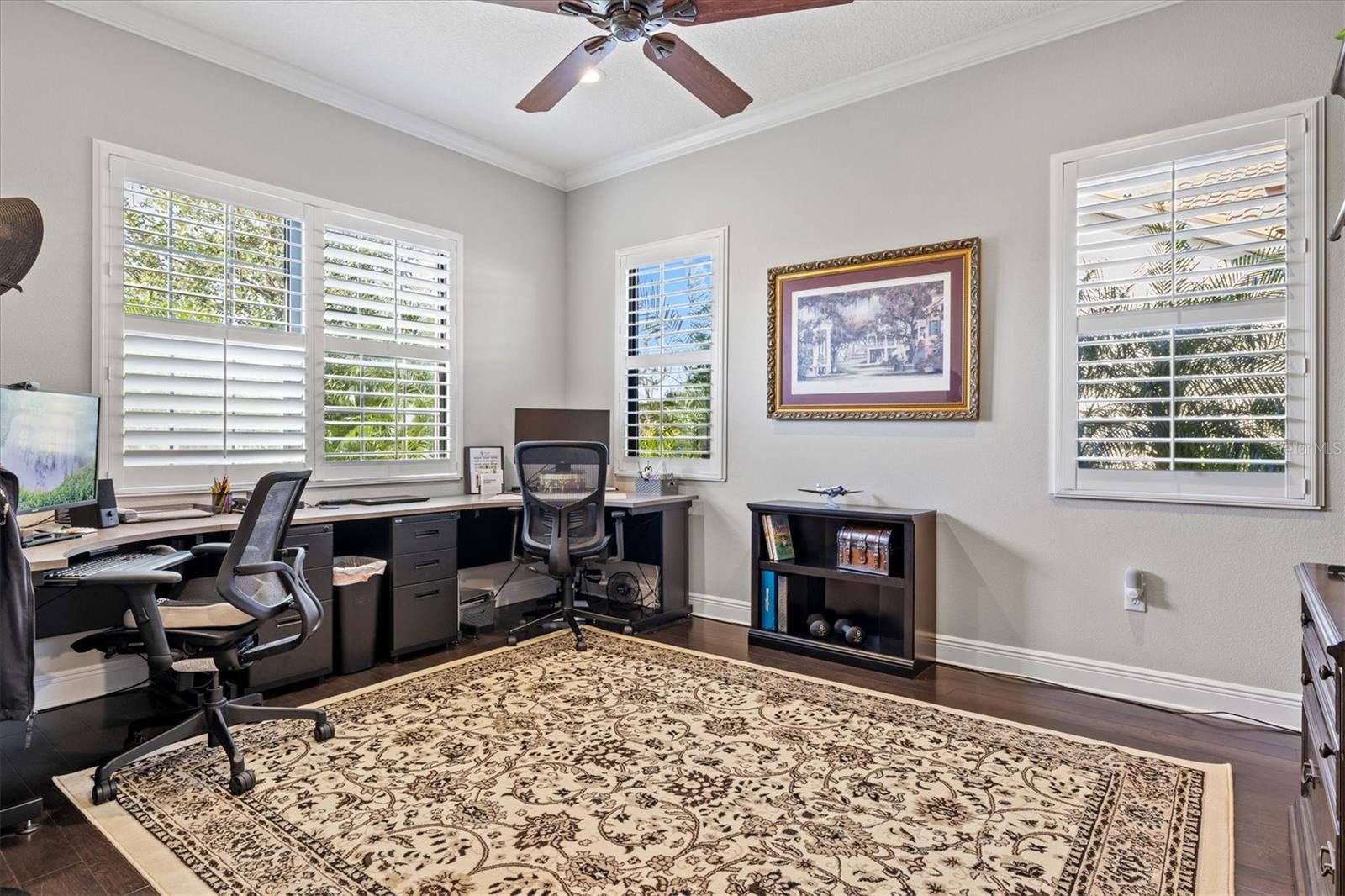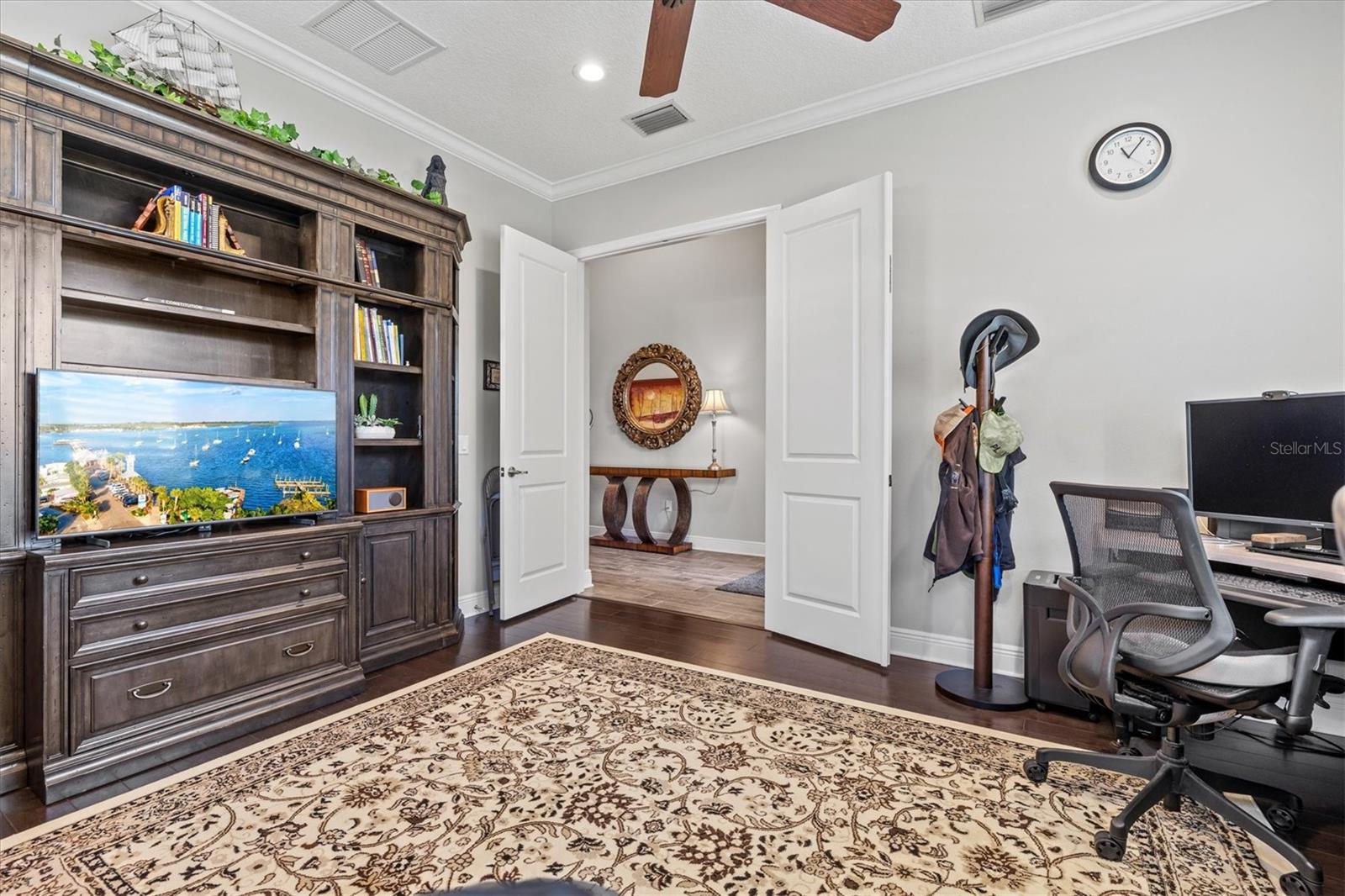The luxurious primary suite is a private sanctuary, featuring dual walk-in closets and a spa-inspired en suite bath with double vanities, a walk-in tiled shower, and a separate water closet. A private office/den with French doors, engineered hardwood floors, and recessed lighting offers flexibility for remote work or quiet retreats. Additional bedrooms include a spacious guest suite with an en suite bath and two more bedrooms thoughtfully positioned for privacy, all supported by a beautifully appointed laundry room with custom cabinetry and sink.