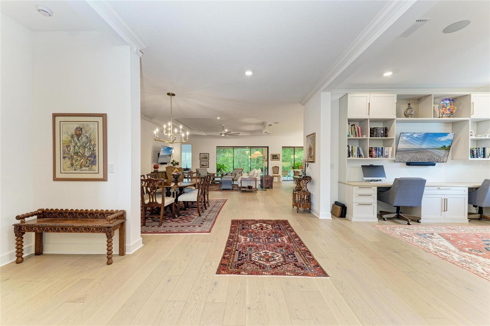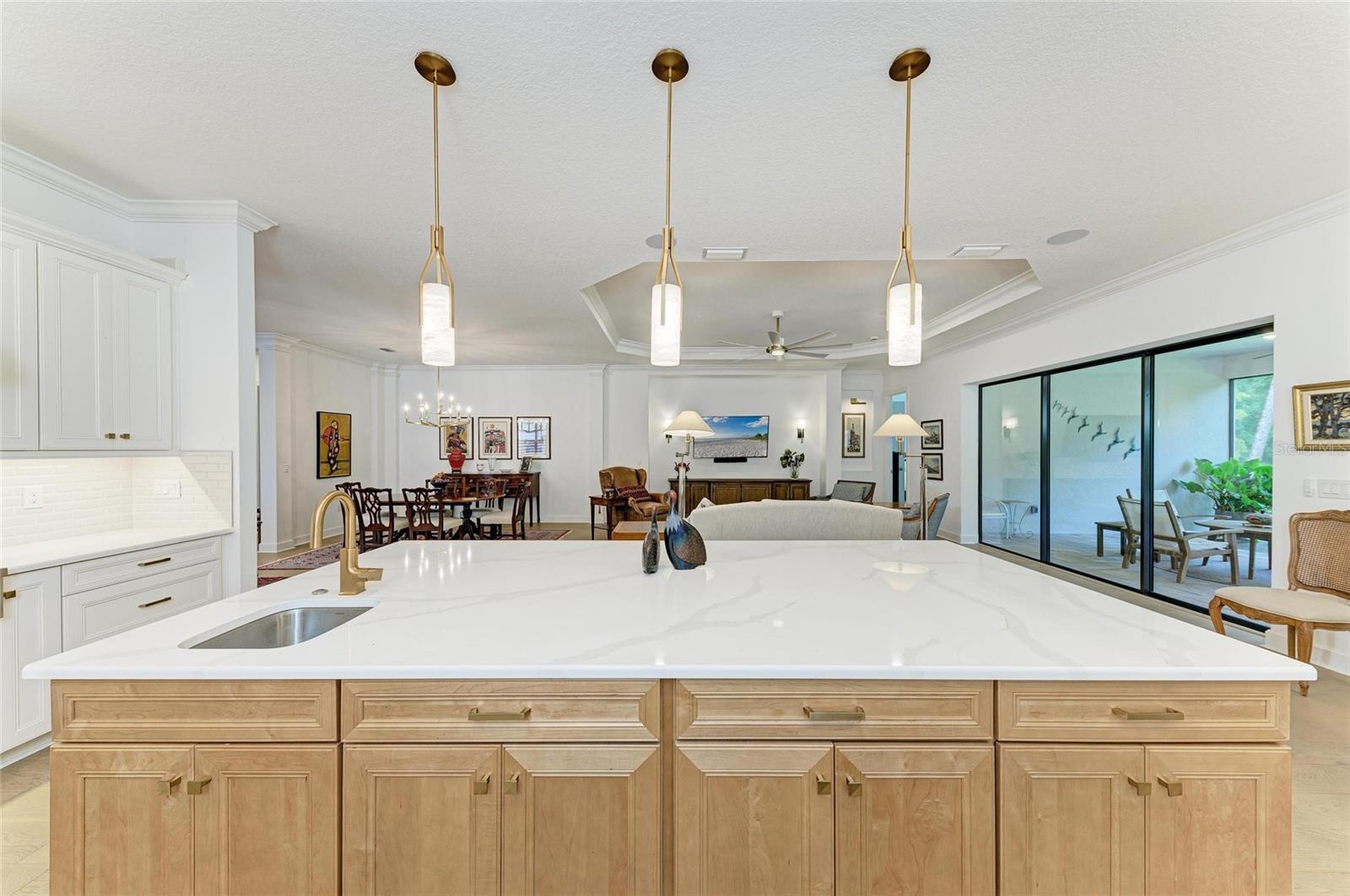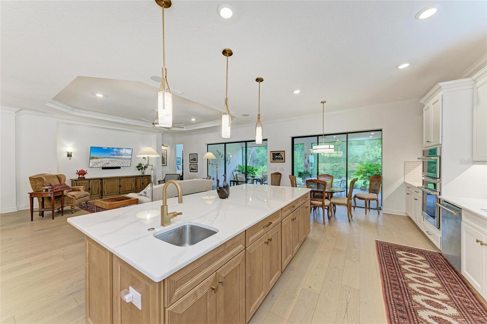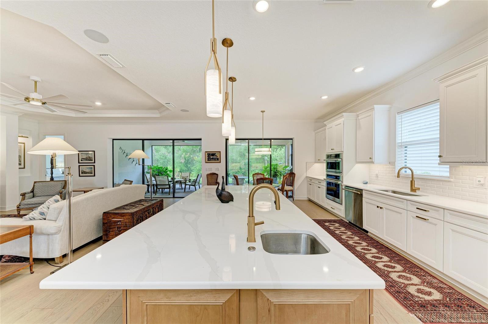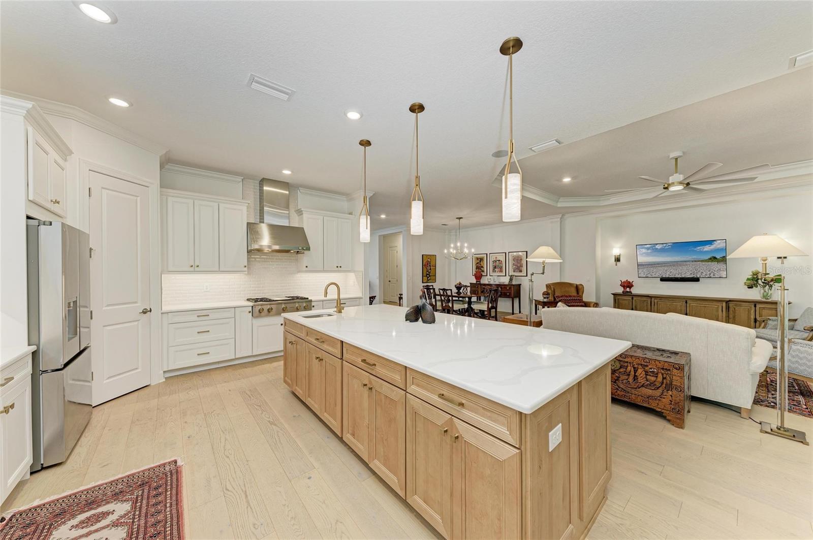 The gourmet kitchen is a culinary dream, boasting quartz countertops, stainless steel appliances, a smart faucet, and a large kitchen island with an additional prep sink. The natural gas range is complemented by an upgraded vent hood, while designer plumbing fixtures elevate the entire space. The casual dining extension flows effortlessly into the great room—enhanced by a high-quality speaker system that continues into the office and rear lanai, perfect for entertaining or relaxing in style.