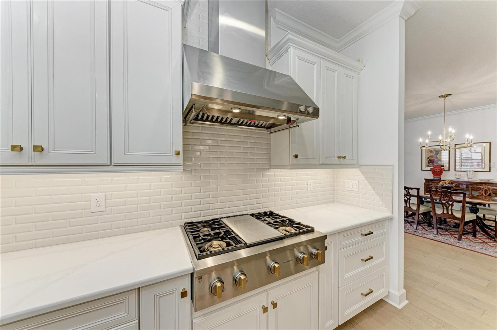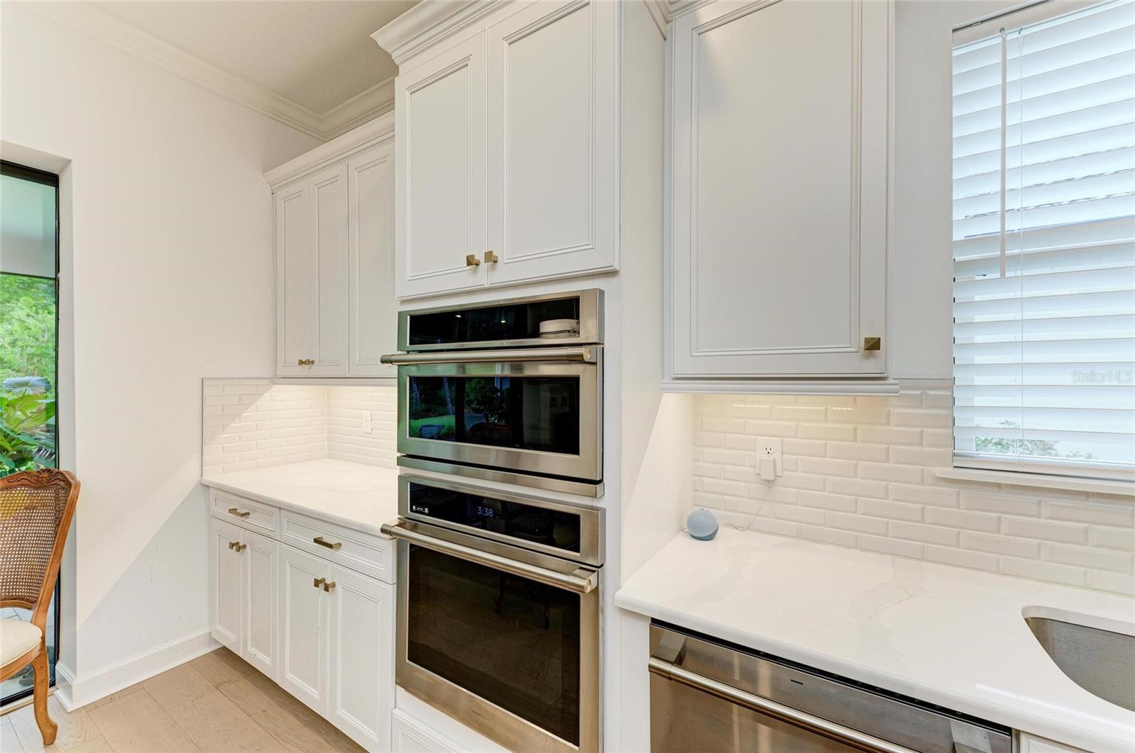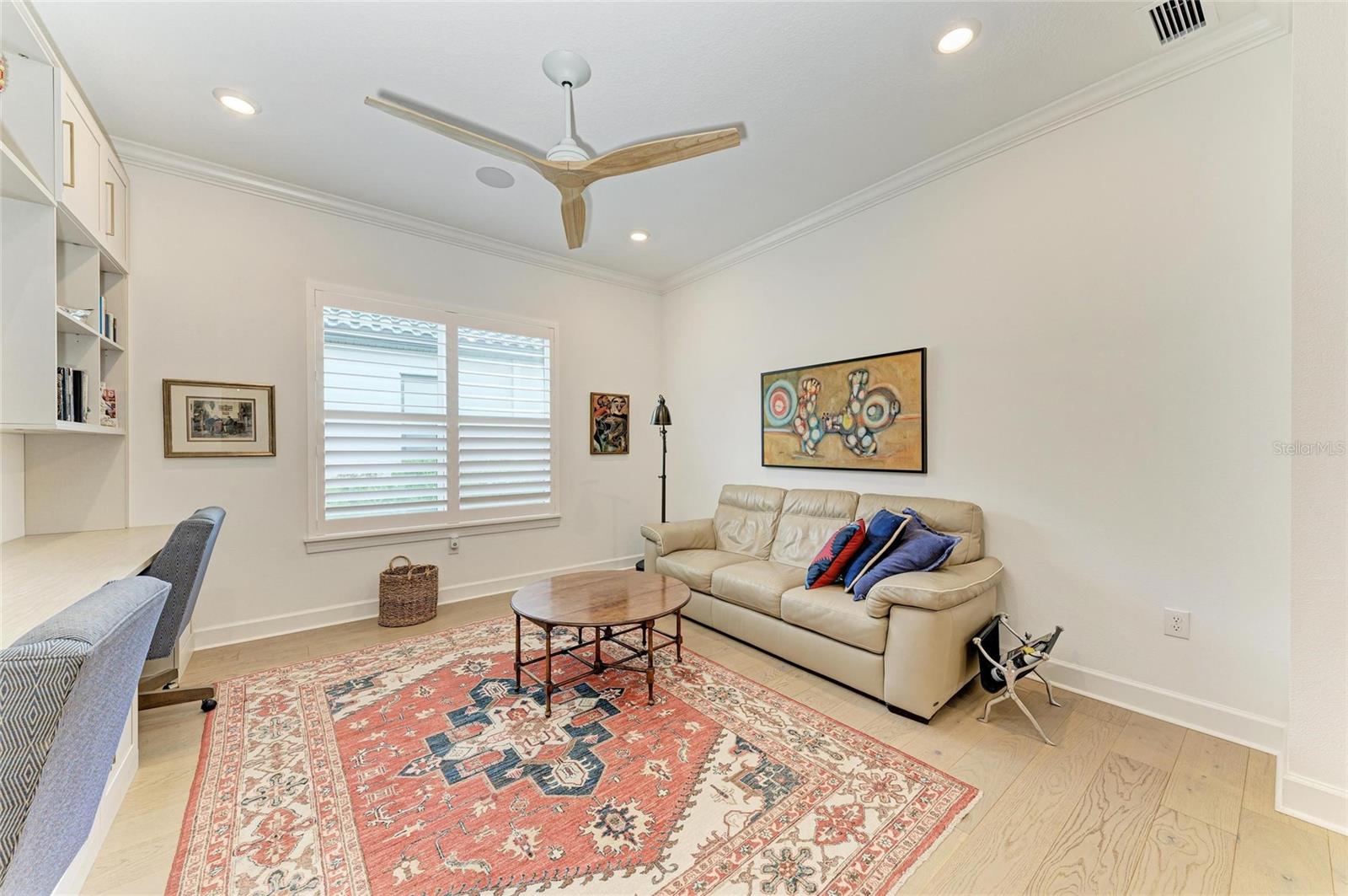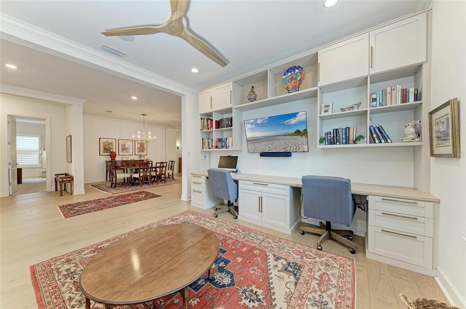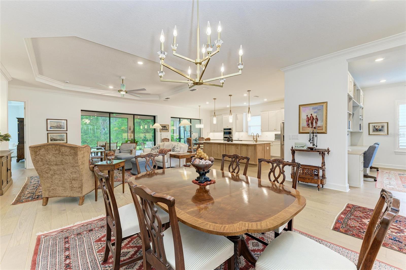 The gourmet kitchen is a culinary dream, boasting quartz countertops, stainless steel appliances, a smart faucet, and a large kitchen island with an additional prep sink. The natural gas range is complemented by an upgraded vent hood, while designer plumbing fixtures elevate the entire space. The casual dining extension flows effortlessly into the great room—enhanced by a high-quality speaker system that continues into the office and rear lanai, perfect for entertaining or relaxing in style.