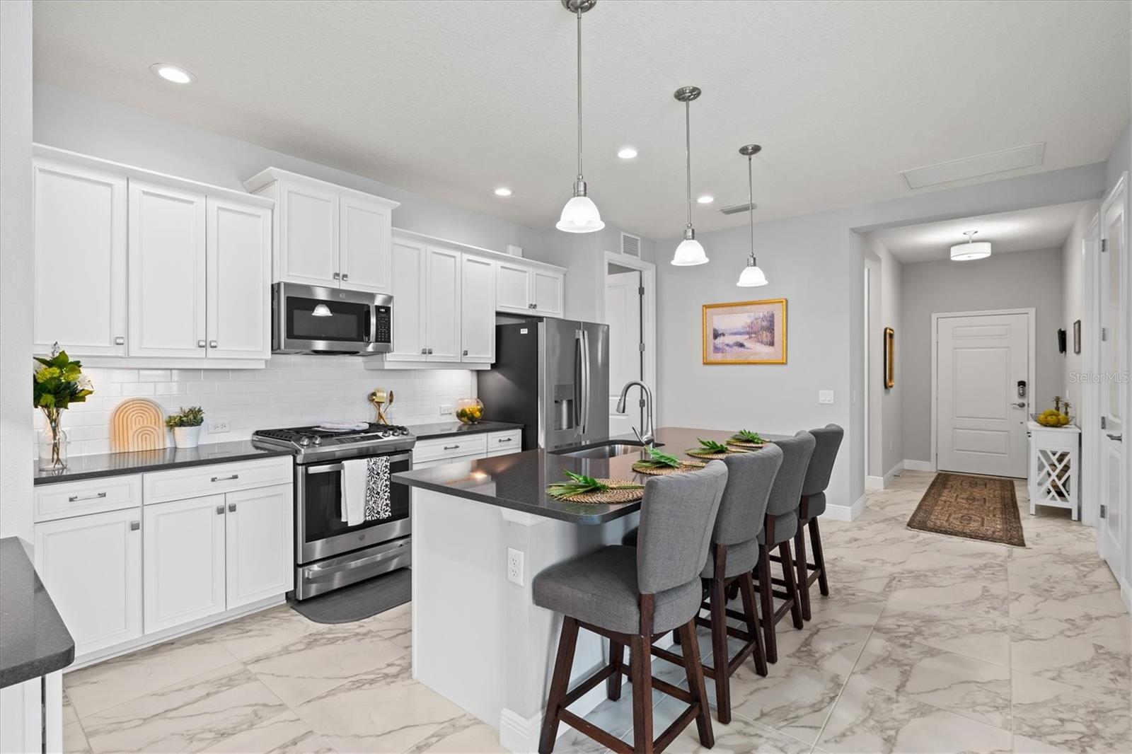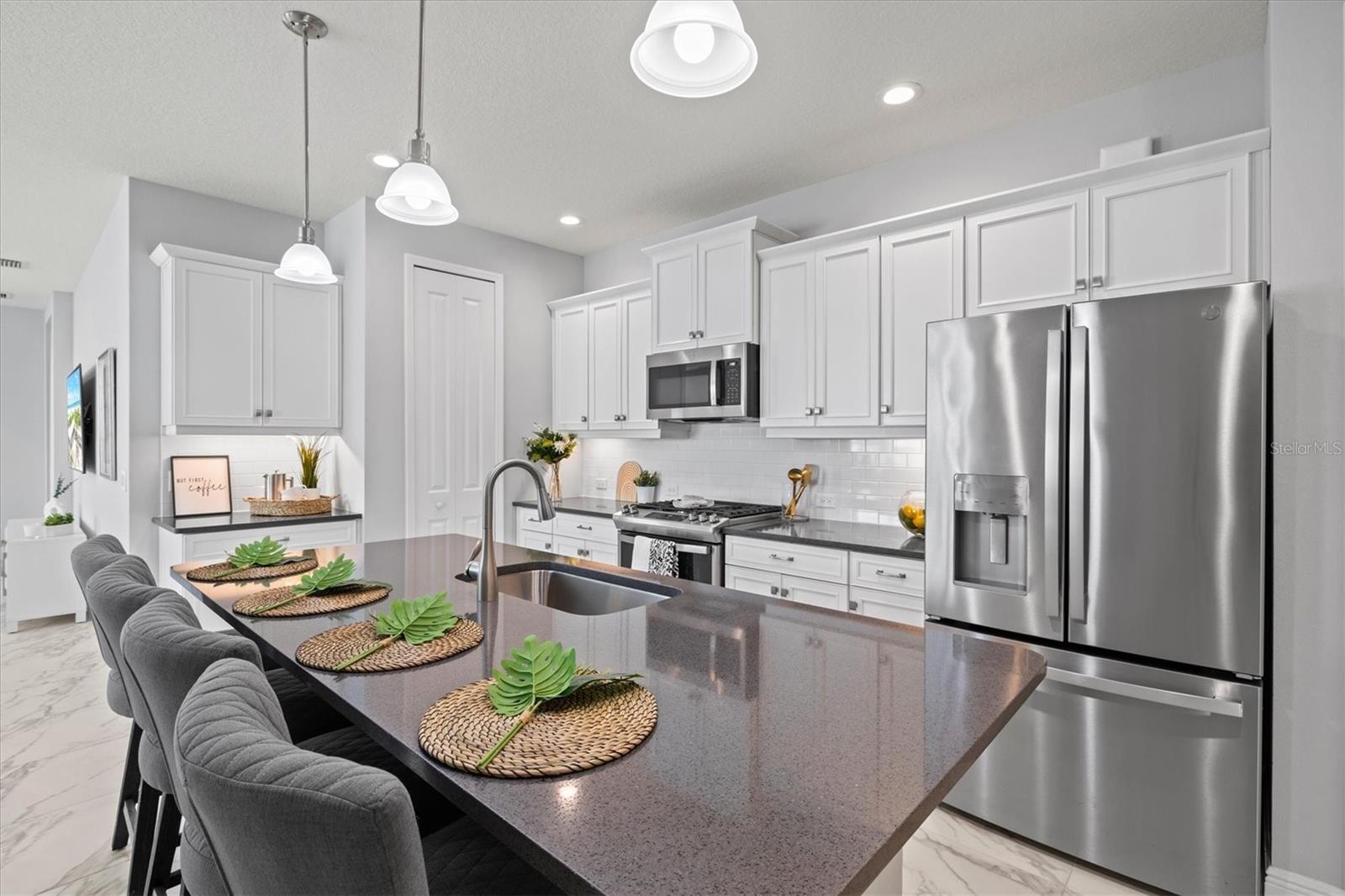 Step inside to discover a bright, open-concept layout where natural light pours in, creating a spacious and inviting ambiance. The well-appointed kitchen is a stunning focal point, featuring quartz countertops, sleek white cabinetry, a large island with seating, and premium stainless steel appliances. Whether you're hosting a dinner party or enjoying a peaceful morning coffee, this kitchen is as functional as it is stylish.