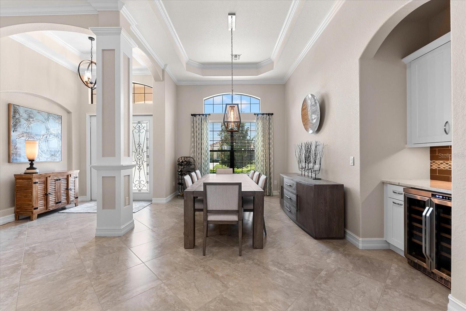 The completely redesigned chef’s kitchen is a showstopper—featuring an expansive island with stained cabinetry with pull out trays, quartz countertops, soft-close drawers and doors, GE Profile stainless appliances, Z-line 36” six-burner gas cooktop, and a large walk-in pantry with wood shelving and spice racks. Under-cabinet lighting and outlets highlight the clean, modern backsplash. The elegant dining area, custom bar with wine fridge, and oversized living spaces make this home perfect for entertaining.