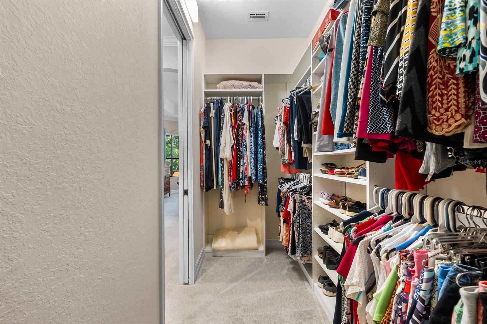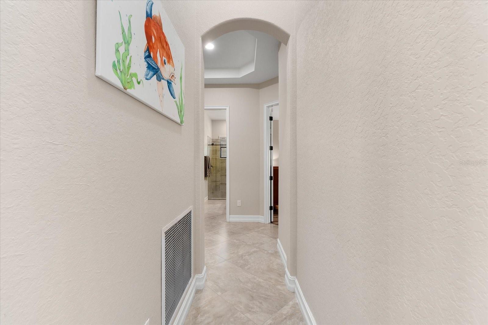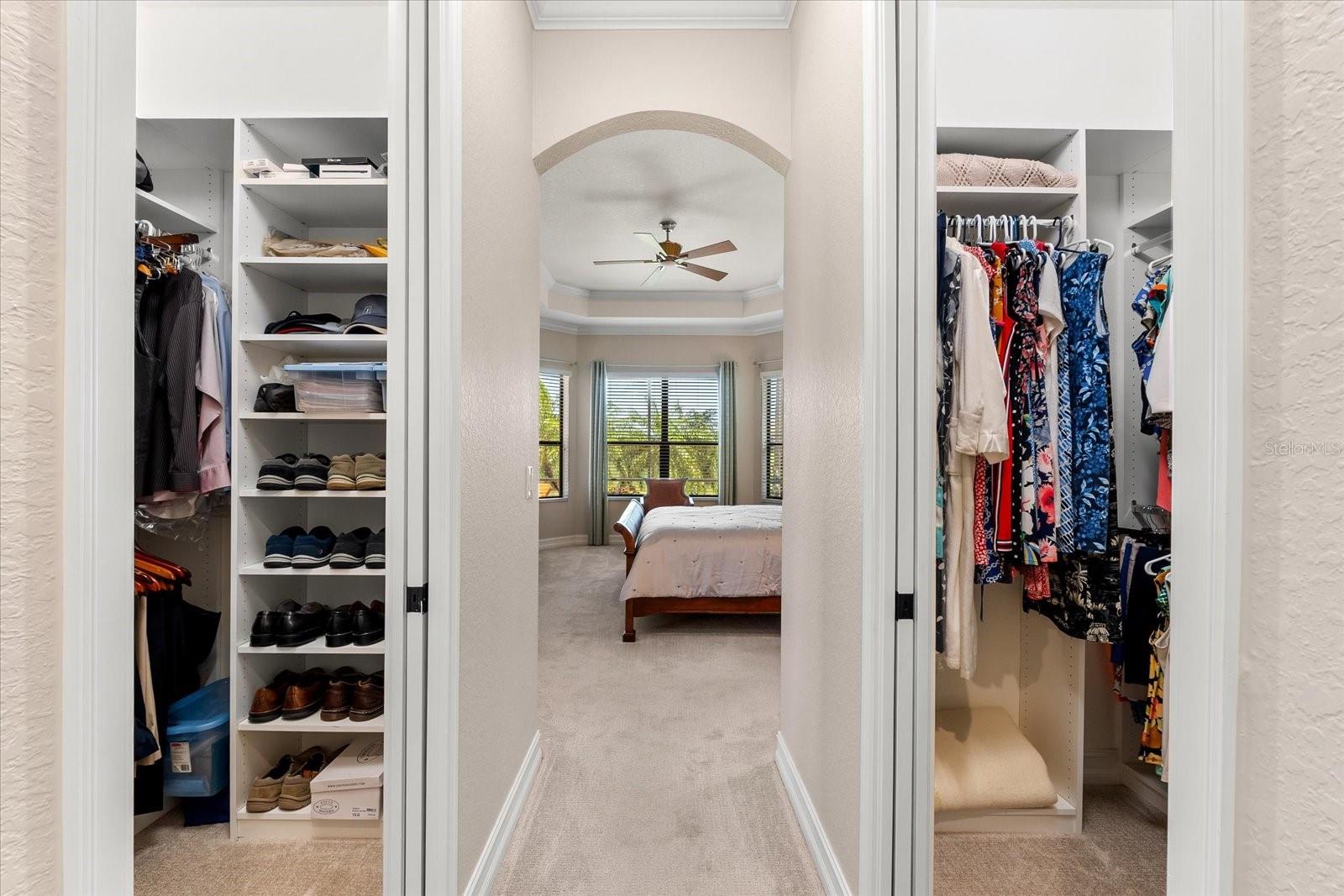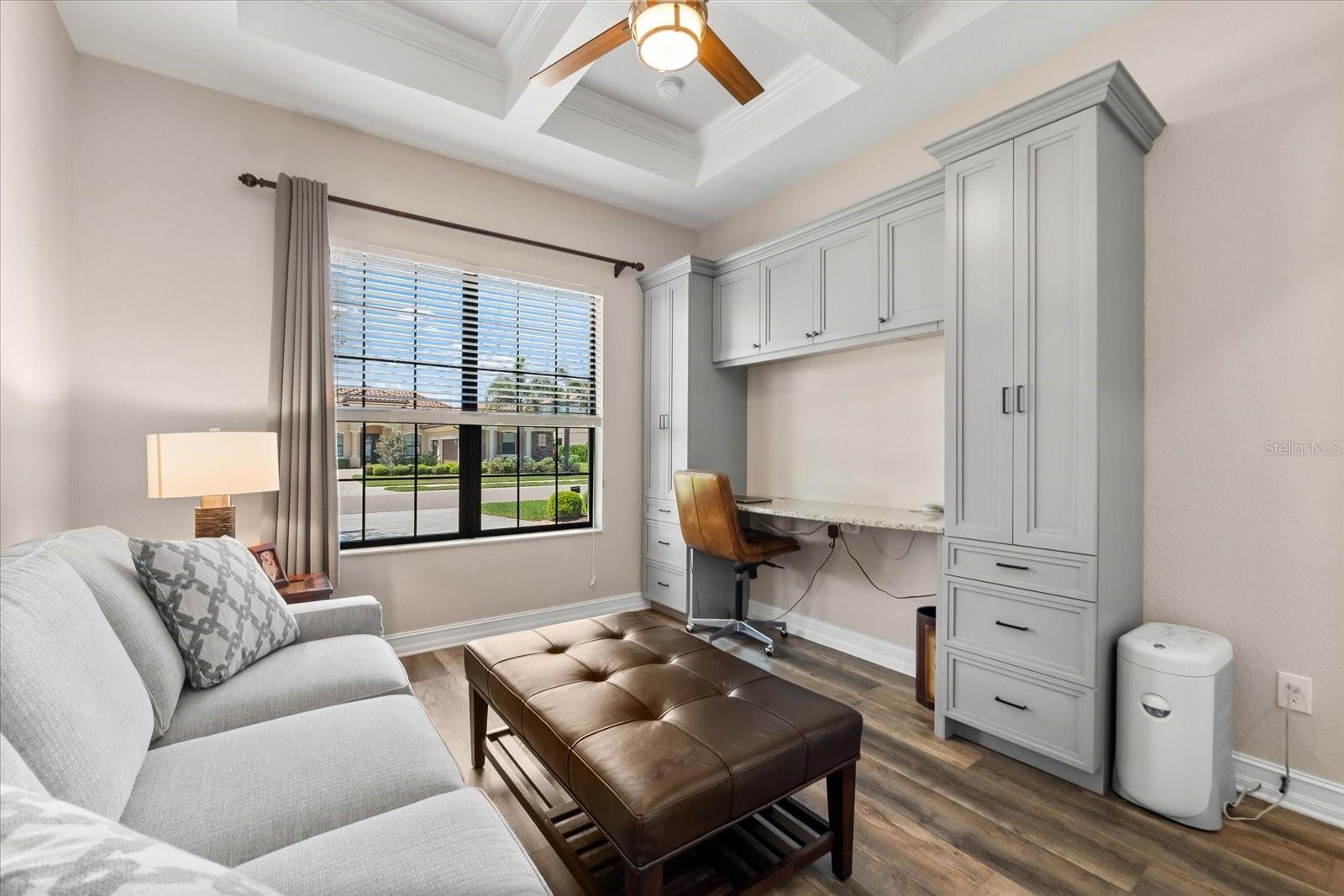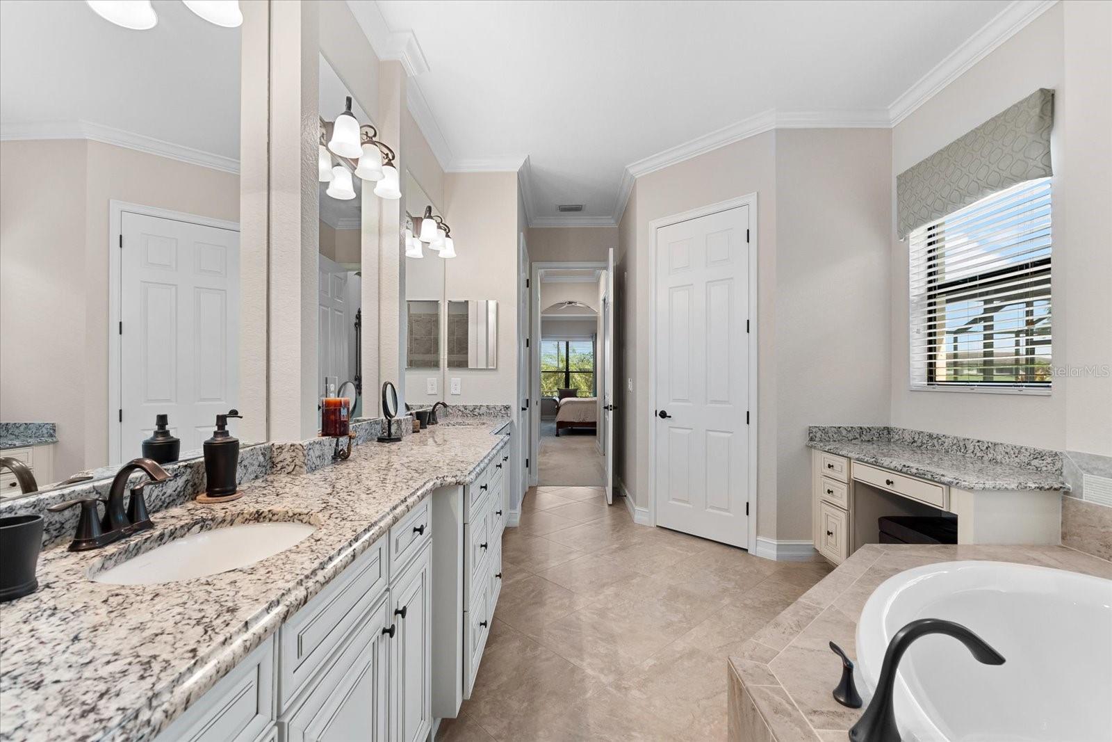 The open split floor plan features 3 spacious bedrooms with 3 full ensuite baths, and a versatile office/den with French doors, built-in cabinetry, and the potential to be converted into a 4th bedroom with a walk-in closet. The owner’s suite offers a serene sitting area with stunning pond and golf course views, dual walk-in closets with custom interiors, a spa-like ensuite with dual vanities, a makeup desk, and a frameless shower with dual shower heads.