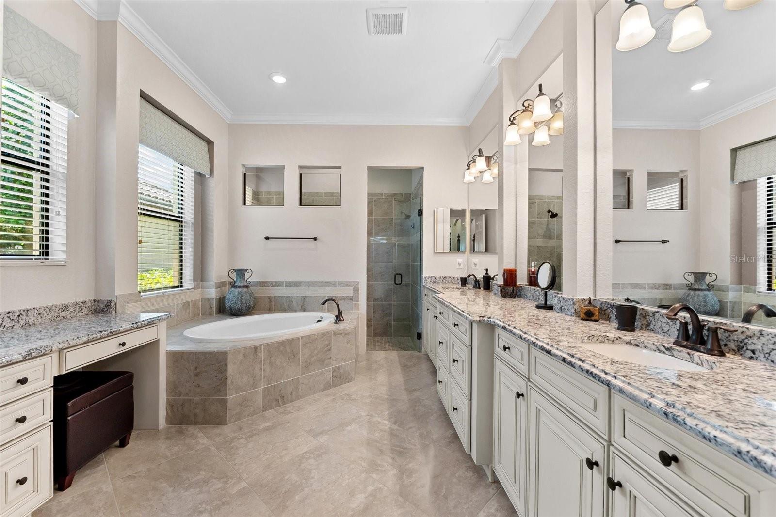 Additional features include tray ceilings, designer lighting and fans, crown molding, hurricane-impact windows and sliders, and an oversized garage with overhead storage rack. The separate laundry room features upper and lower cabinetry, granite counters, a utility sink, and washer/dryer (LG brand) that convey with the home.