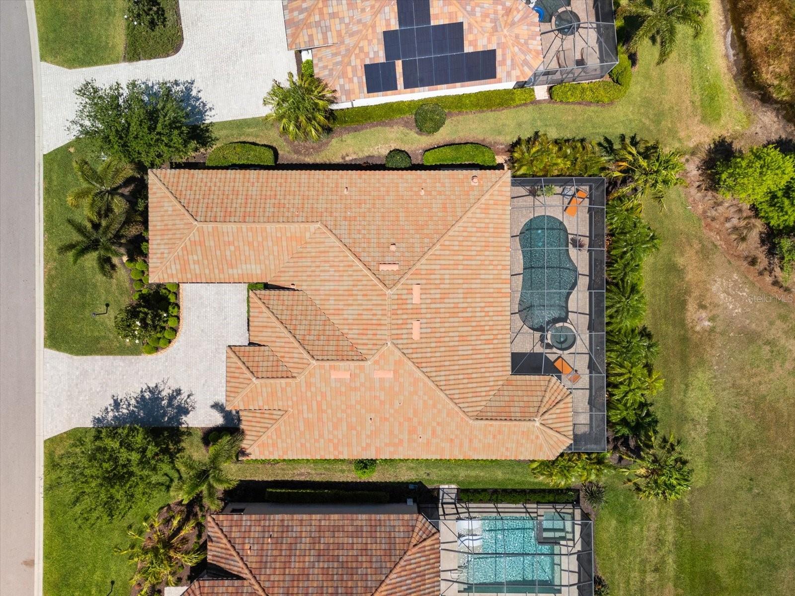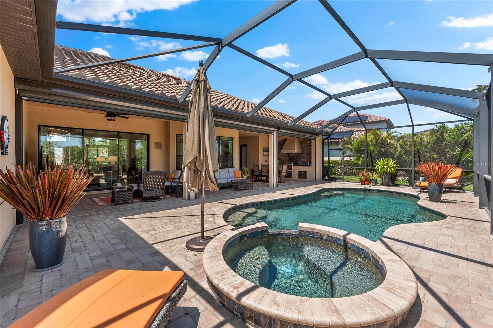 Step outside to your own private oasis with an oversized lanai, saltwater pool and spa, new pool pump (2023), and colored LED pool lights (2025). The fully equipped outdoor kitchen includes a gas grill and refrigerator—perfect for alfresco dining. Enjoy morning coffee or evening cocktails while watching golfers on the Commander #1 fairway or observing the local wildlife around the tranquil pond. Motorized hurricane Kevlar roll-down screens provide added protection and comfort.