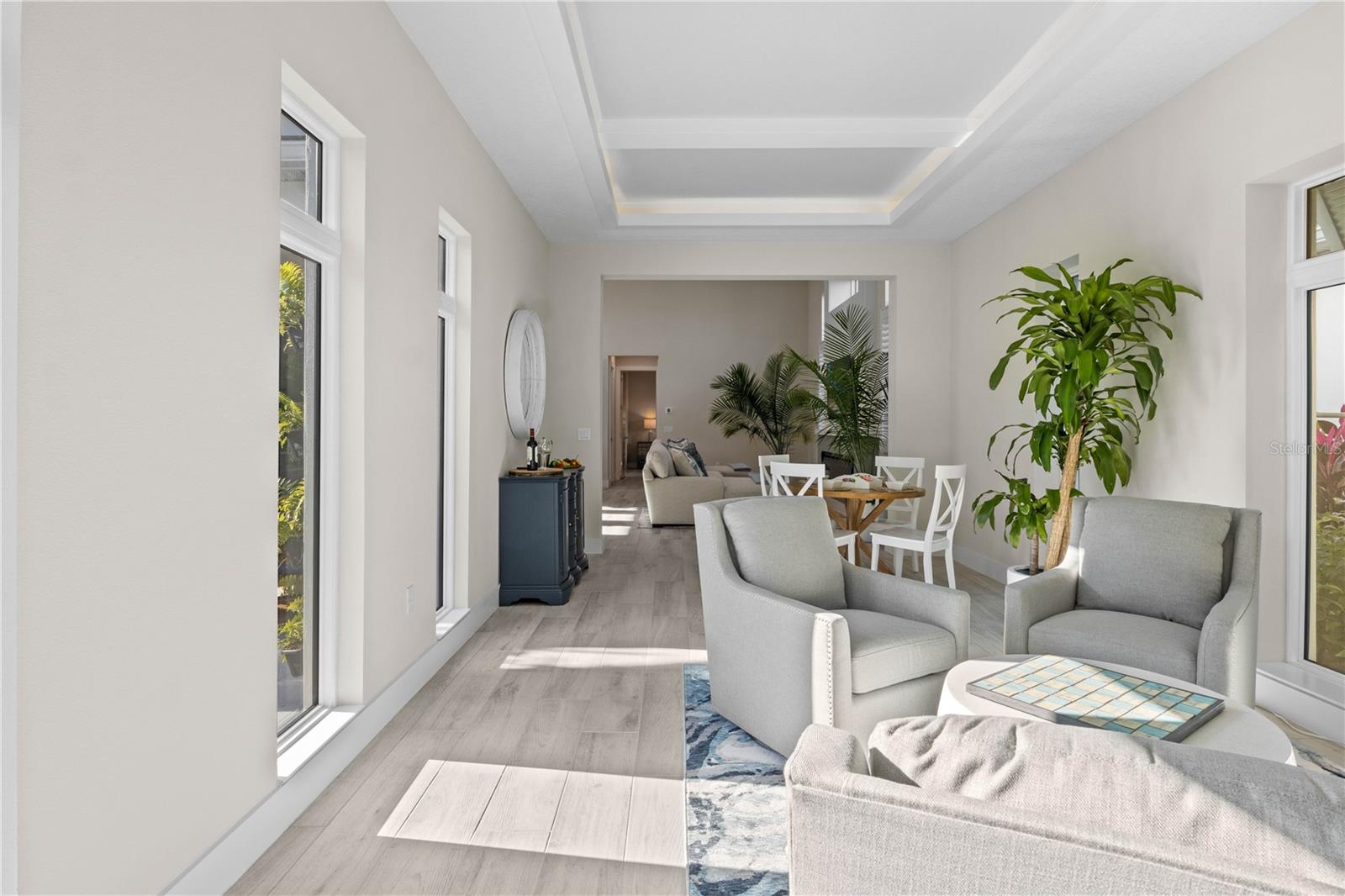Located at 5910 Red Mangrove Lane, this Sea Grape model home is a true gem with numerous upgrades and thoughtful modifications, built for lifelong comfort. Spanning 2,588 sq. ft., this impeccably decorated 3-bedroom, 3-bathroom home is offered fully furnished, making it move-in ready. The home features a perfectly planned layout with the master suite overlooking a tranquil courtyard. The luxurious primary bathroom boasts a multi-head shower, dual sinks, built-in shelving, and a private water closet. Wake up and cool off in your heated, saltwater pool with a waterfall and chiller—perfect for Florida summers!