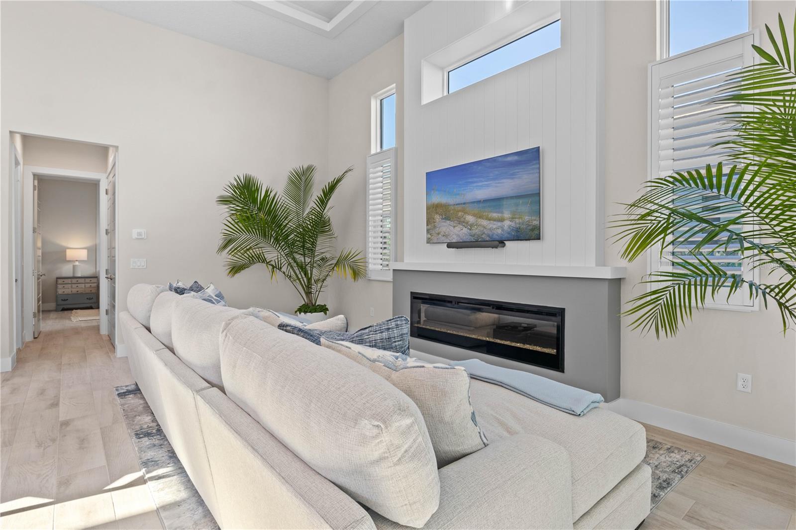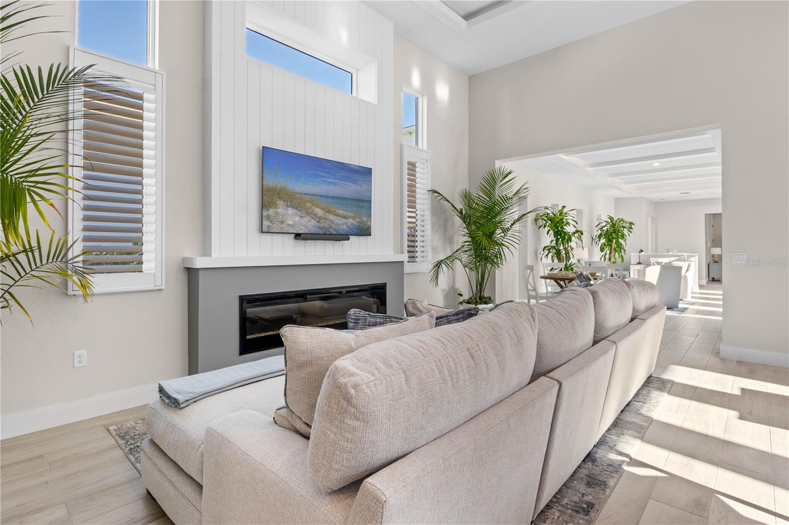 Inside, you'll find a chef’s dream kitchen—spacious, with dual sinks, double wall ovens, an overhead pot rack, a 36" gas stove, and a 48" Dacor refrigerator. Entertain effortlessly with two beverage coolers, open maple butcher block shelving, and a second island perfect for dining or hosting parties. The adjacent living area features a large electric fireplace, creating the perfect ambiance for gatherings.