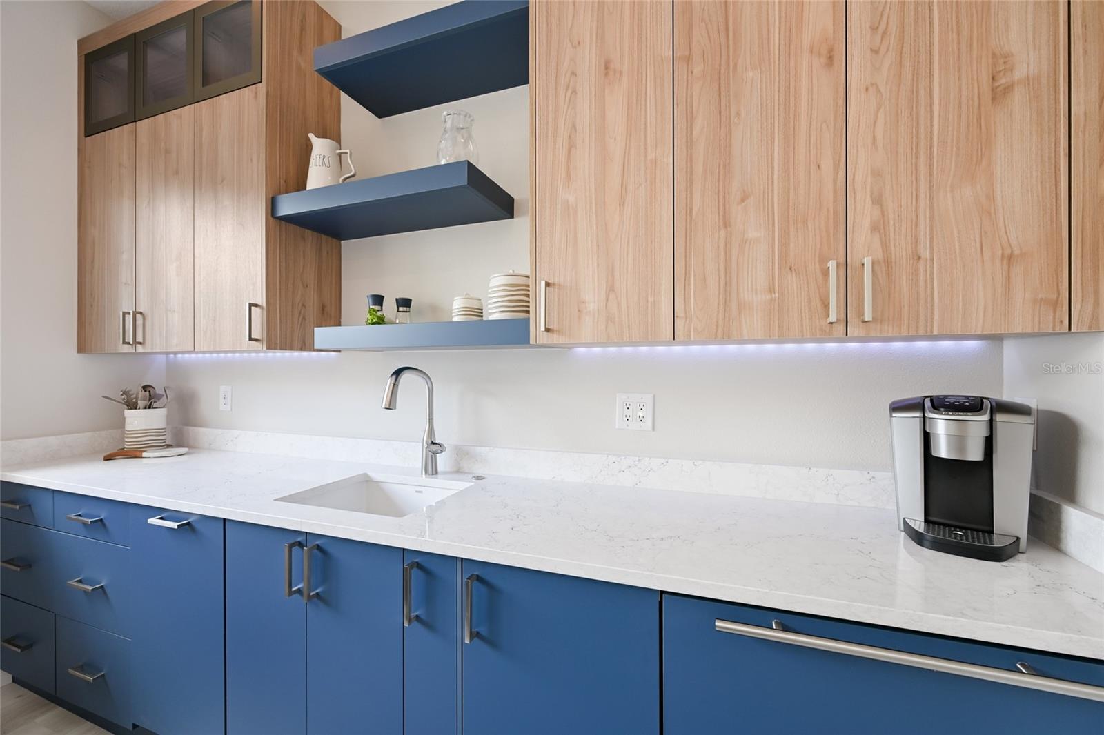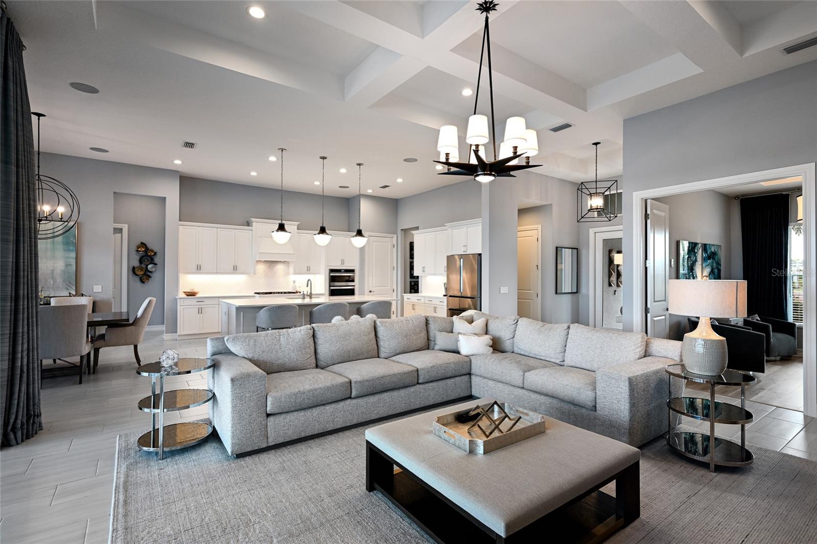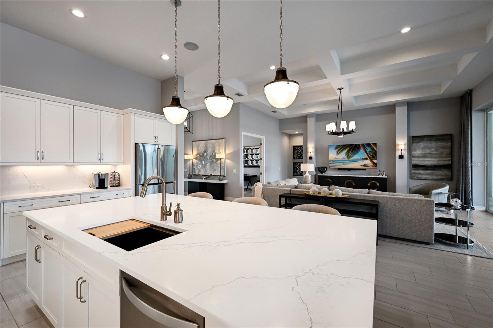 The expansive outdoor retreat elevates with a panoramic screened lanai, extensive open and under cover spaces, soaring ceilings, full summer kitchen, PebbleTec heated saltwater pool/spa with sun shelf, and an inviting gas fireplace. Ten foot impact disappearing glass sliders seamlessly connect the outdoor oasis to a luxuriantly welcoming great room, dining area and gourmet kitchen crowned with coffered ceiling, accent wall, and designer light fixtures creating a sophisticated open continuity of space. Off the dining room, the gourmet kitchen further accentuates with wood cabinetry, soft-close dove-tail drawers, newly installed quartz counters and backsplash, stainless steel appliances, wine fridge, and walk-in pantry. The residence also offers an impressive office behind double-entry doors just off the entry foyer.