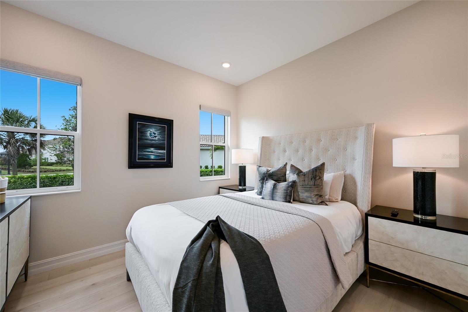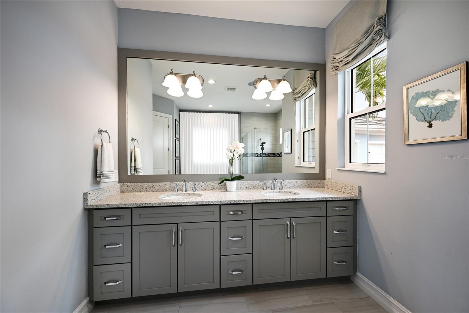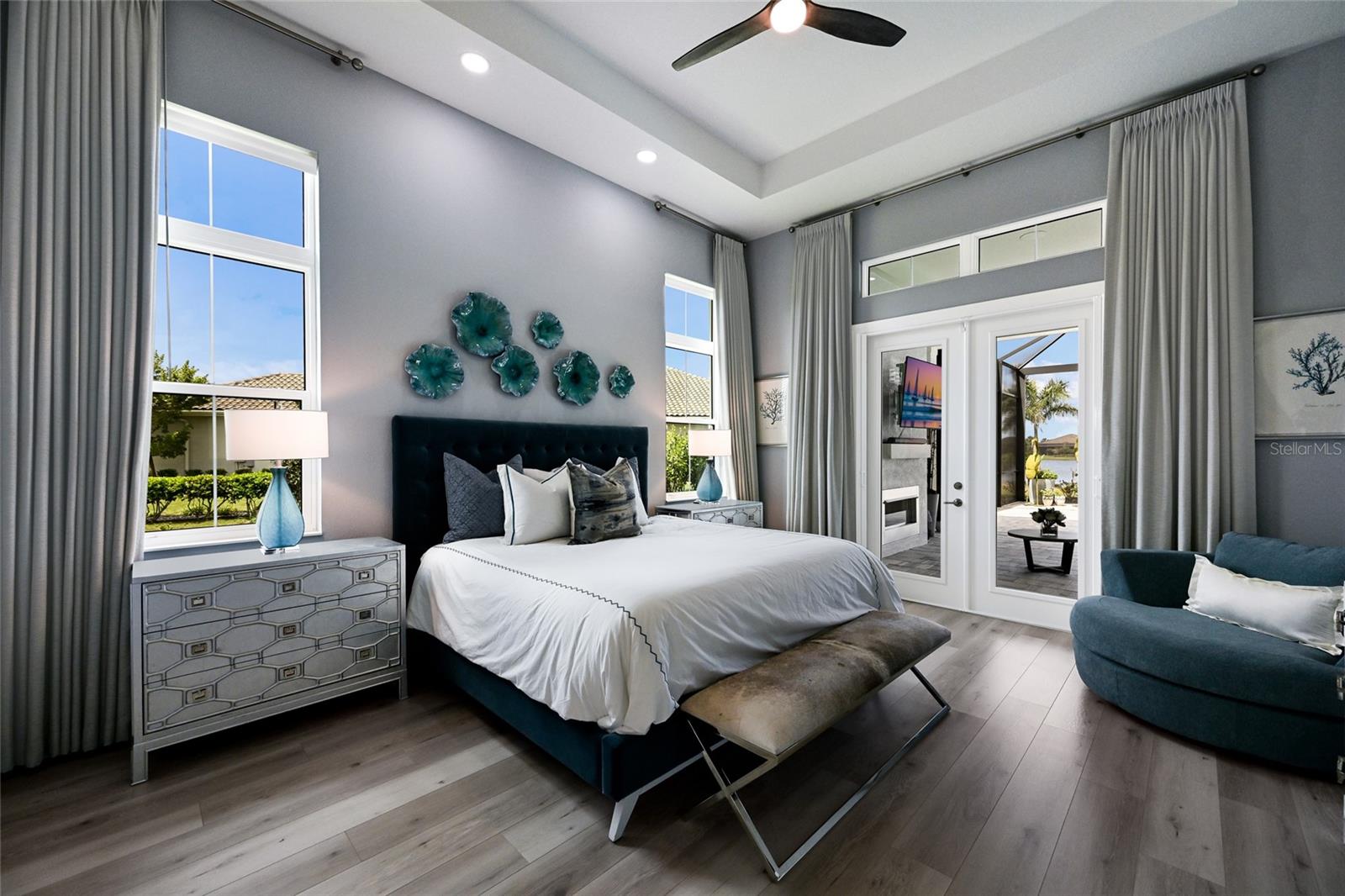 The owner’s quarters positioned on a private wing in the main residence offers double tray ceilings, large scale windows, direct lanai access, two oversized walk-in customized closets, and a spa-like bath with dual station vanity, an oversized shower with designer tile, a large soaking tub, and separate water closet. There are two additional guest suites in the main house, each on a separate wings of the home generous in size with luxury plank vinyl flooring, one offering an ensuite full bath, while the third guest room is just off the home’s pool bath bath.