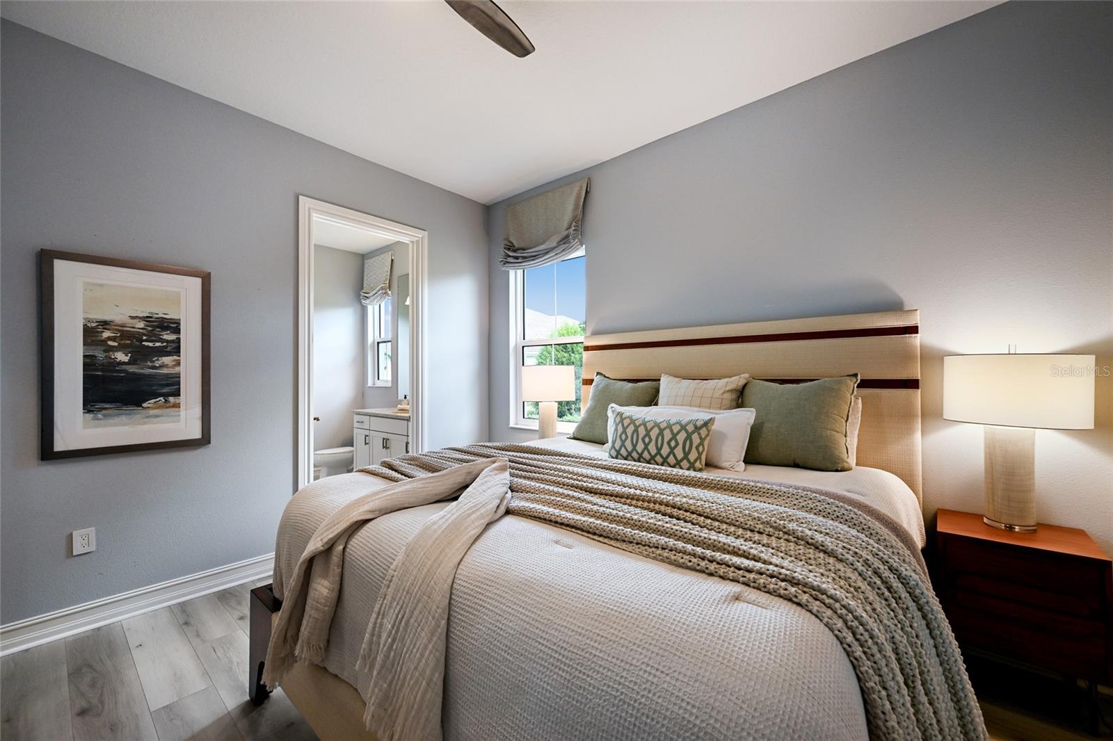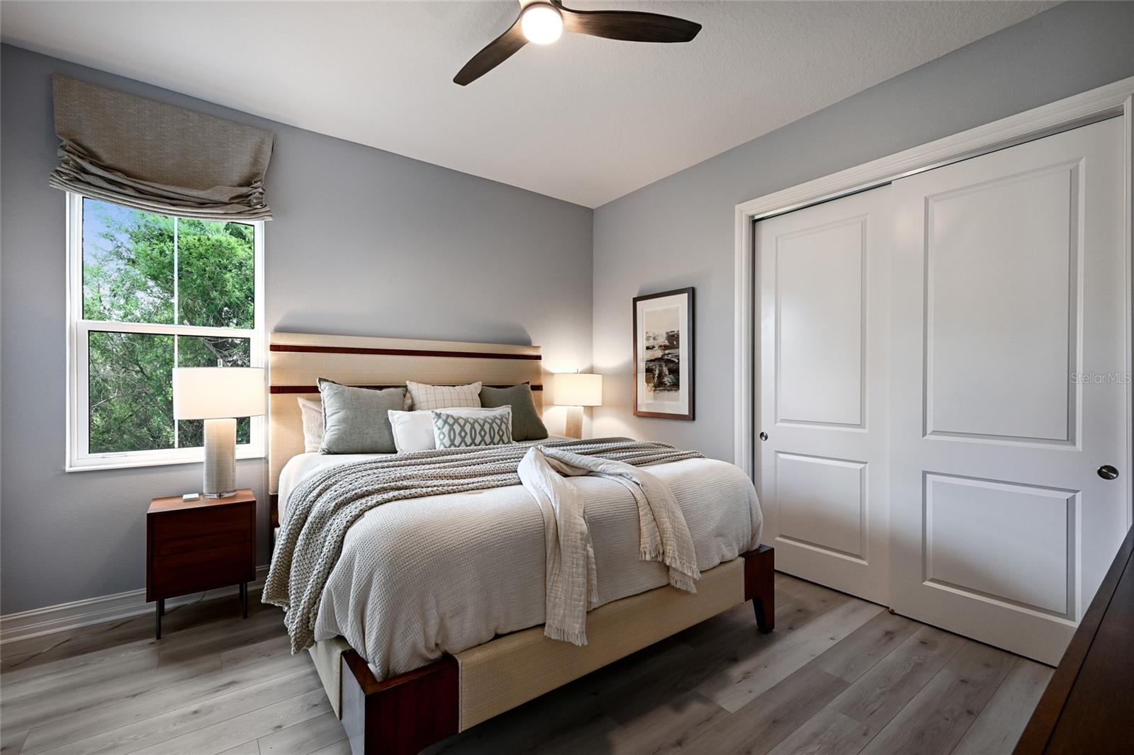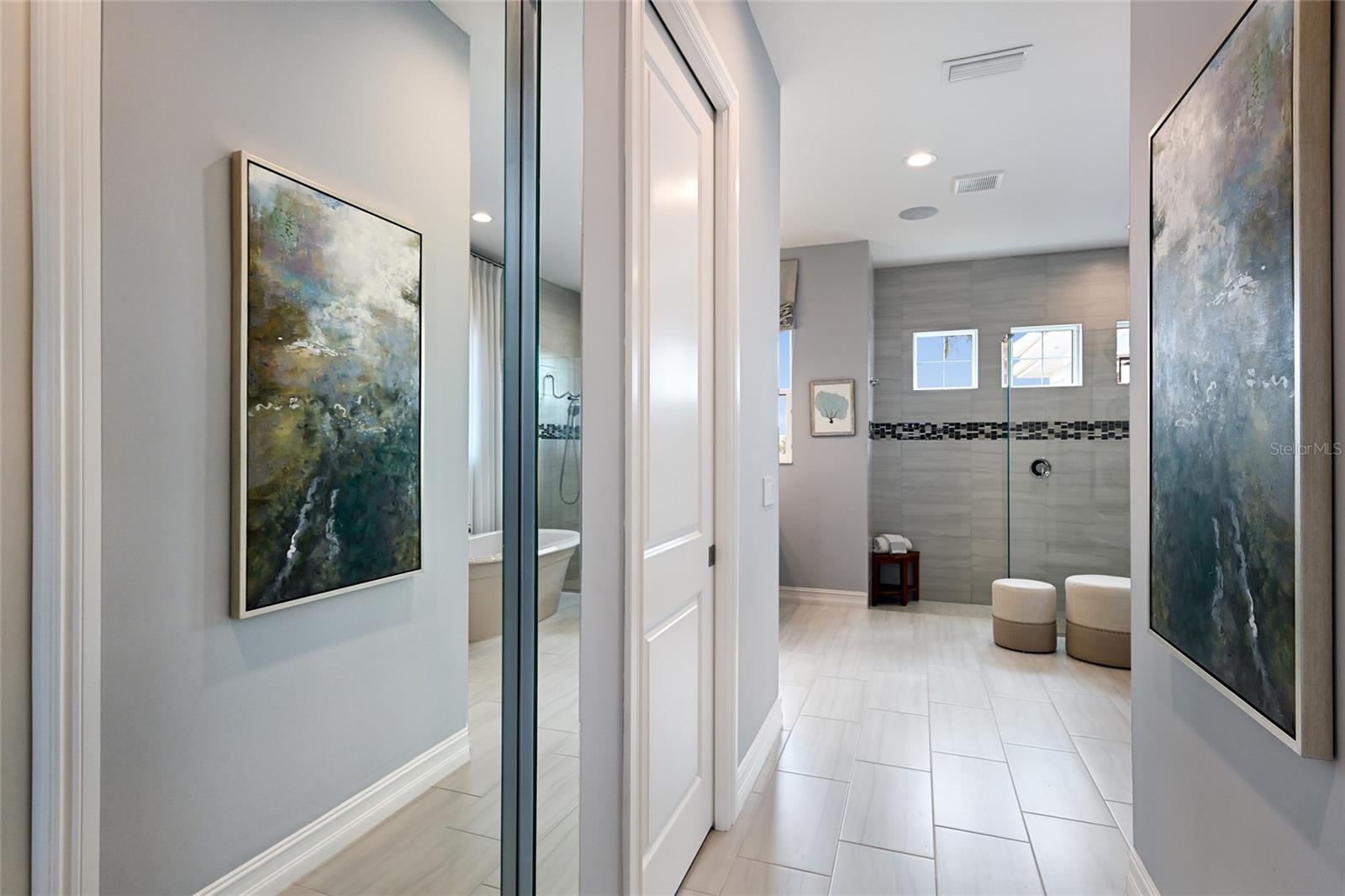 The owner’s quarters positioned on a private wing in the main residence offers double tray ceilings, large scale windows, direct lanai access, two oversized walk-in customized closets, and a spa-like bath with dual station vanity, an oversized shower with designer tile, a large soaking tub, and separate water closet. There are two additional guest suites in the main house, each on a separate wings of the home generous in size with luxury plank vinyl flooring, one offering an ensuite full bath, while the third guest room is just off the home’s pool bath bath.