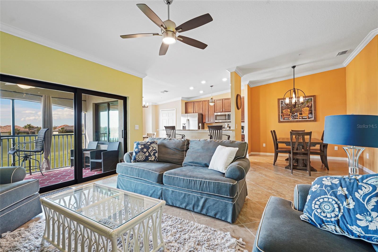 Step inside and enjoy an open-concept layout with expansive panoramic golf course views and two screened lanais—ideal for savoring morning coffee or evening sunsets. The chef’s kitchen is designed for both functionality and style, featuring solid wood cabinetry, granite countertops, stainless steel appliances, and a spacious center island with counter-height seating.
