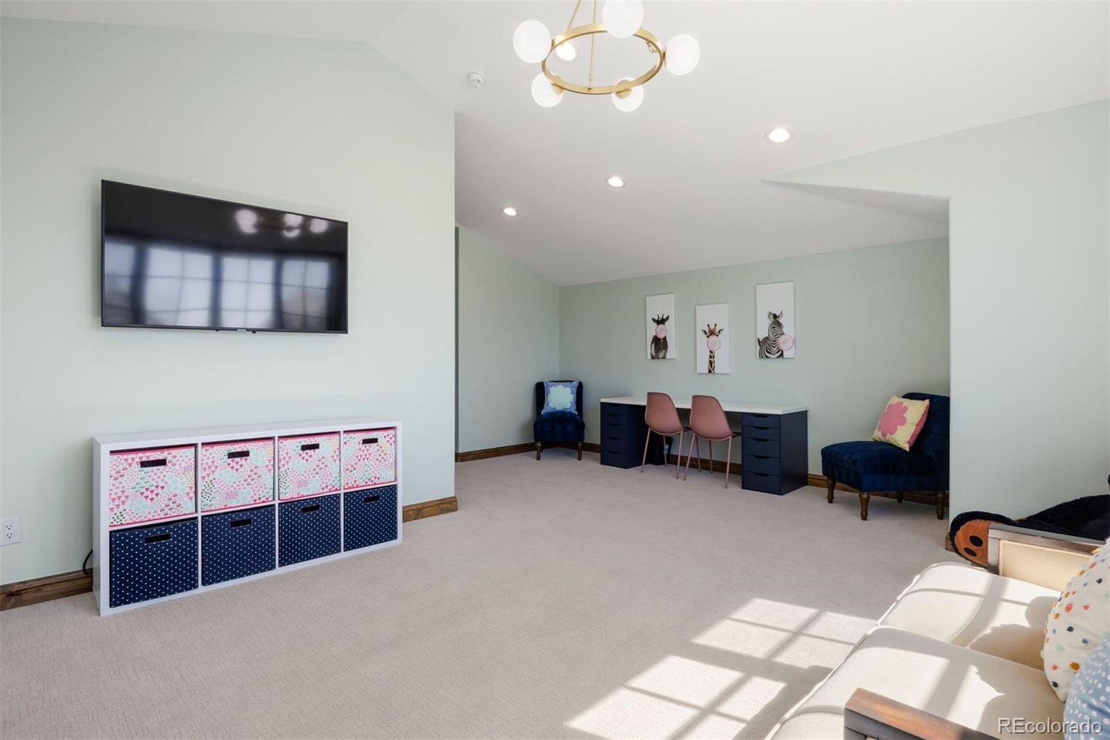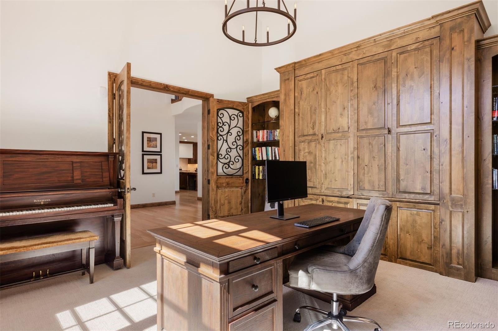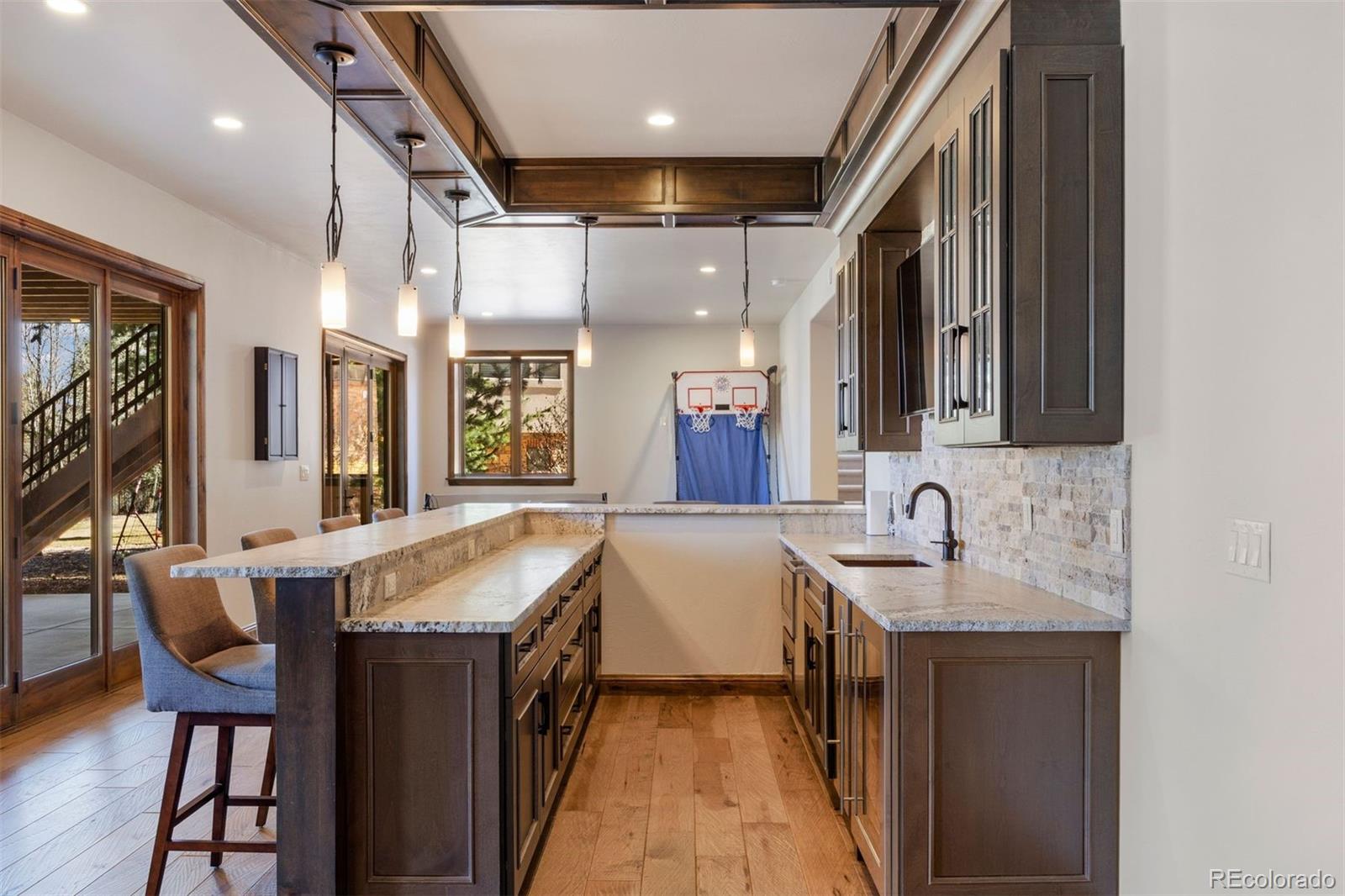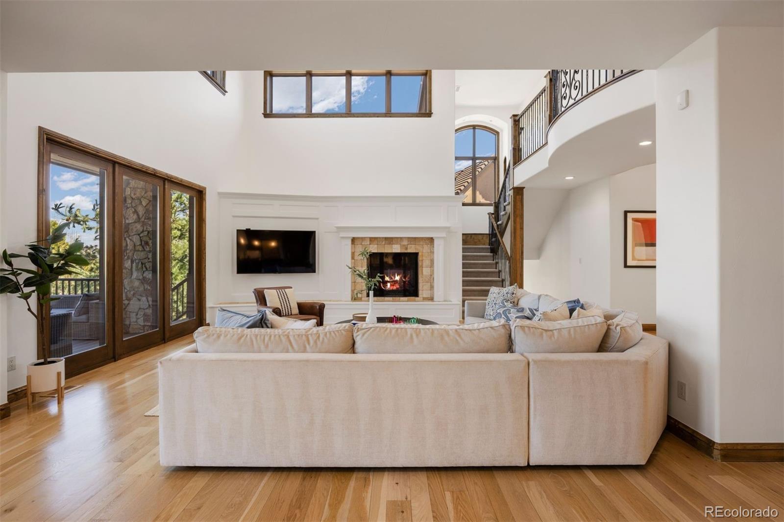Set within the coveted Amber Ridge community, this 6 bedroom | 5 bathroom residence is a rare combination of thoughtful updates, inviting gathering spaces, and one of the largest flat back yards in the neighborhood - offering TRUE Colorado indoor-outdoor living. From the moment you arrive, you feel a sense of refinement with updated paint throughout, wide-plank hardwood floors, and new carpet. Creating a fresh, cohesive aesthetic, natural light flows across all interior rooms, enhancing both the scale and warmth of each space. The main level unfolds with well-balanced living and entertaining options, including a great room with fireplace, large dining room, and a spacious kitchen with updated tile backsplash, Dacor appliances, center island, and 2 walk-in pantries - one fully customized. A stately private office with additional fireplace, laundry room, mud room, powder room, and 3-car garage complete the well-planned main level. Upstairs, the primary suite features vaulted ceilings, a sitting area, 5-piece bathroom, and sizable closet. Four additional bedrooms include two connected by a shared bathroom, one currently used as a playroom, and another served by a full bathroom, creating a flexible and functional layout. The walkout basement is simply fantastic, extending the living space with a rec room anchored by a full bar featuring a coffered tray ceiling, as well as a refrigerator, ice maker, dishwasher, and microwave. A separate built-in dining area, family room, and game room make this level perfect for entertaining, while the guest suite and 3/4 bathroom offer room for all. A bonus, outdoor living is showcased by a covered deck with cozy stone fireplace and a built-in stainless steel gas grill. The huge back yard with integrated trampoline offers exceptional space for all day play. Positioned within a sought-after gated setting near top-rated schools, trails, and everyday conveniences, this home checks every box for those seeking to live in Castle Pines.