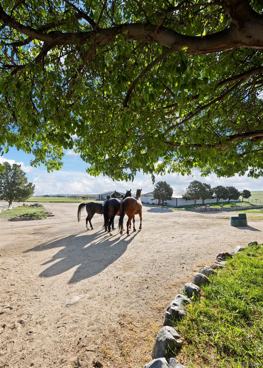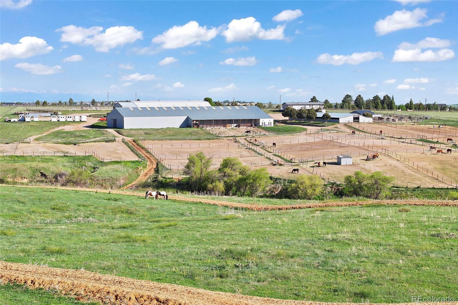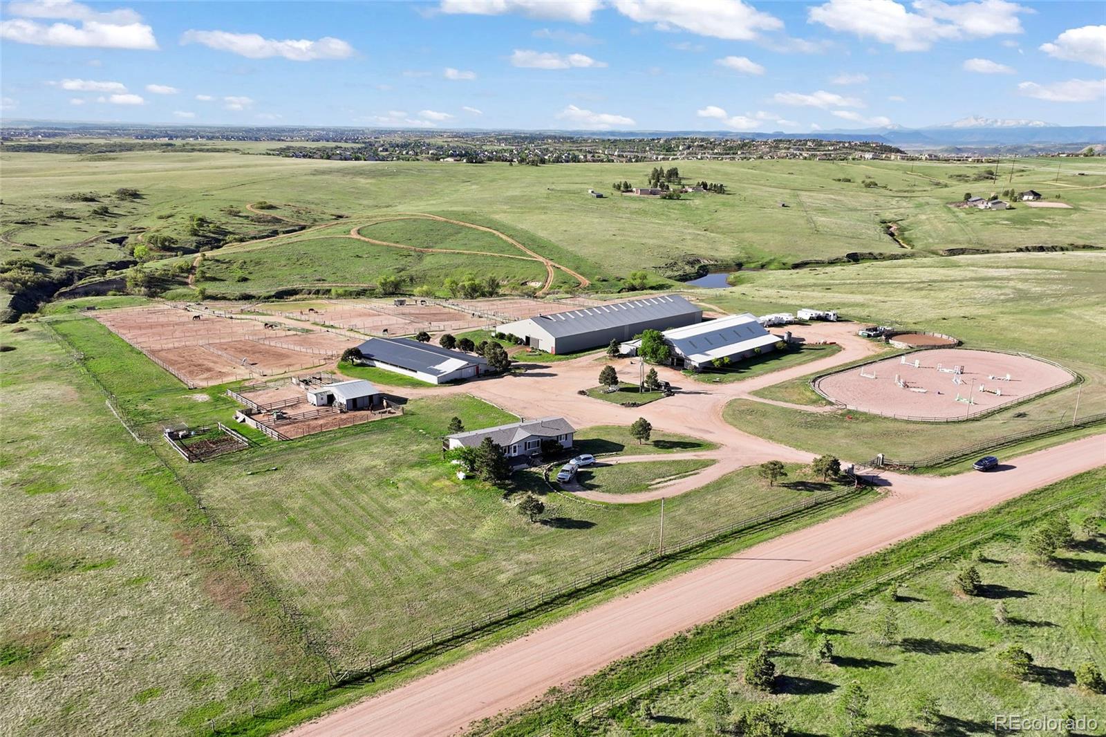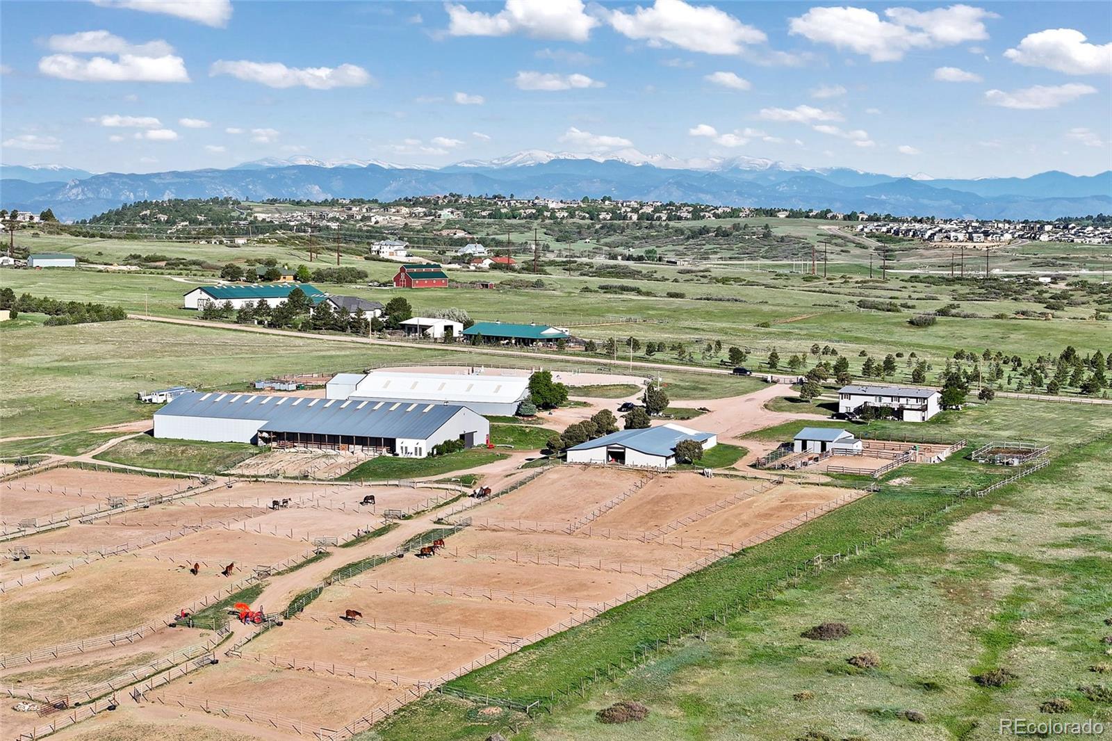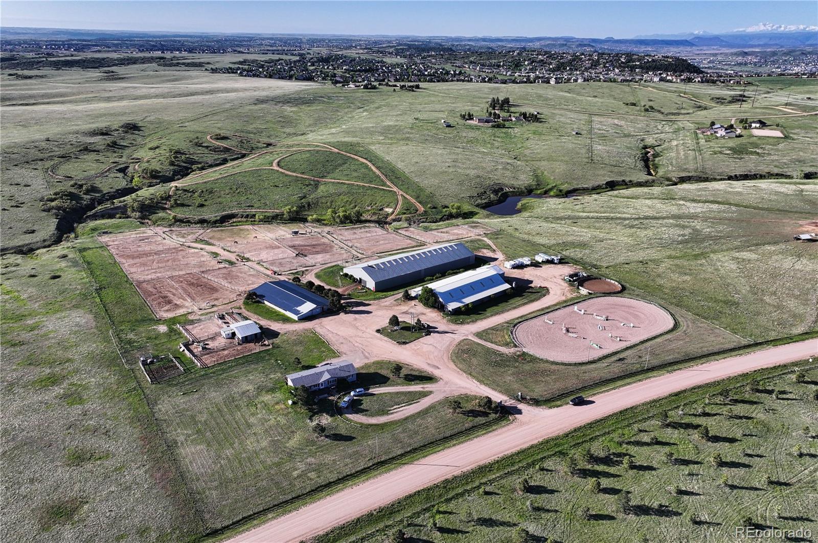Location!! Offering Sky View Farms,legal operating Equestrian facility in Douglas County, special use permit for 50 plus horses, commercial well and water rights.This peaceful oasis is convenient to Castle Pines and also allows easy access to Denver Tech Center. It sits east of of 1-25 and directly south of the newly developed Canyons.Close to Castle Rock downtown,,every amenity is at your fingertips.The properties private gated entry accesses a thriving 50 stall occupied equestrian training business of competitive horses along side a 5013c with room for retirement horses or brood mares and ample turnout ,good footing in both, indoor and outdoor arenas ,a large round pen and plenty of trails. Dirt roads through the community allow for trail riding as well. The main show barn boasts 29 large stalls, a Heated Office and Lounge (Class Room) 1 large tack room plus 2 small converted additional tack rooms.It also has Heated water in the wash bay and 3 grooming stalls.The lower barn has 17 Retirement or breeding oversized stalls a heated lounge , tack and feed room.A 5013c leases a 4 stall small barn on the property and will happily continue to lease. There are 38 individual paddocks and 1 large pasture all fenced with white lightening fencing to keep your horses safe..The pastures are frequented by elk .Train year round in this large heavily Insulated indoor arena with led lights with more than enough room to jump a course. The indoor has a lovely separate office with a patio.The large oudoor arena has views and great natural footing that drains quickly. The round pen is a nice size for longe lining or lunging horses. A euroxciser could also easily be placed there.There is a 3bd 2 ba Modular home for support staff creates a place for full time help to reside on site.It could be replaced with your dream home. The full walk out basement gives options for staff or boarders. The possibilities of your own venue, 5013c or training business allow you to create your lifestyle!