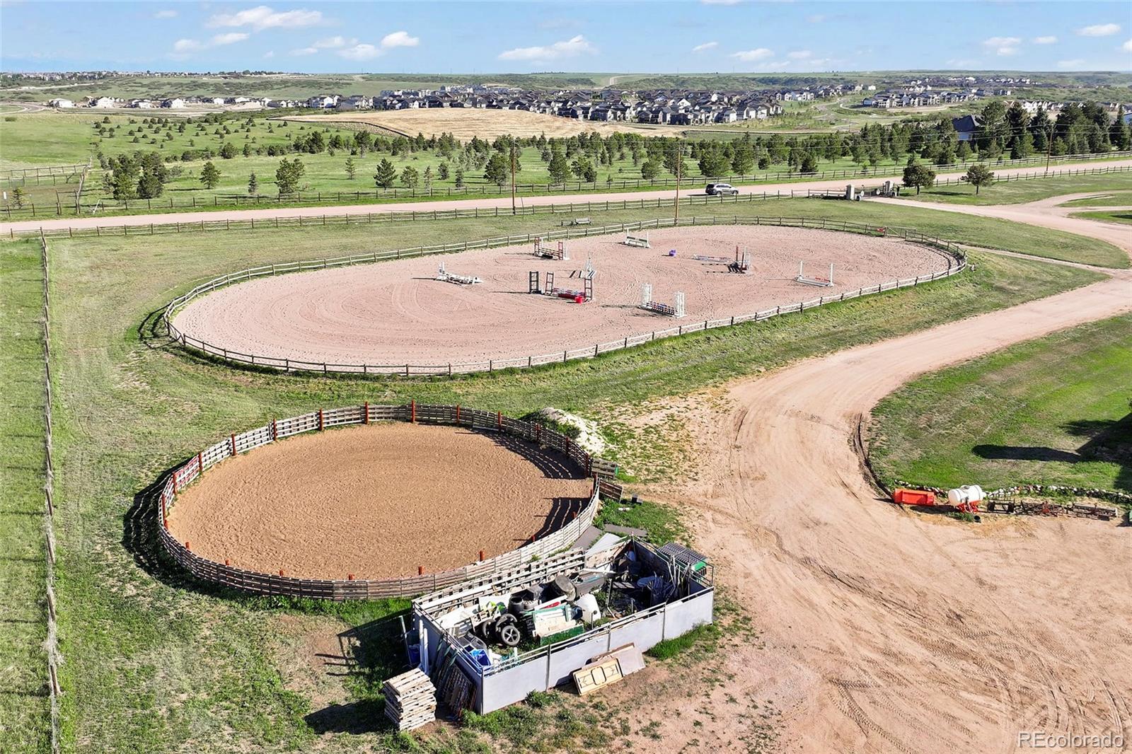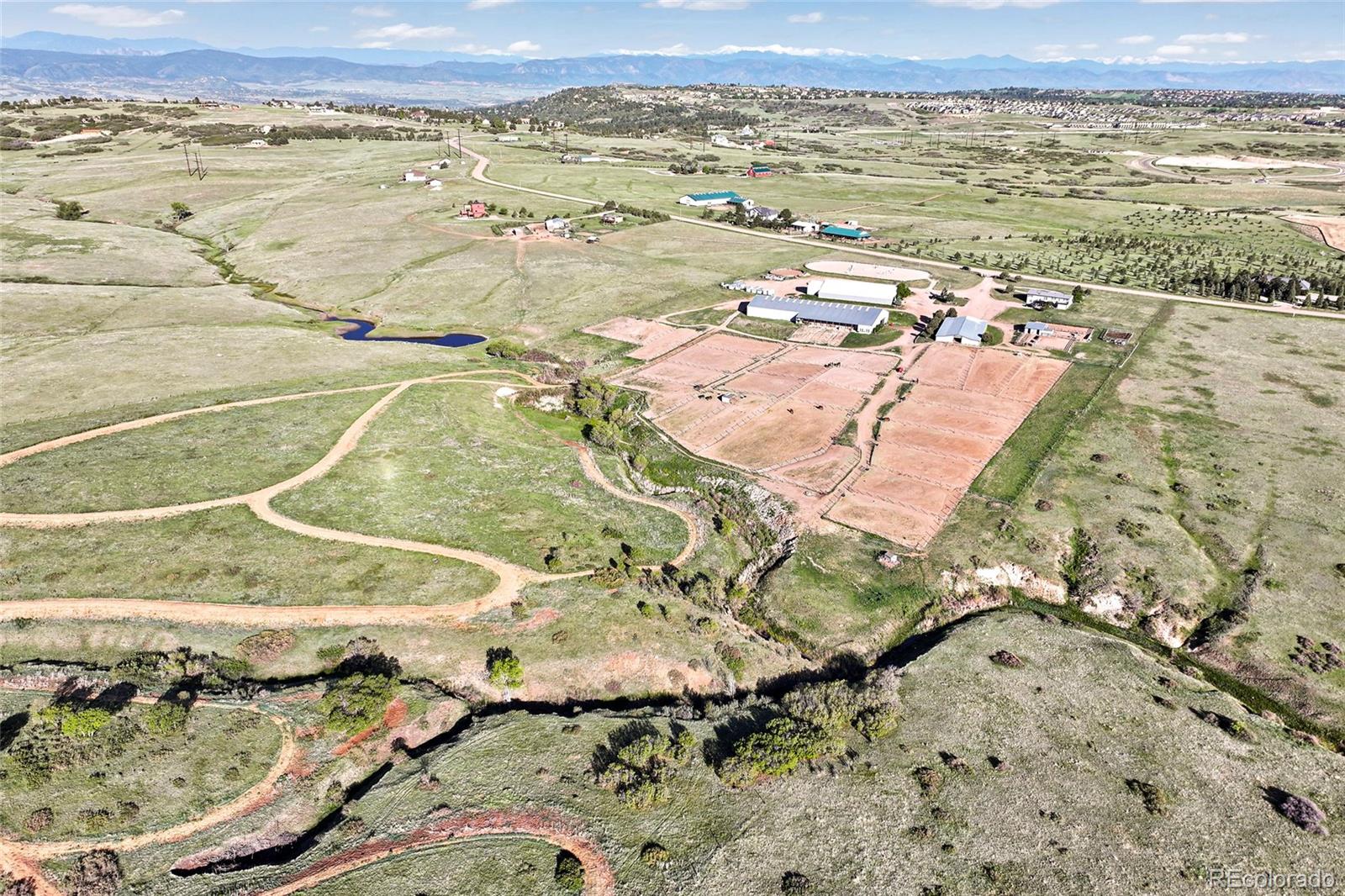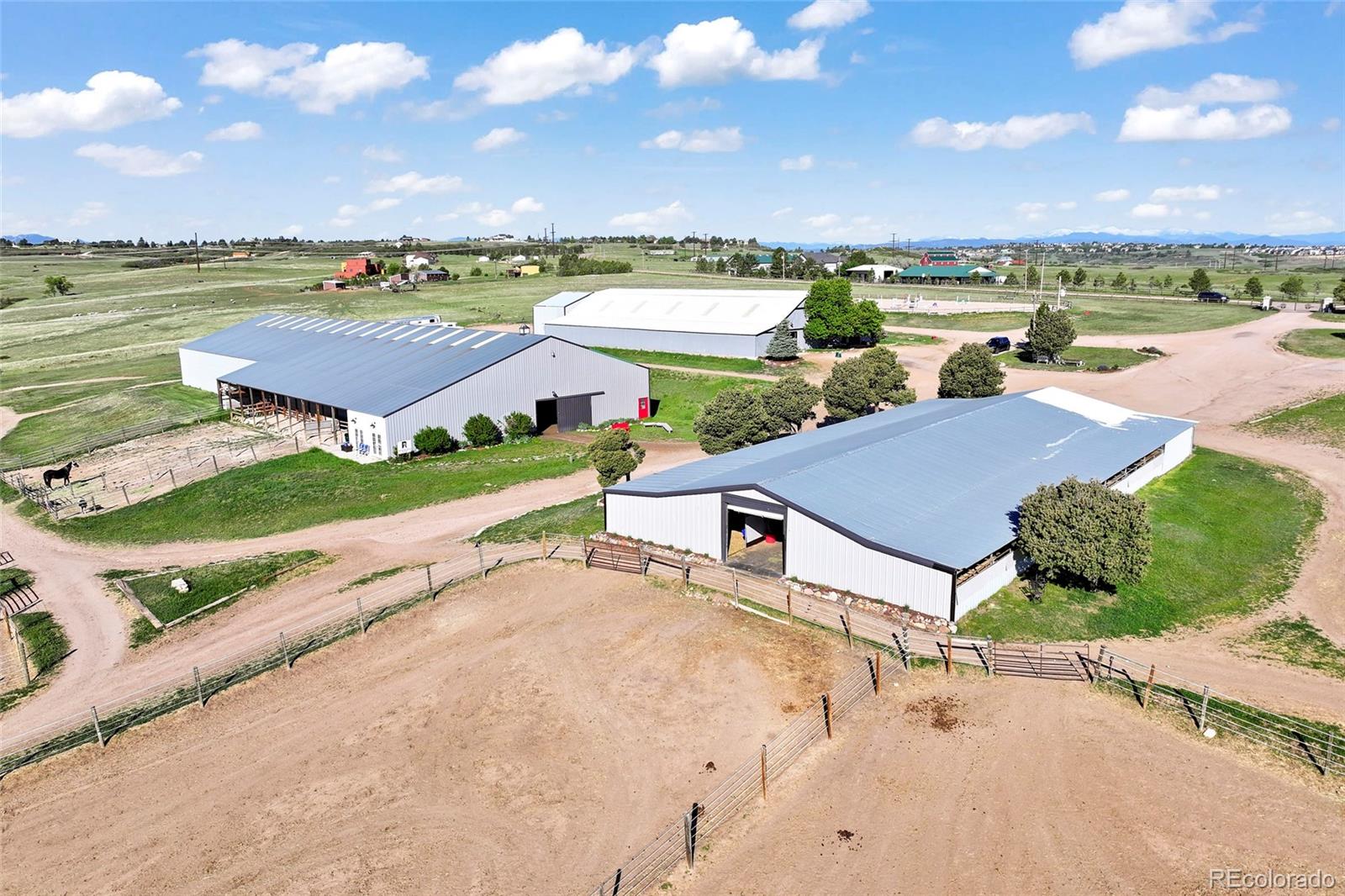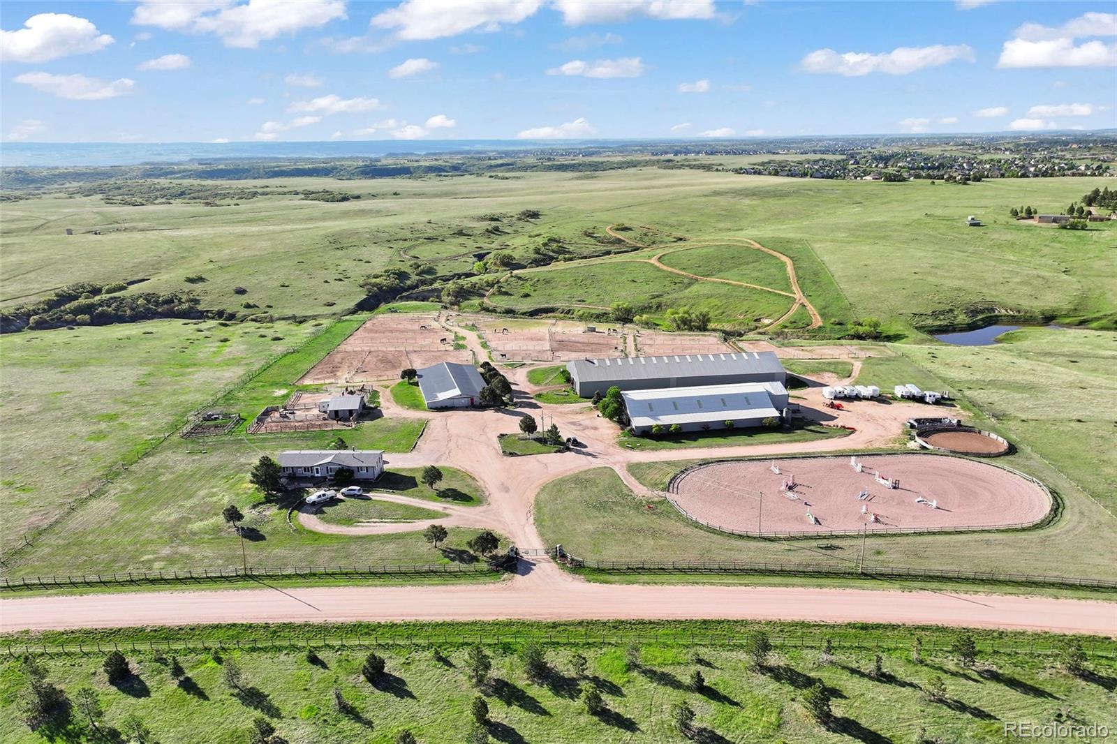 Location!! Offering Sky View Farms,legal operating Equestrian facility in Douglas County, special use permit for 50 plus horses, commercial well and water rights.This peaceful oasis is convenient to Castle Pines and also allows easy access to Denver Tech Center. It sits east of of 1-25 and directly south of the newly developed Canyons.Close to Castle Rock downtown,,every amenity is at your fingertips.The properties private gated entry accesses a thriving 50 stall occupied equestrian training business of competitive horses along side a 5013c with room for retirement horses or brood mares and ample turnout ,good footing in both, indoor and outdoor arenas ,a large round pen and plenty of trails. Dirt roads through the community allow for trail riding as well. The main show barn boasts 29 large stalls, a Heated Office and Lounge (Class Room) 1 large tack room plus 2 small converted additional tack rooms.It also has Heated water in the wash bay and 3 grooming stalls.The lower barn has 17 Retirement or breeding oversized stalls a heated lounge , tack and feed room.A 5013c leases a 4 stall small barn on the property and will happily continue to lease. There are 38 individual paddocks and 1 large pasture all fenced with white lightening fencing to keep your horses safe..The pastures are frequented by elk .Train year round in this large heavily Insulated indoor arena with led lights with more than enough room to jump a course. The indoor has a lovely separate office with a patio.The large oudoor arena has views and great natural footing that drains quickly. The round pen is a nice size for longe lining or lunging horses. A euroxciser could also easily be placed there.There is a 3bd 2 ba Modular home for support staff creates a place for full time help to reside on site.It could be replaced with your dream home. The full walk out basement gives options for staff or boarders. The possibilities of your own venue, 5013c or training business allow you to create your lifestyle!