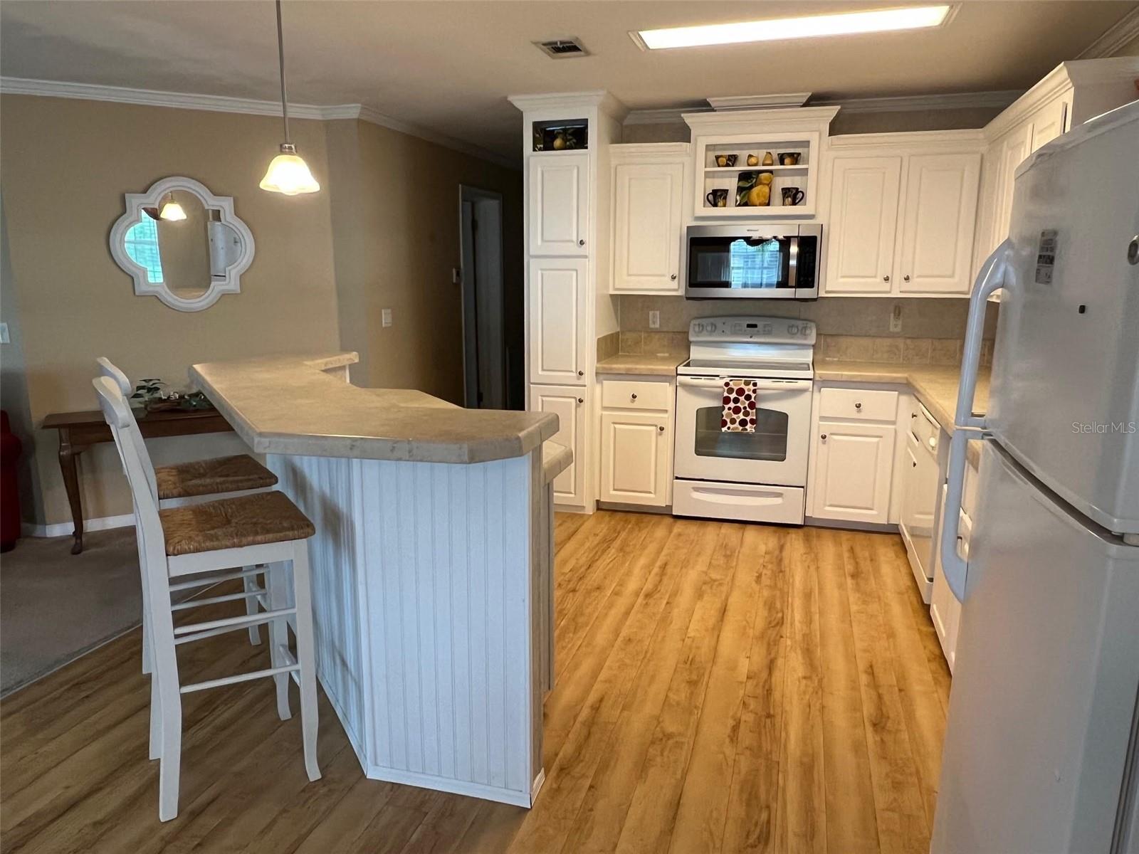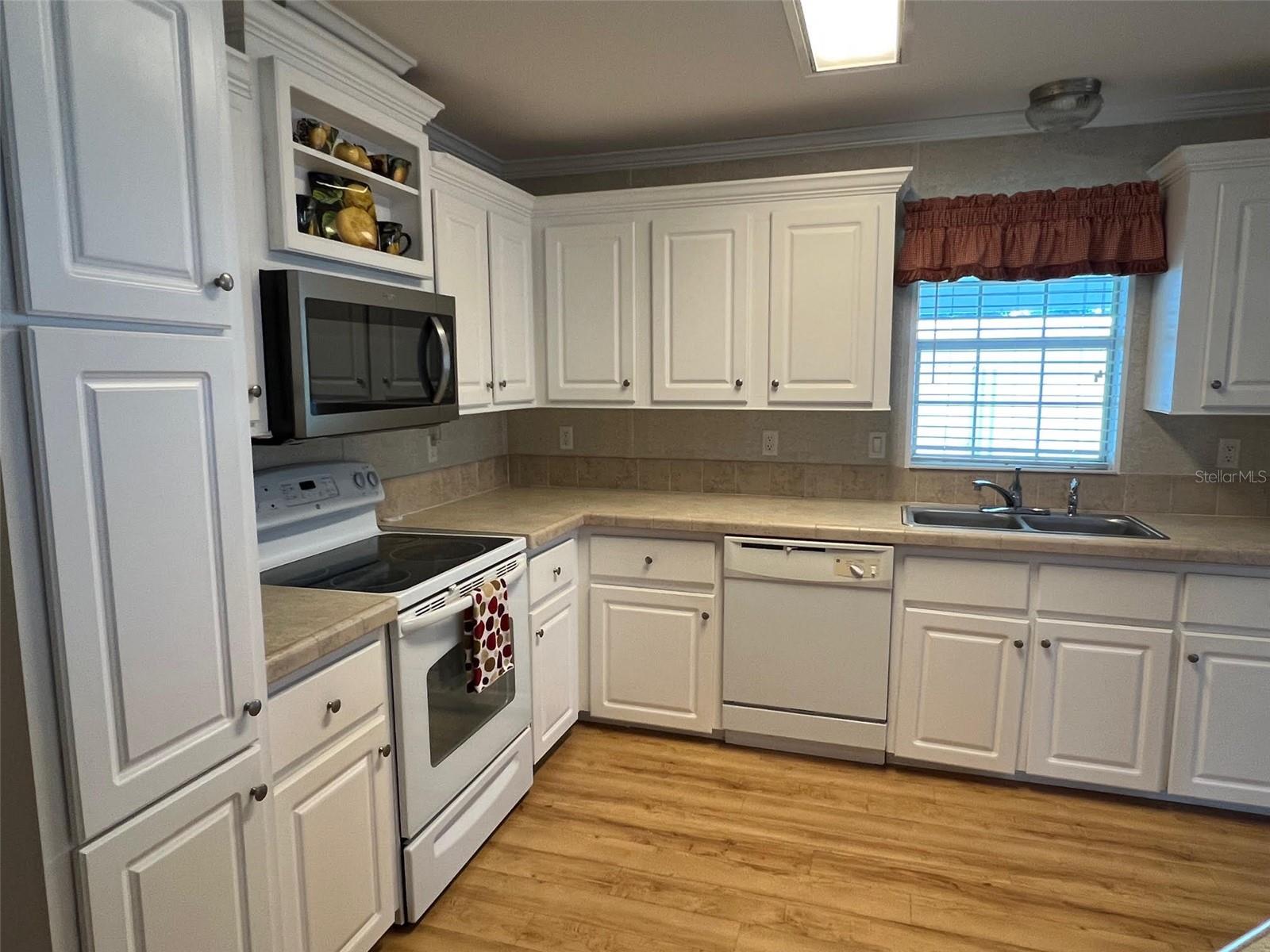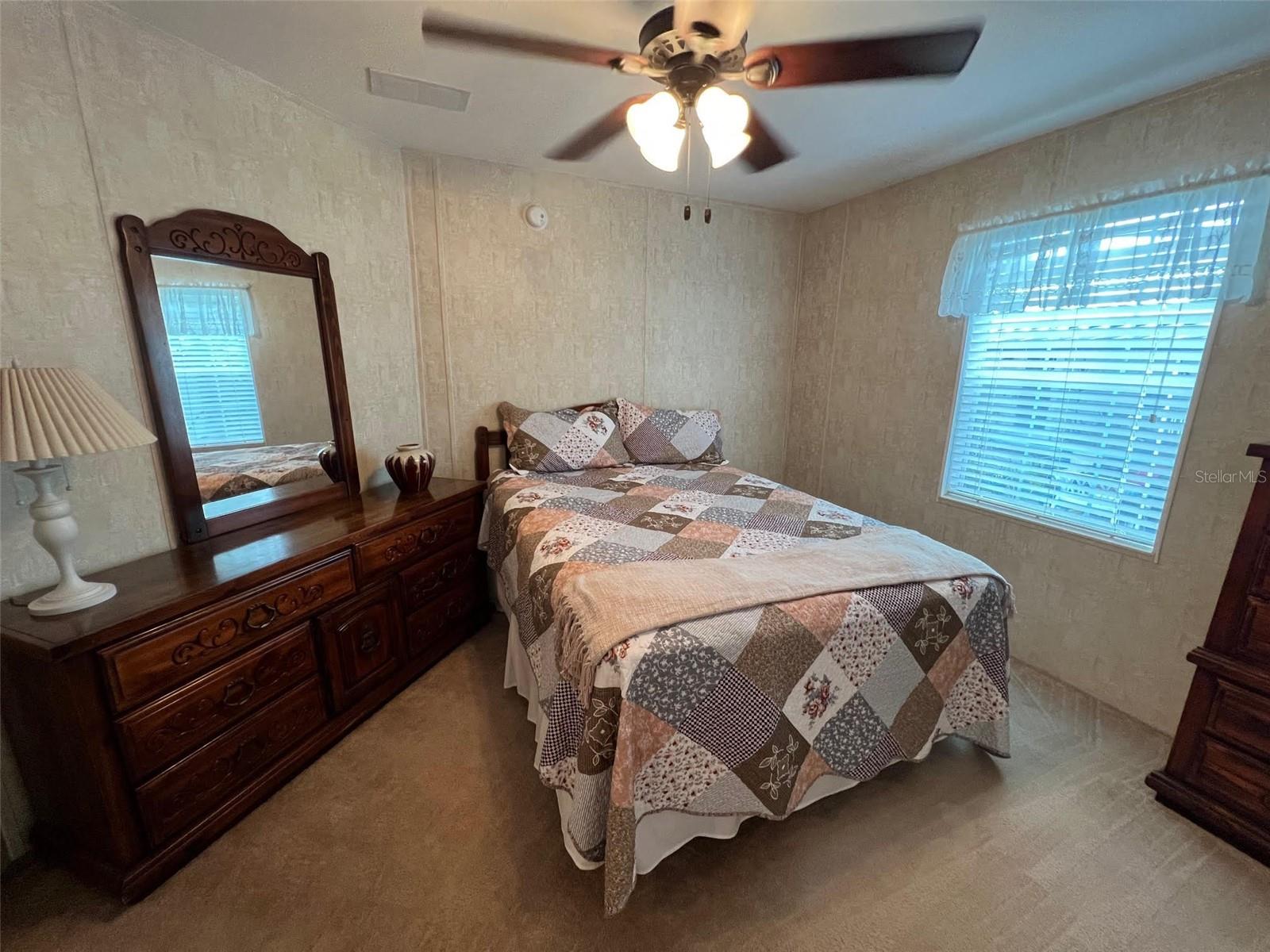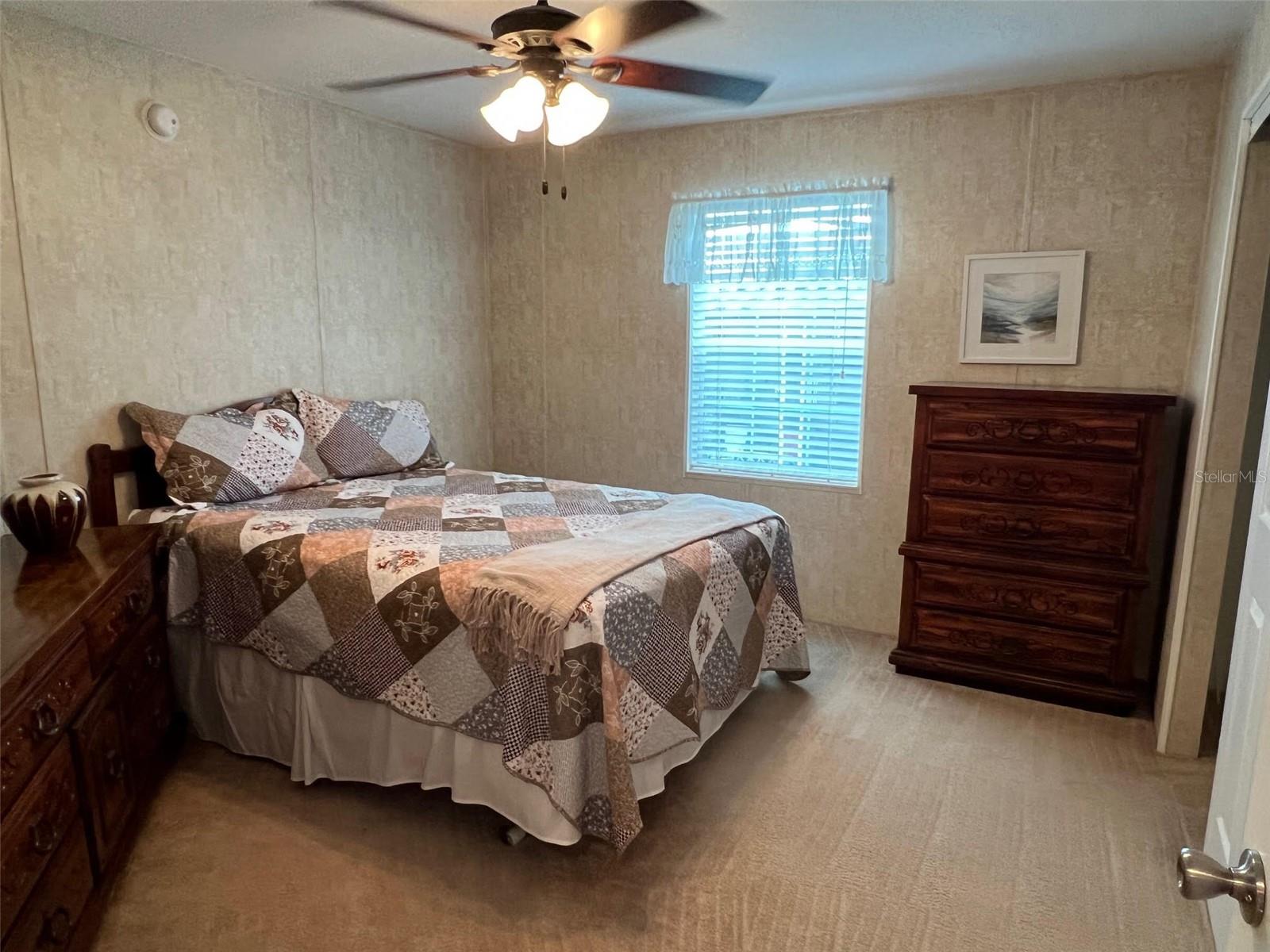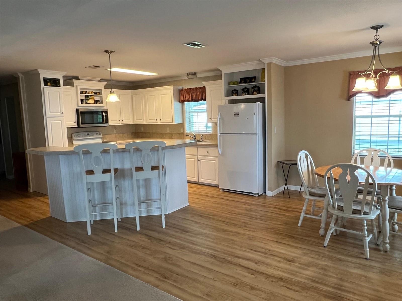From the moment you arrive, this spacious layout invites you into a fully furnished home where comfort meets functionality in an open floor plan. A blend of laminate, carpet, and vinyl flooring flows throughout, complemented by elegant six-panel doors, ceiling fans, and the comfort of central heat and air conditioning (2018). The bright, cheerful kitchen features a central island with stools for quick bites, abundant cabinetry, and modern appliances—including a fridge, range, oven, dishwasher, and microwave—seamlessly opening to a dining area that's roomy enough to host gatherings. The pleasant living room offers a relaxing atmosphere, while the generous primary bedroom features a wall-to-wall closet and an ensuite with a walk-in shower and make-up vanity. The guest bedroom provides a cozy retreat for friends and family, with an easily accessible bath across the hall showcasing a tub/shower combo. A large indoor laundry room, complete with washer, dryer, shelving, and extra storage, adds the finishing touch to this well-appointed home.