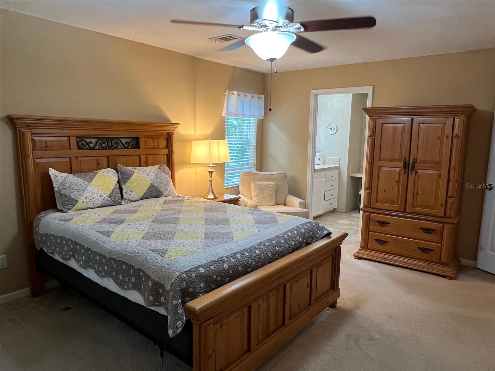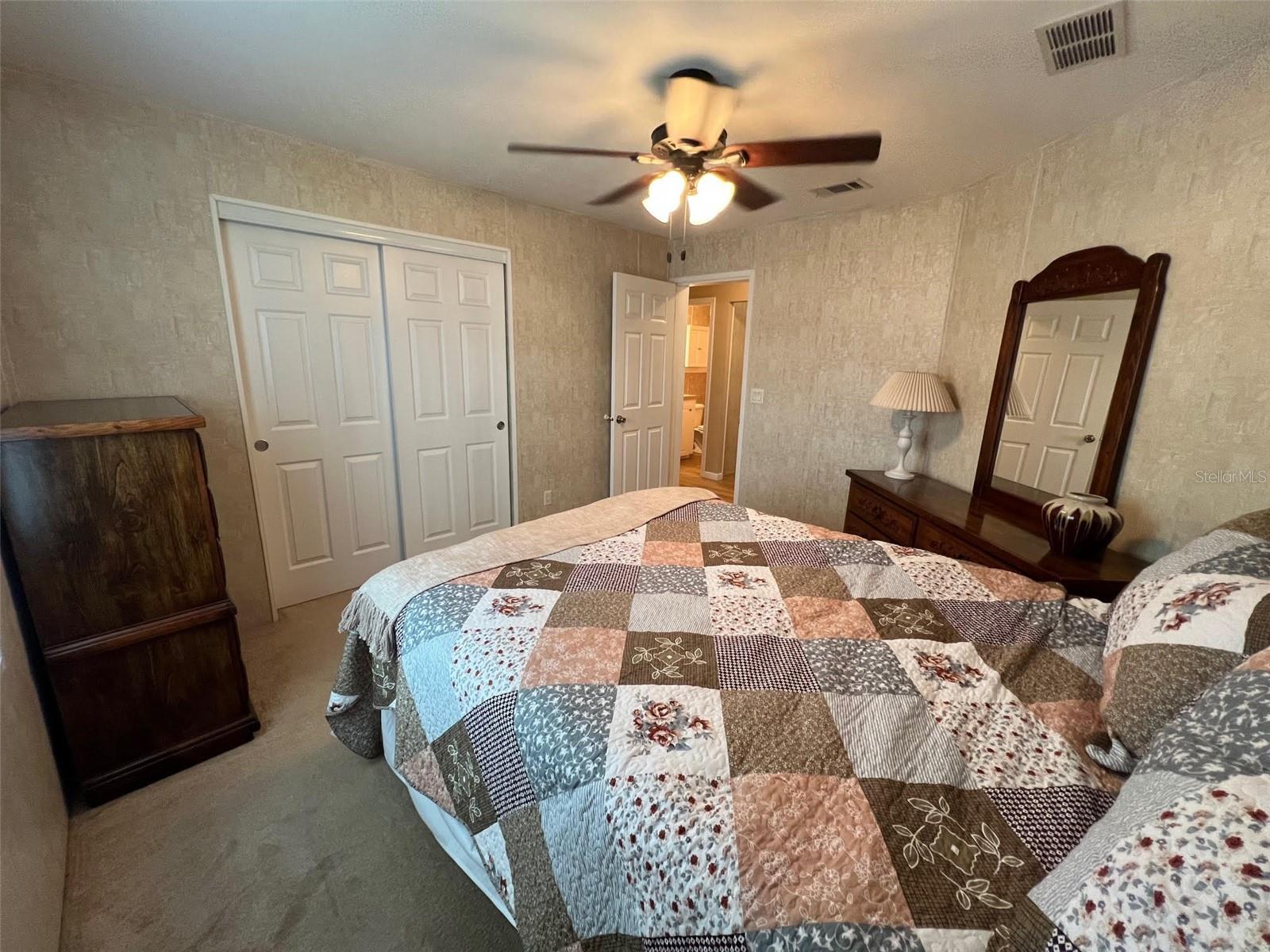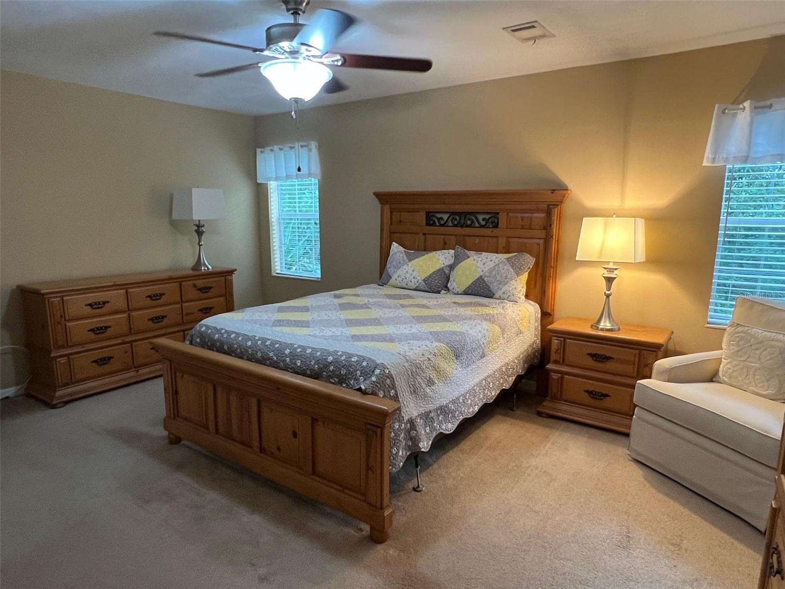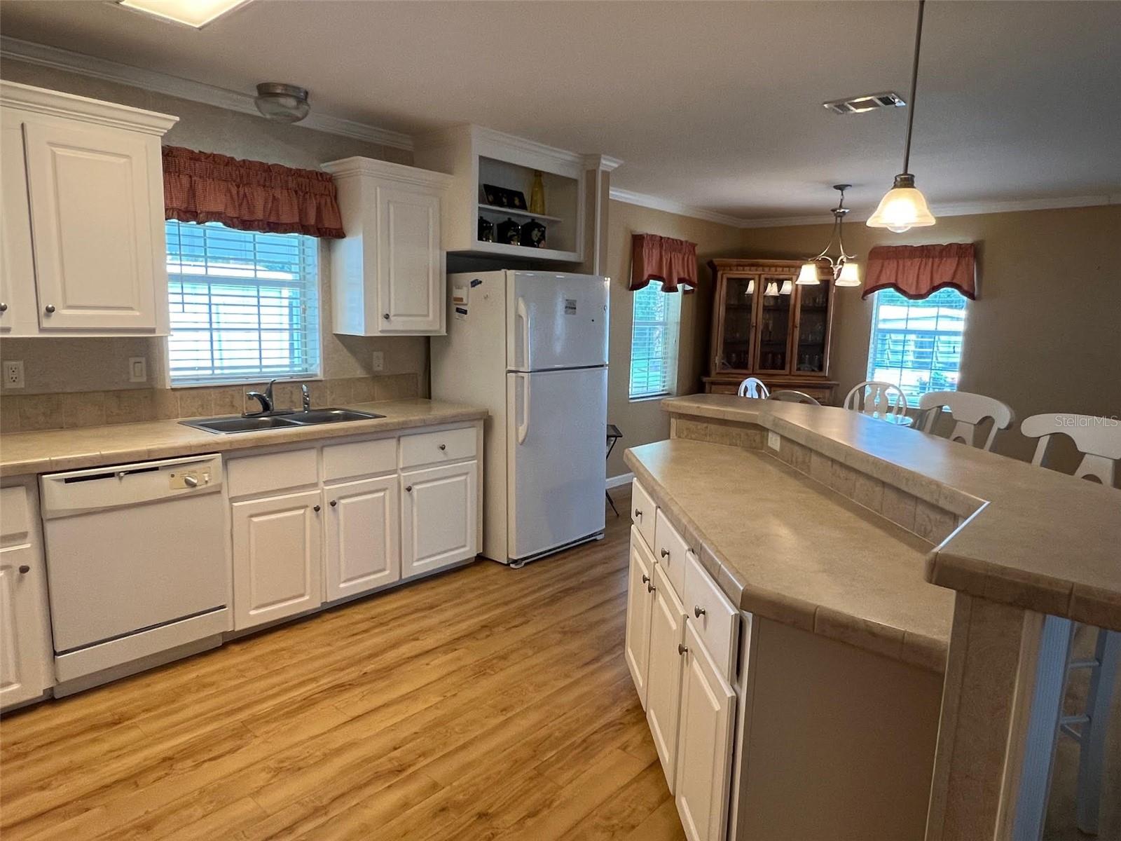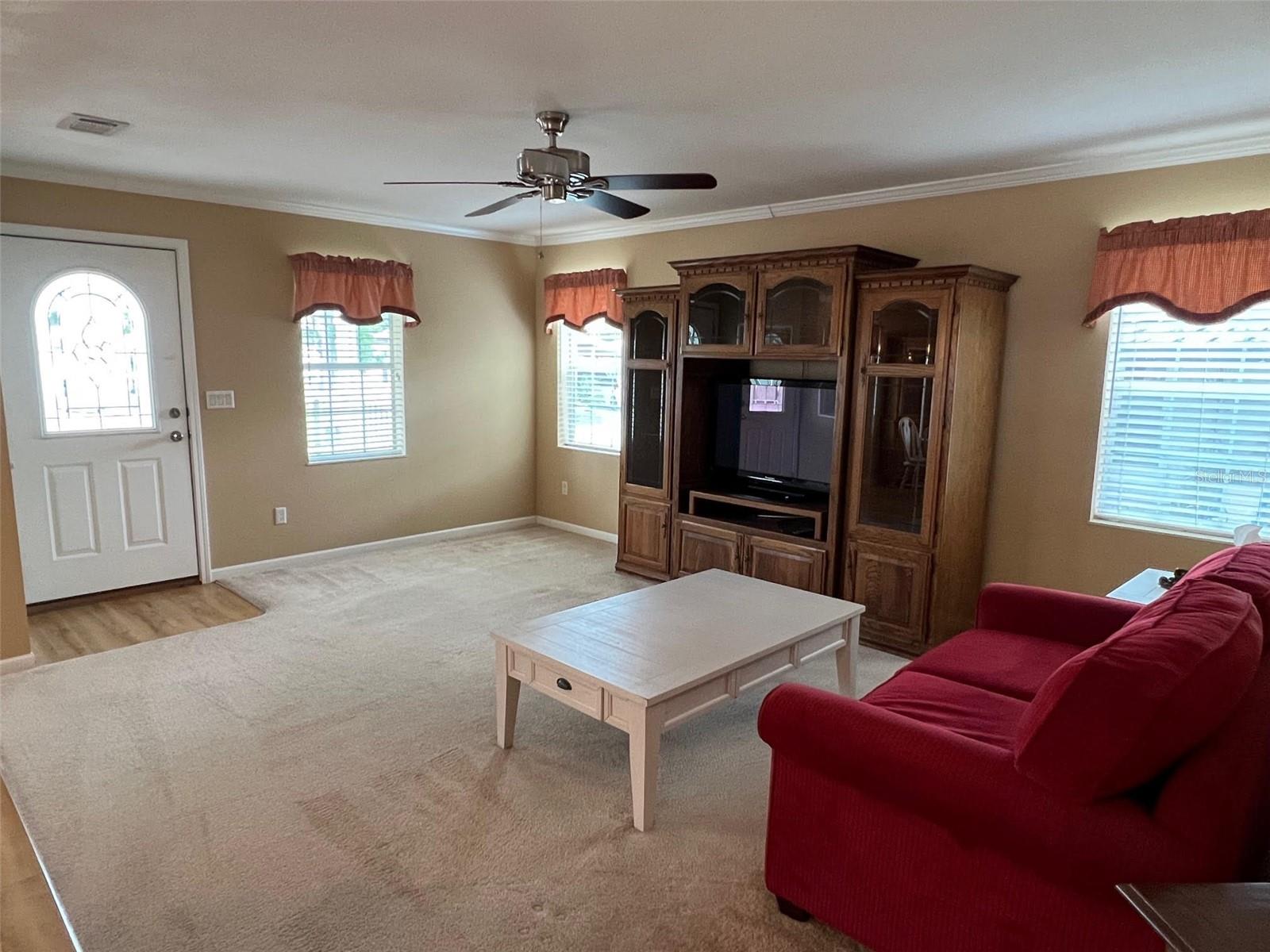 From the moment you arrive, this spacious layout invites you into a fully furnished home where comfort meets functionality in an open floor plan. A blend of laminate, carpet, and vinyl flooring flows throughout, complemented by elegant six-panel doors, ceiling fans, and the comfort of central heat and air conditioning (2018). The bright, cheerful kitchen features a central island with stools for quick bites, abundant cabinetry, and modern appliances—including a fridge, range, oven, dishwasher, and microwave—seamlessly opening to a dining area that's roomy enough to host gatherings. The pleasant living room offers a relaxing atmosphere, while the generous primary bedroom features a wall-to-wall closet and an ensuite with a walk-in shower and make-up vanity. The guest bedroom provides a cozy retreat for friends and family, with an easily accessible bath across the hall showcasing a tub/shower combo. A large indoor laundry room, complete with washer, dryer, shelving, and extra storage, adds the finishing touch to this well-appointed home.