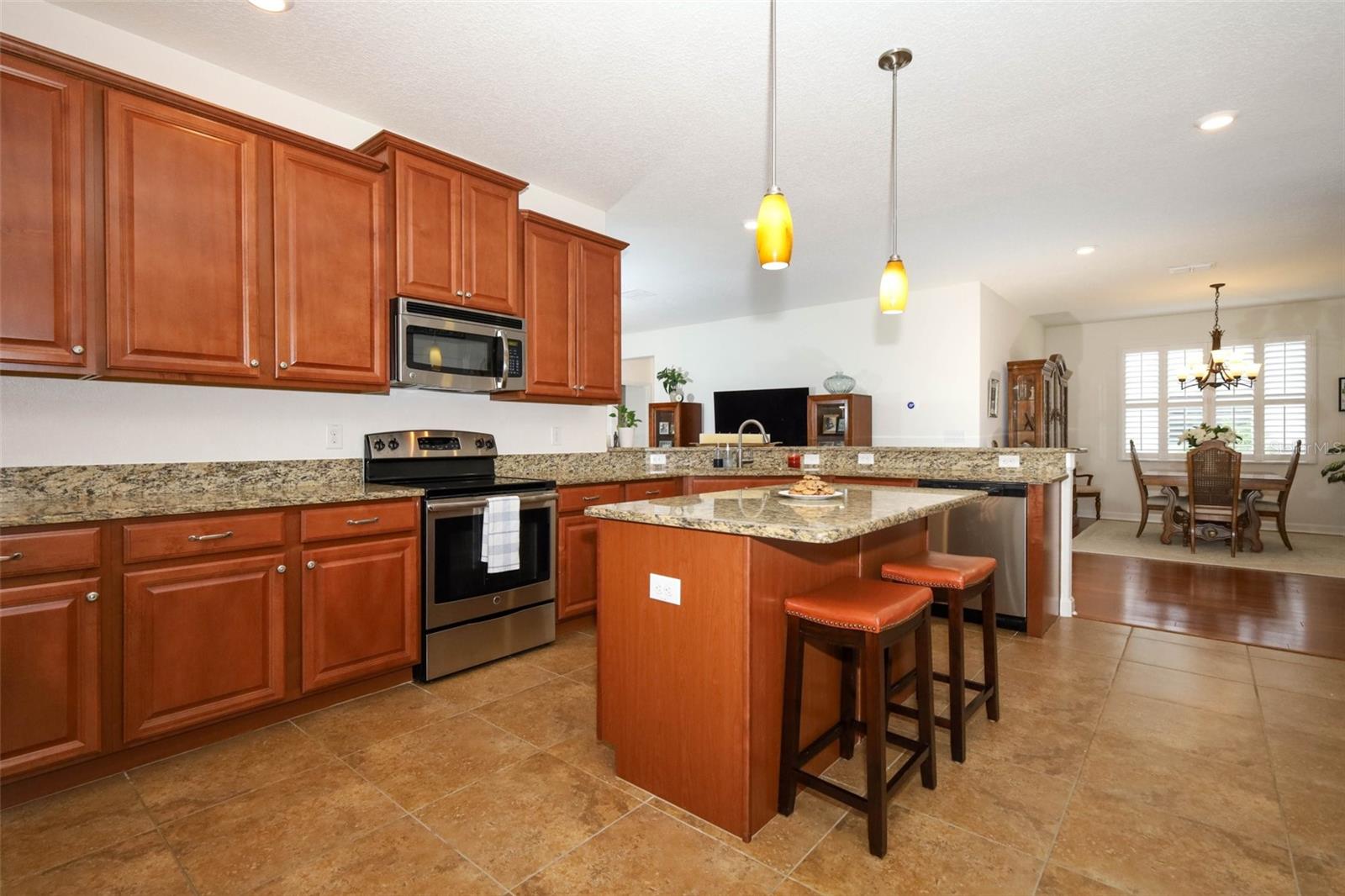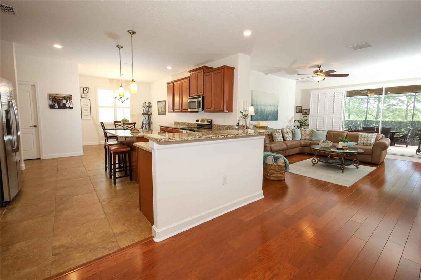 Welcome to this immaculate, well-cared for home nestled in sought after Heritage Hills--a popular 55+community in Clermont! This FRESHLY PAINTED 4bedroom, 3 full bath home features SOLID WOOD FLOORING in all main areas, TILE in west areas, CARPETED bedrooms, PLANTATION SHUTTERS THROUGHOUT, 2-yr old A/C.. It is a 3-way split whereby the front bedroom has it's own bathroom, spacious primary bedroom features large walk organized closet, spacious bathroom with dual sinks, bathtub & standup shower spacious. Home is ideal for entertaining featuring large island, lots of 42" SOLID WOOD CABINETS, SS APPLIANCES, GRANITE COUNTER TOPS, breakfast & eat-in area. The Great room overlooks the EXTENDED SCREENED LANAI with NO REAR NEEIGHBORS. Spacious 3-car attached garage provides ample room for golf car, 2 cars and storage is a bonus! The community's 5-mile walking trail is out your door! The yard is maintained by the HOA. Heritage Hills is a guard-gated, resort style community with amenities that include a heated pool and spa, pickle ball, tennis, basketball, bocce ball, shuffleboard, clubhouse with planned activities & clubs to join, fitness center, art & crafts room, billiard room, card room and space for private events. Exterior of your home is painted every 5-6 years by HOA. Ideal location as you are a very short distance to all amenities--shopping, golf, lively & growing downtown Clermont, the Clermont Chain of Lakes for boating & swimming, Winter Garden & main roads to take you to MCO, Tampa, Cape Canaveral, the beaches and themes parks. MOTIVATED SELLER. Seller will contribute to buyer's closing costs.
