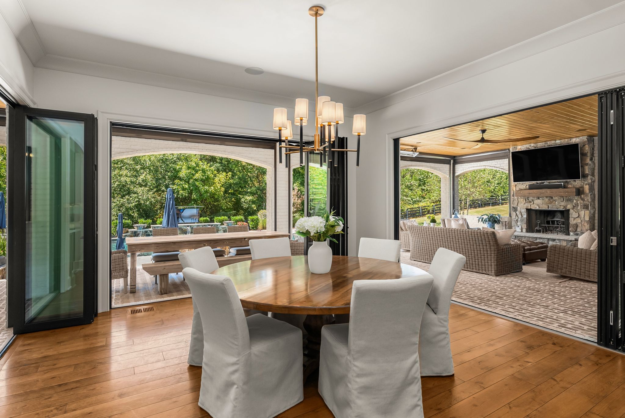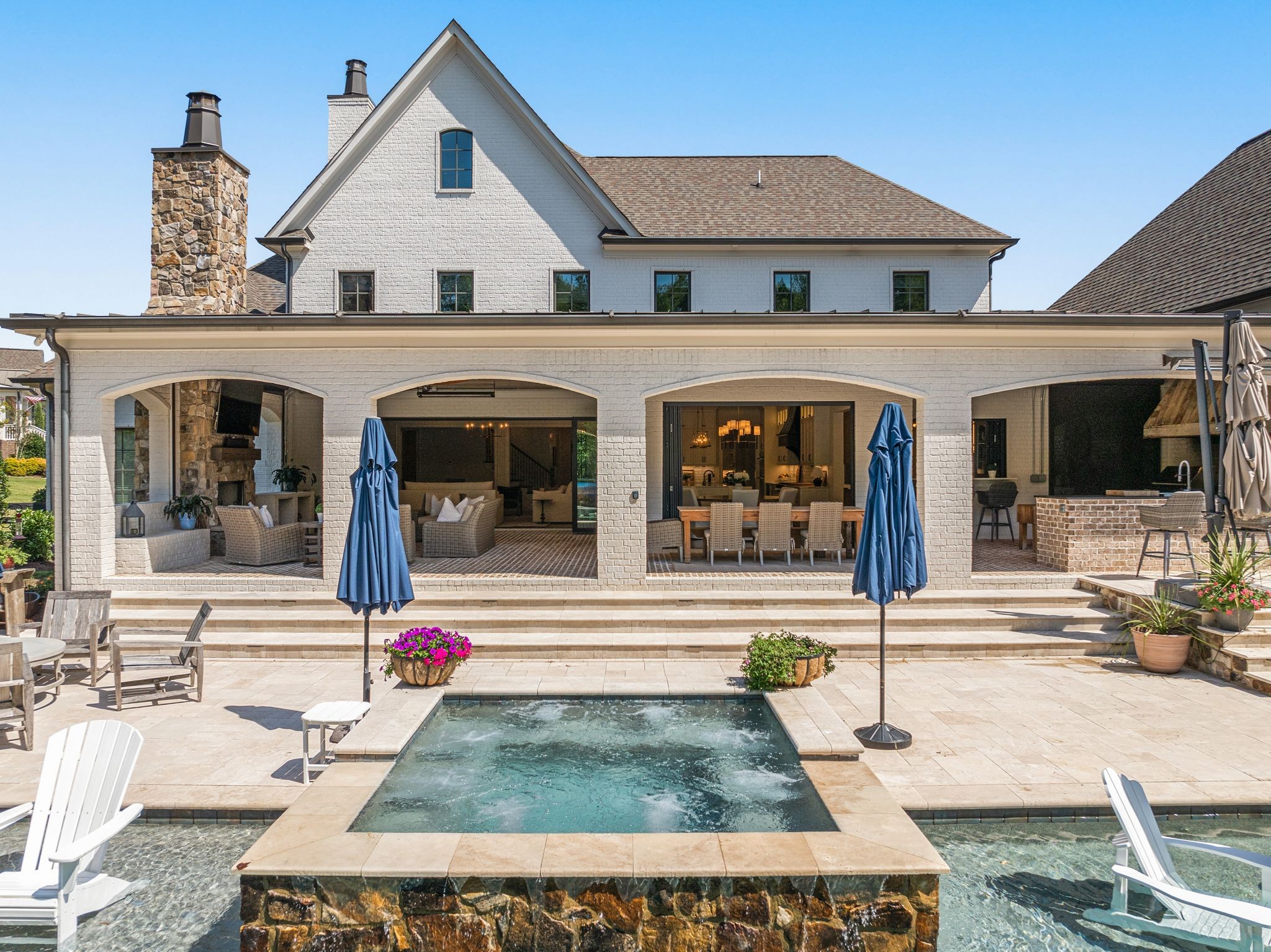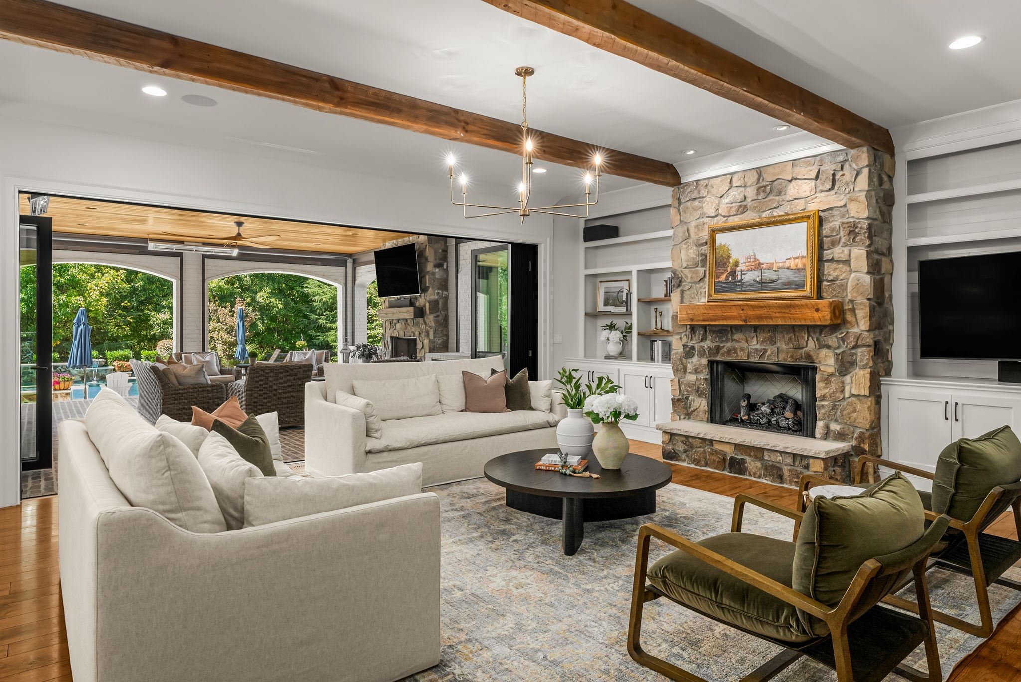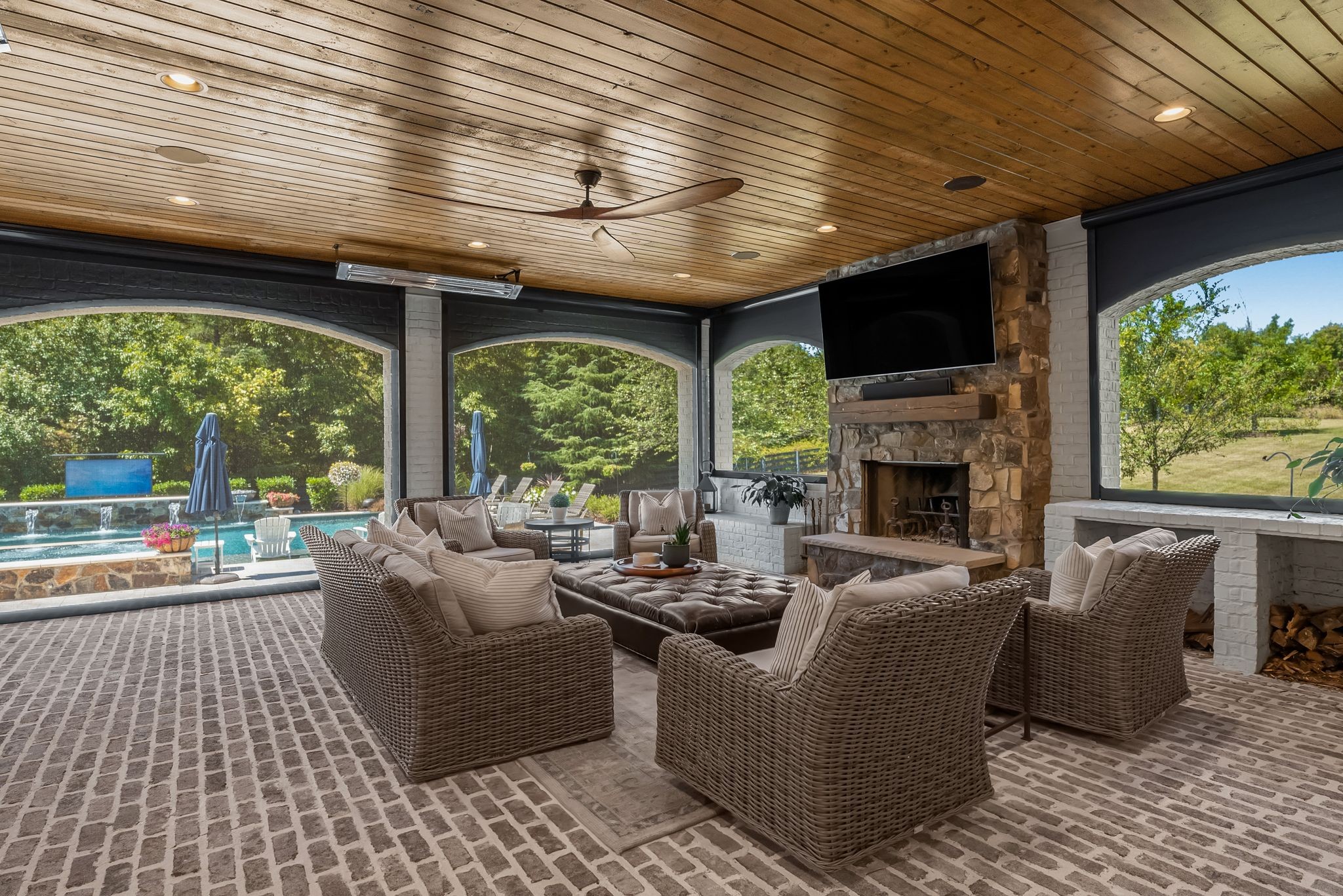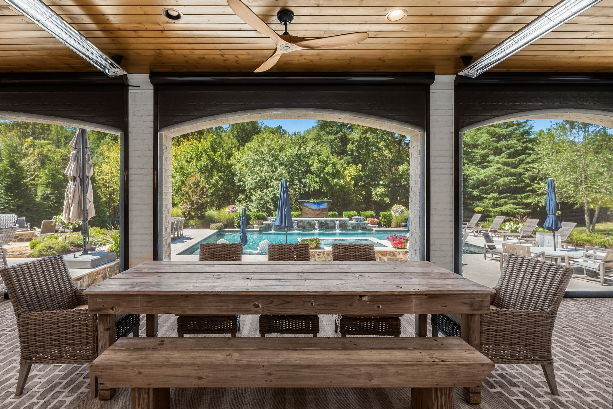 A defining highlight of the estate is its extraordinary 1,500‑square‑foot outdoor living space, crafted as a true extension of the home. The entire back façade opens completely to the outdoors, creating a harmonious connection between interior luxury and the natural surroundings. This expansive area is enhanced with built‑in heaters, power shades, and multiple zones for lounging and dining, allowing year‑round enjoyment. Overlooking the grounds is a resort-style pool, surrounded by thoughtfully designed spaces that invite relaxation, connection, and celebration.
