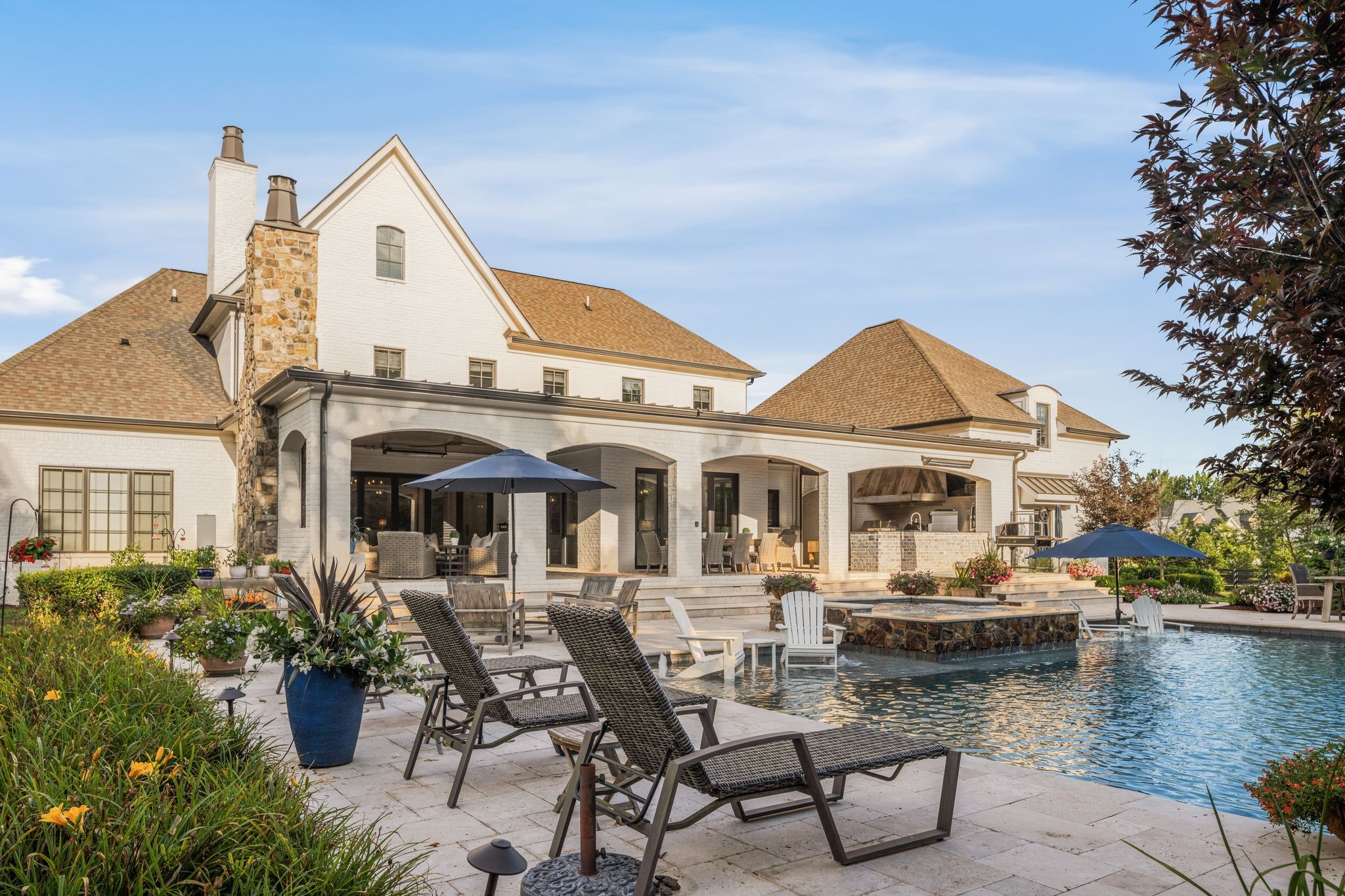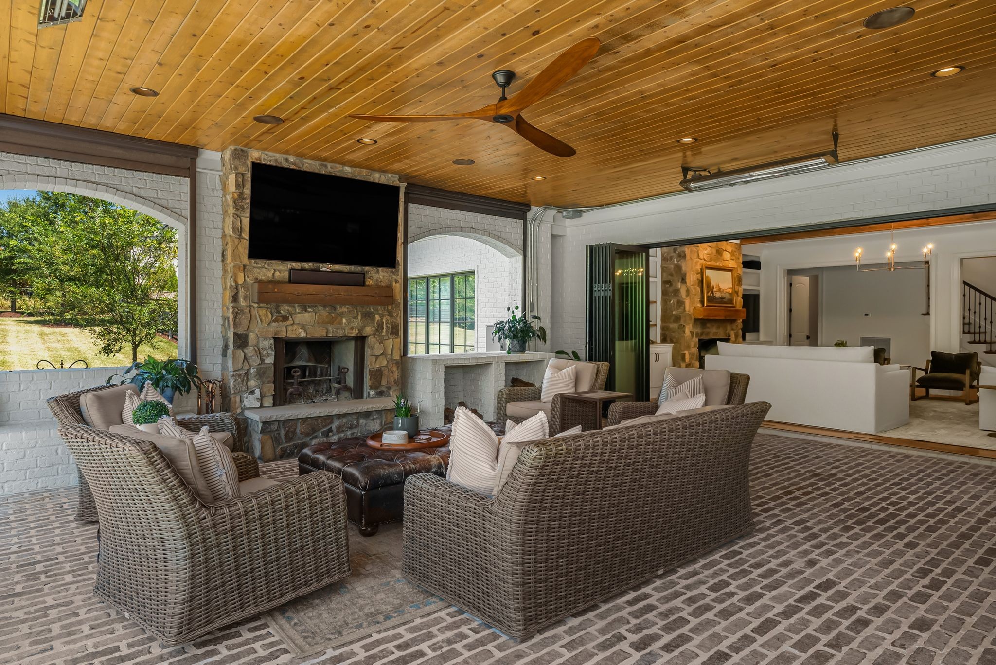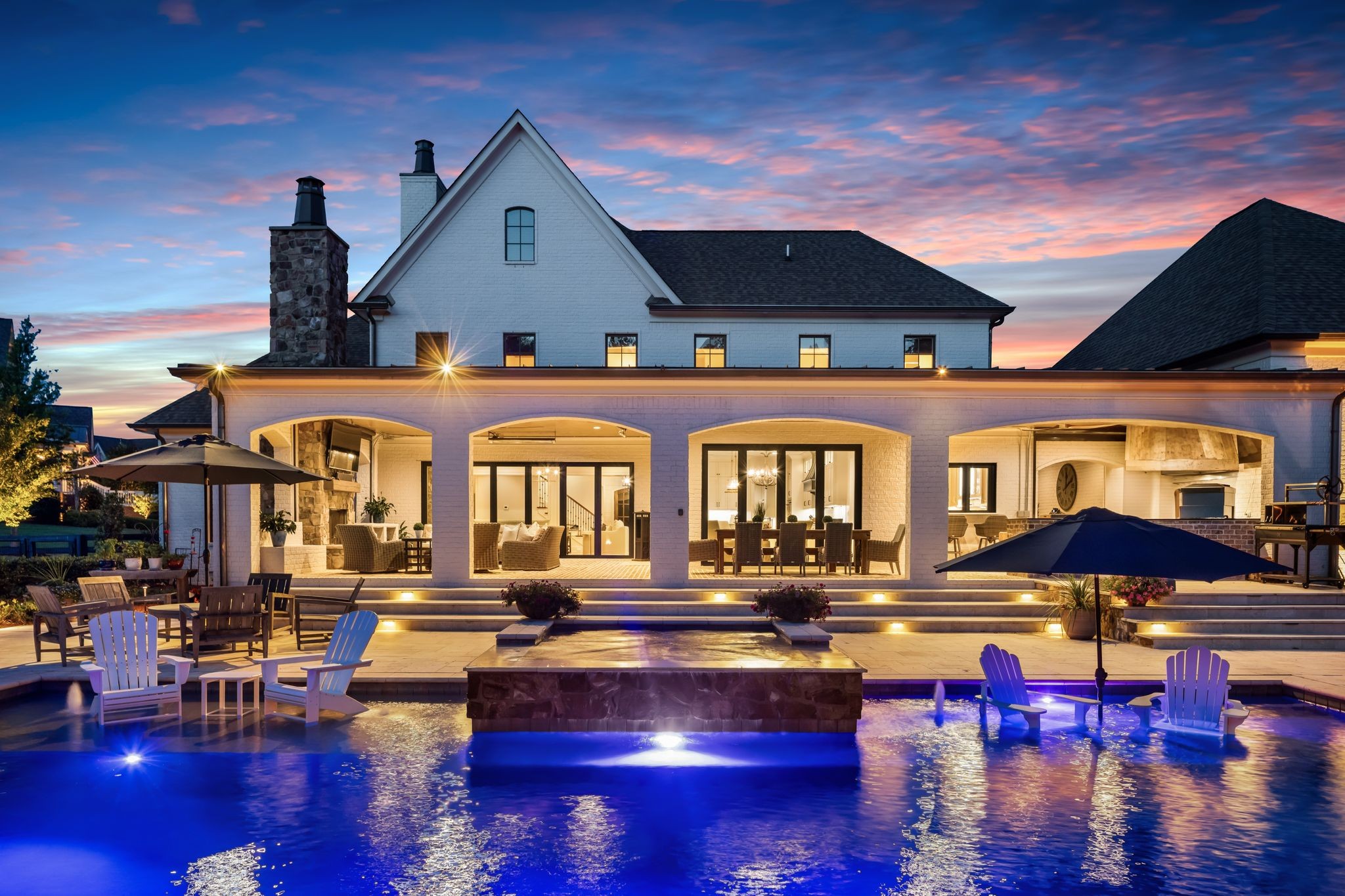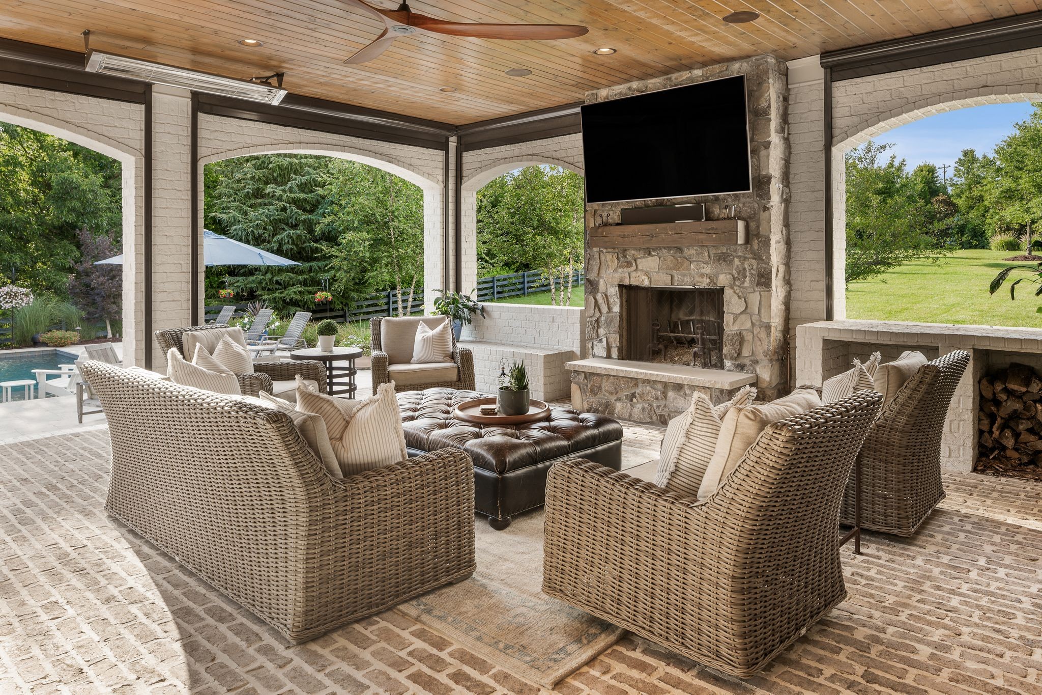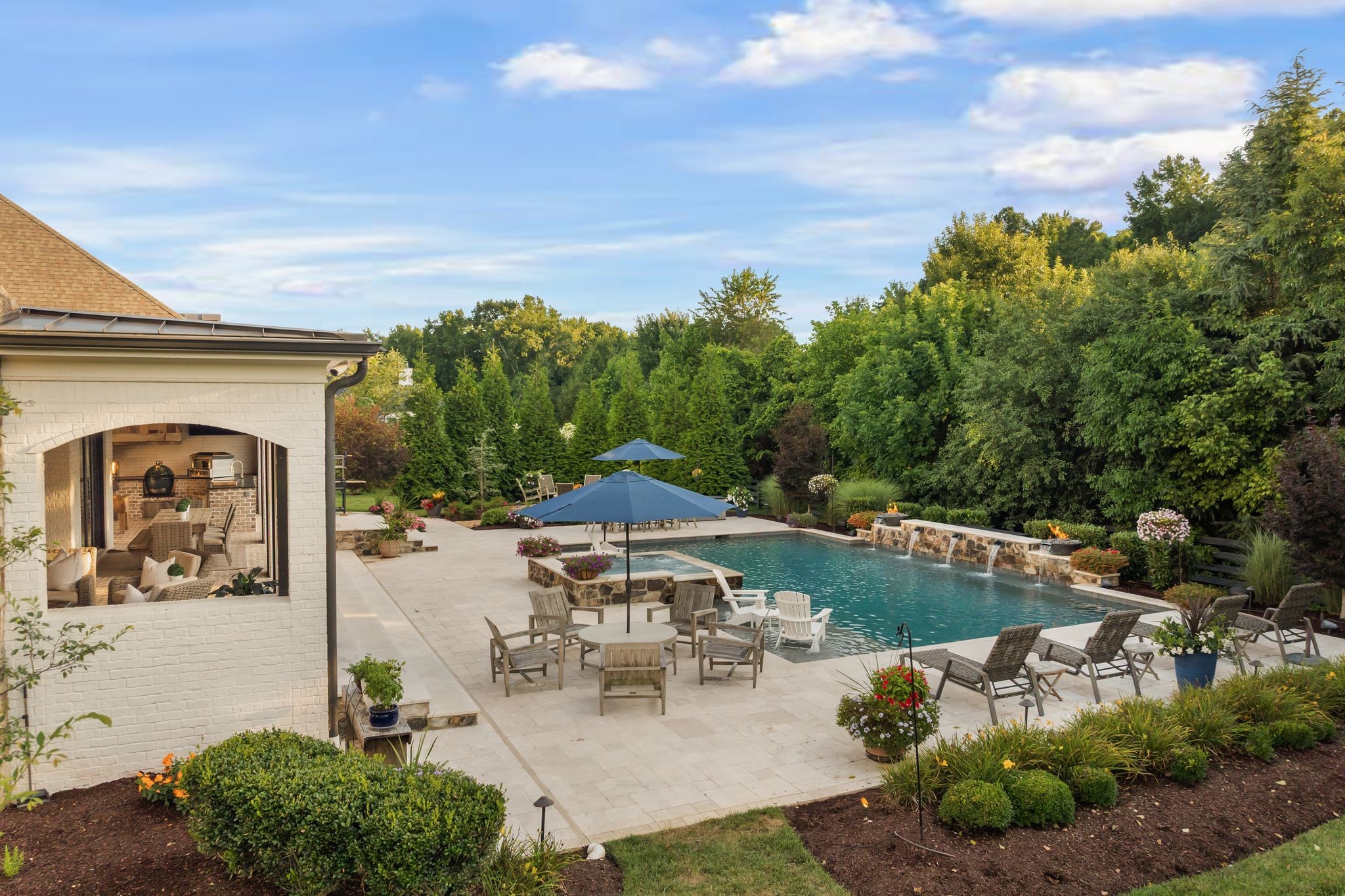 A defining highlight of the estate is its extraordinary 1,500‑square‑foot outdoor living space, crafted as a true extension of the home. The entire back façade opens completely to the outdoors, creating a harmonious connection between interior luxury and the natural surroundings. This expansive area is enhanced with built‑in heaters, power shades, and multiple zones for lounging and dining, allowing year‑round enjoyment. Overlooking the grounds is a resort-style pool, surrounded by thoughtfully designed spaces that invite relaxation, connection, and celebration.