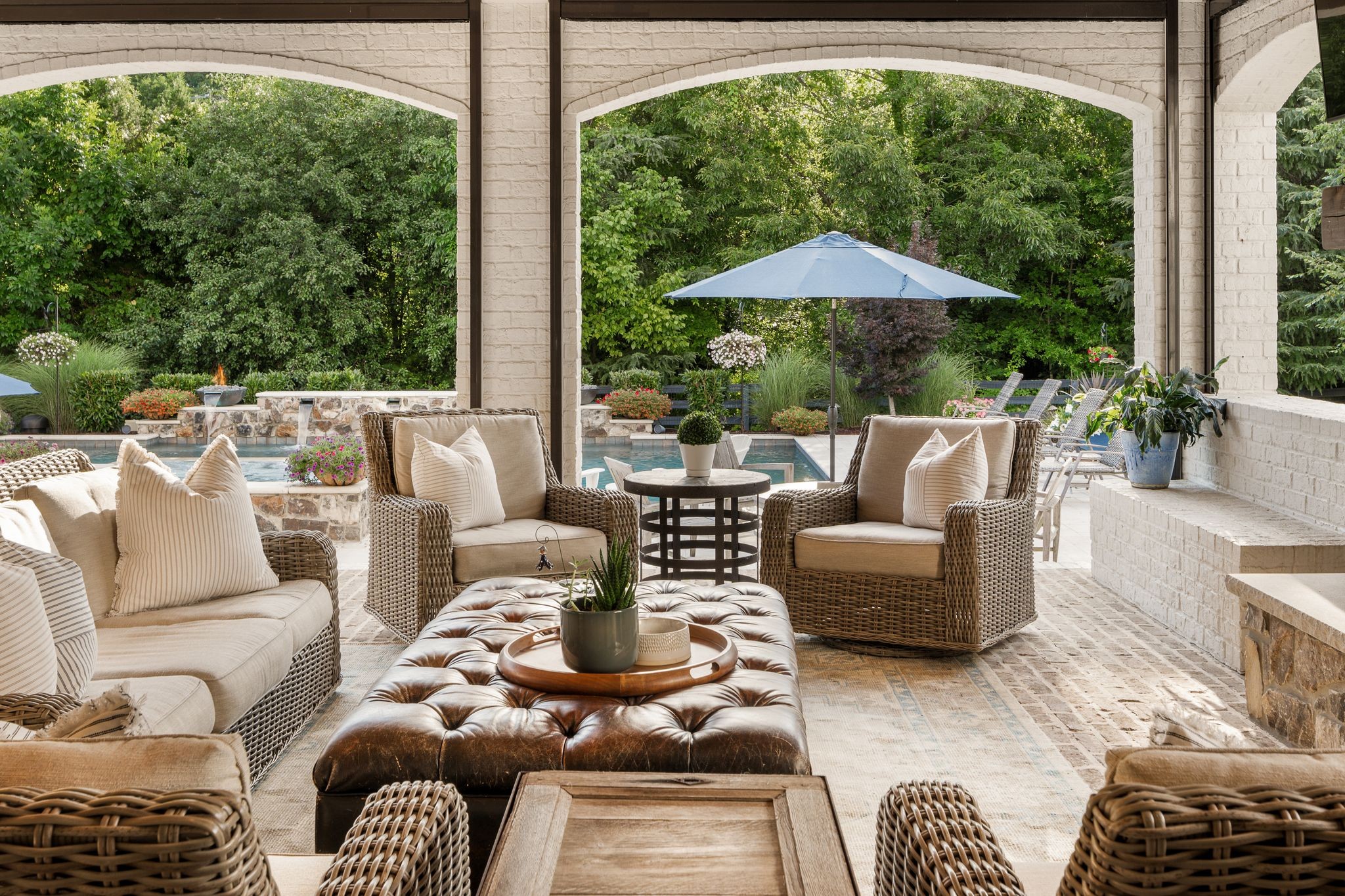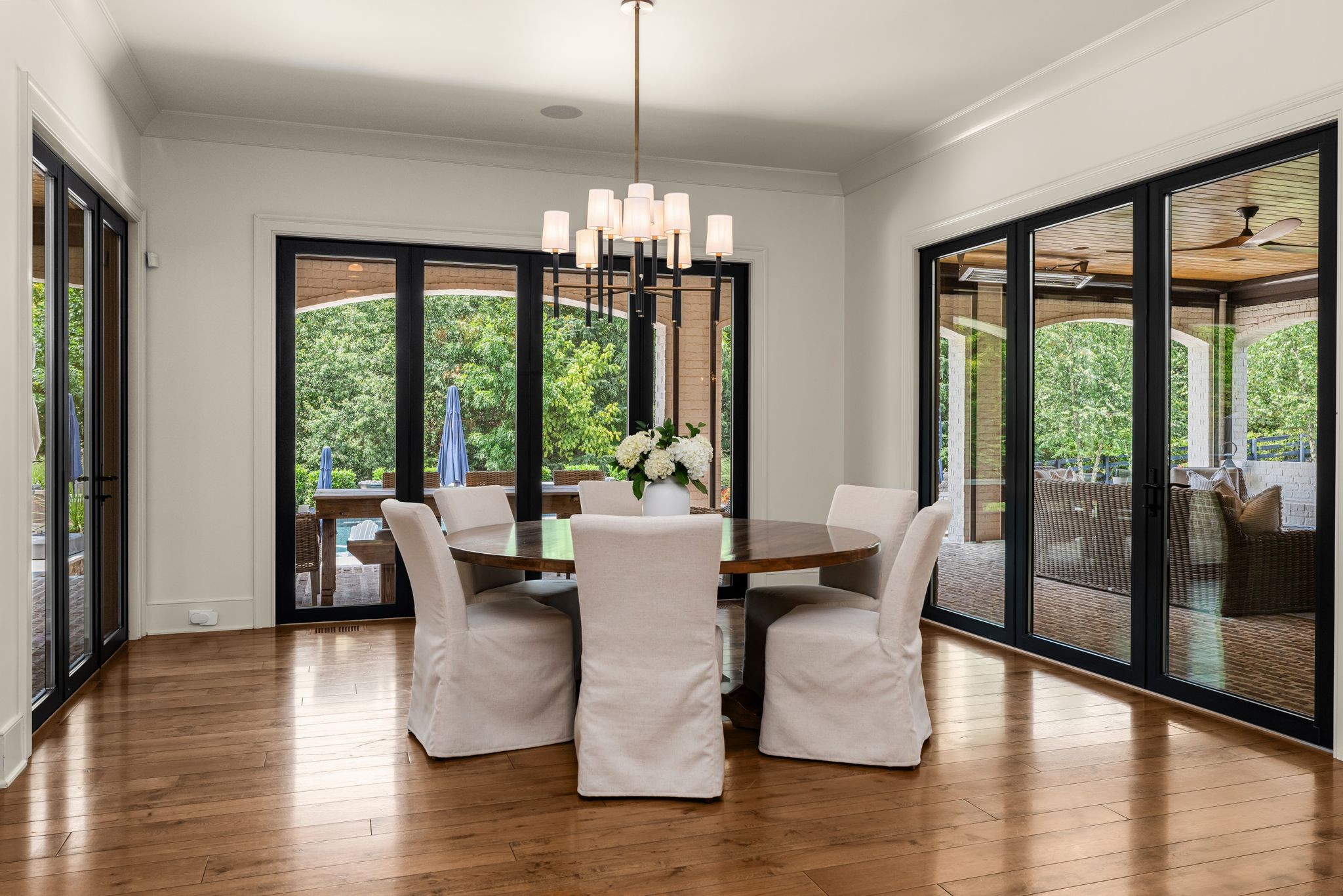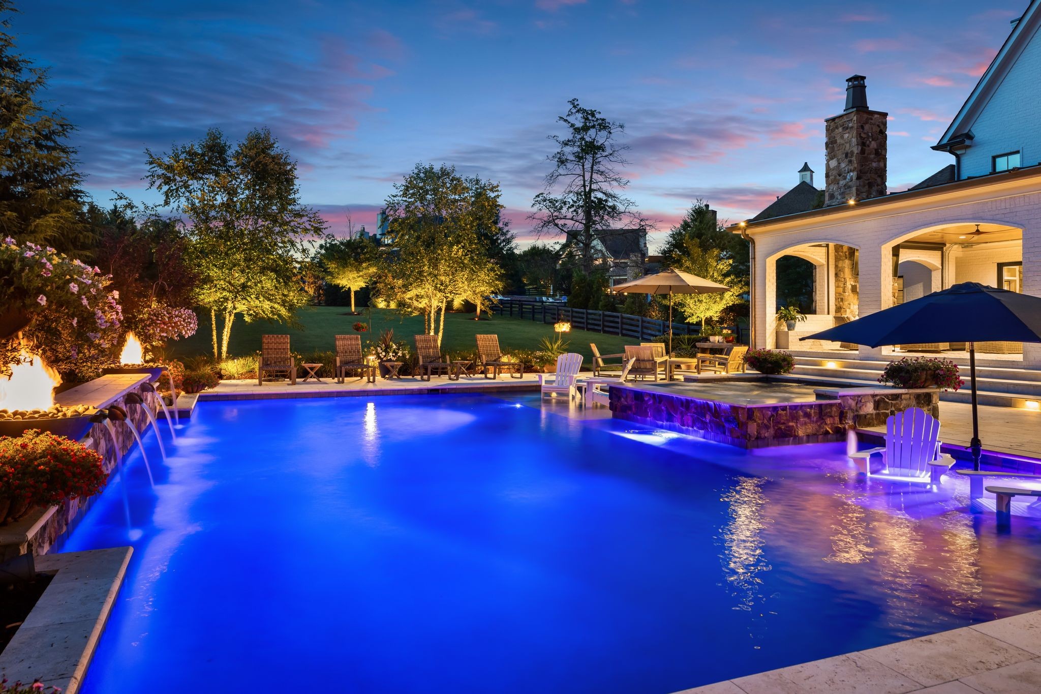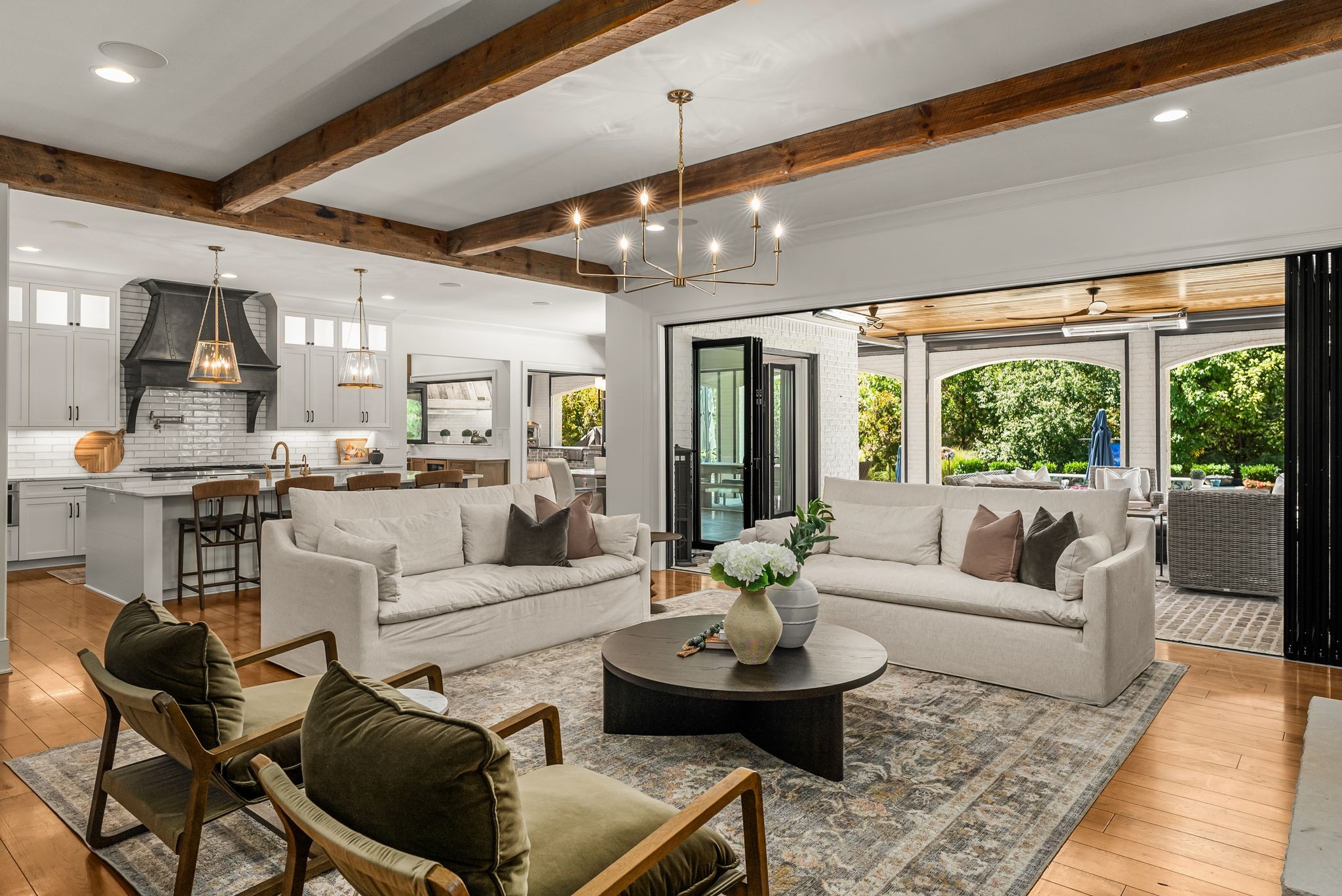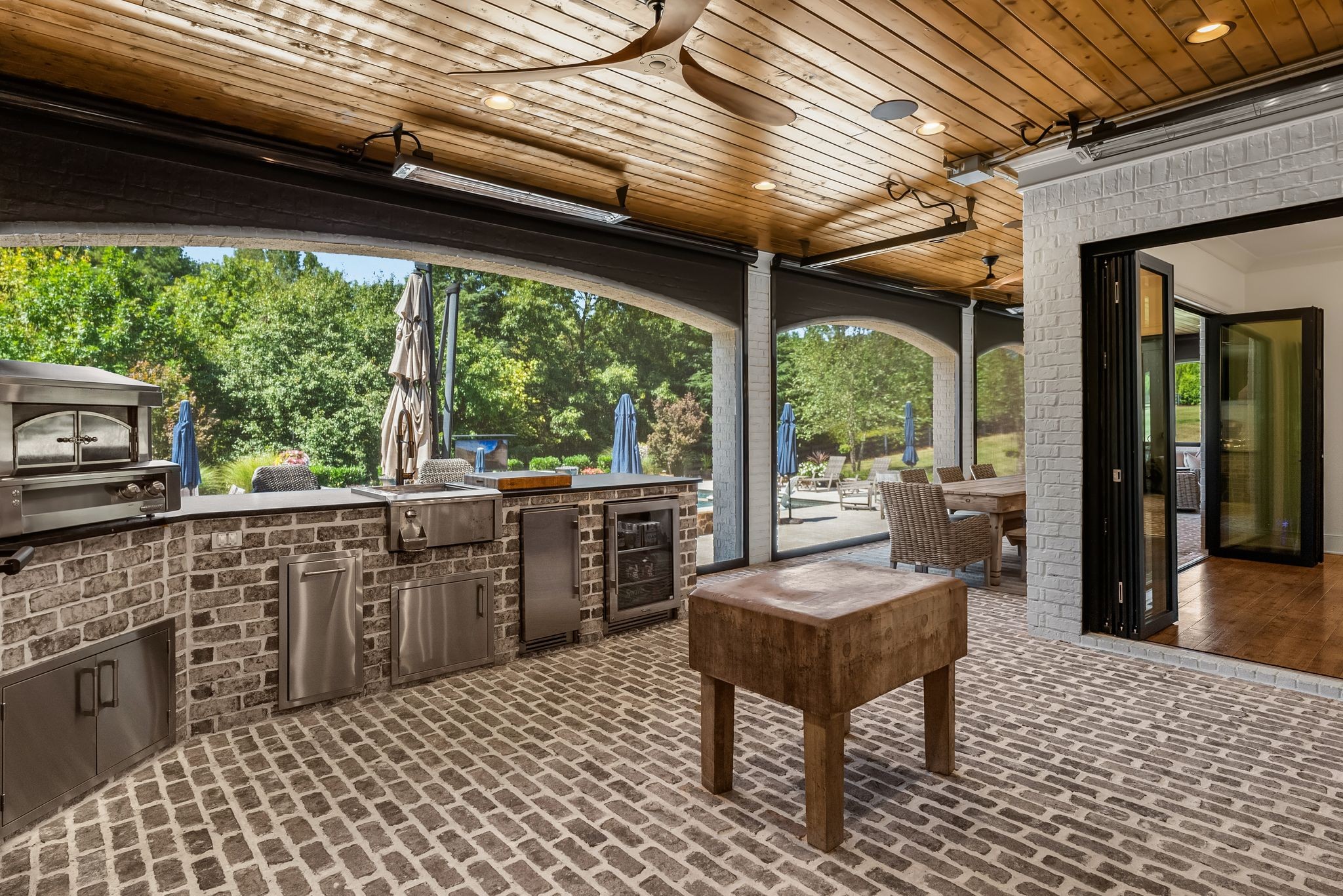 A defining highlight of the estate is its extraordinary 1,500‑square‑foot outdoor living space, crafted as a true extension of the home. The entire back façade opens completely to the outdoors, creating a harmonious connection between interior luxury and the natural surroundings. This expansive area is enhanced with built‑in heaters, power shades, and multiple zones for lounging and dining, allowing year‑round enjoyment. Overlooking the grounds is a resort-style pool, surrounded by thoughtfully designed spaces that invite relaxation, connection, and celebration.