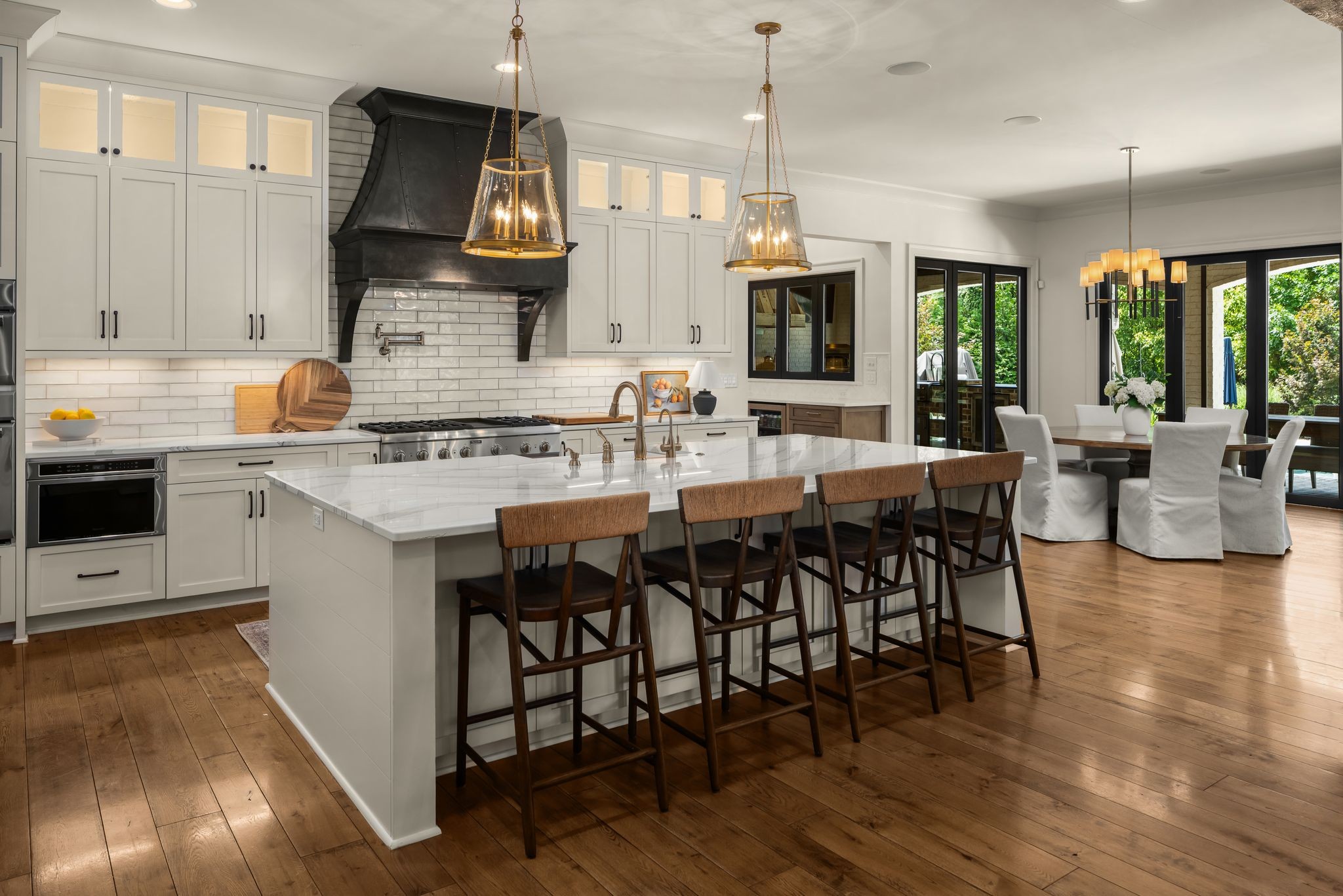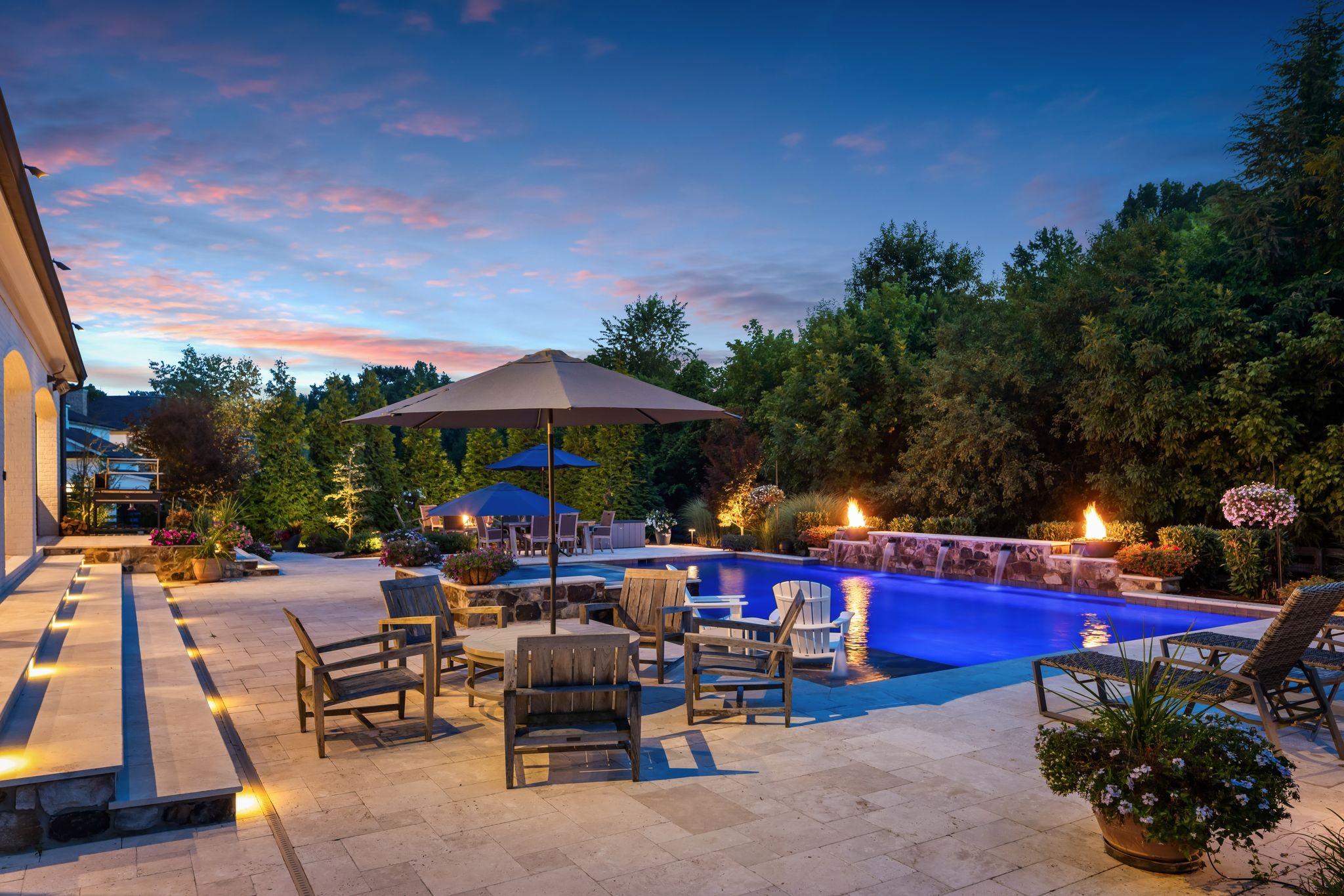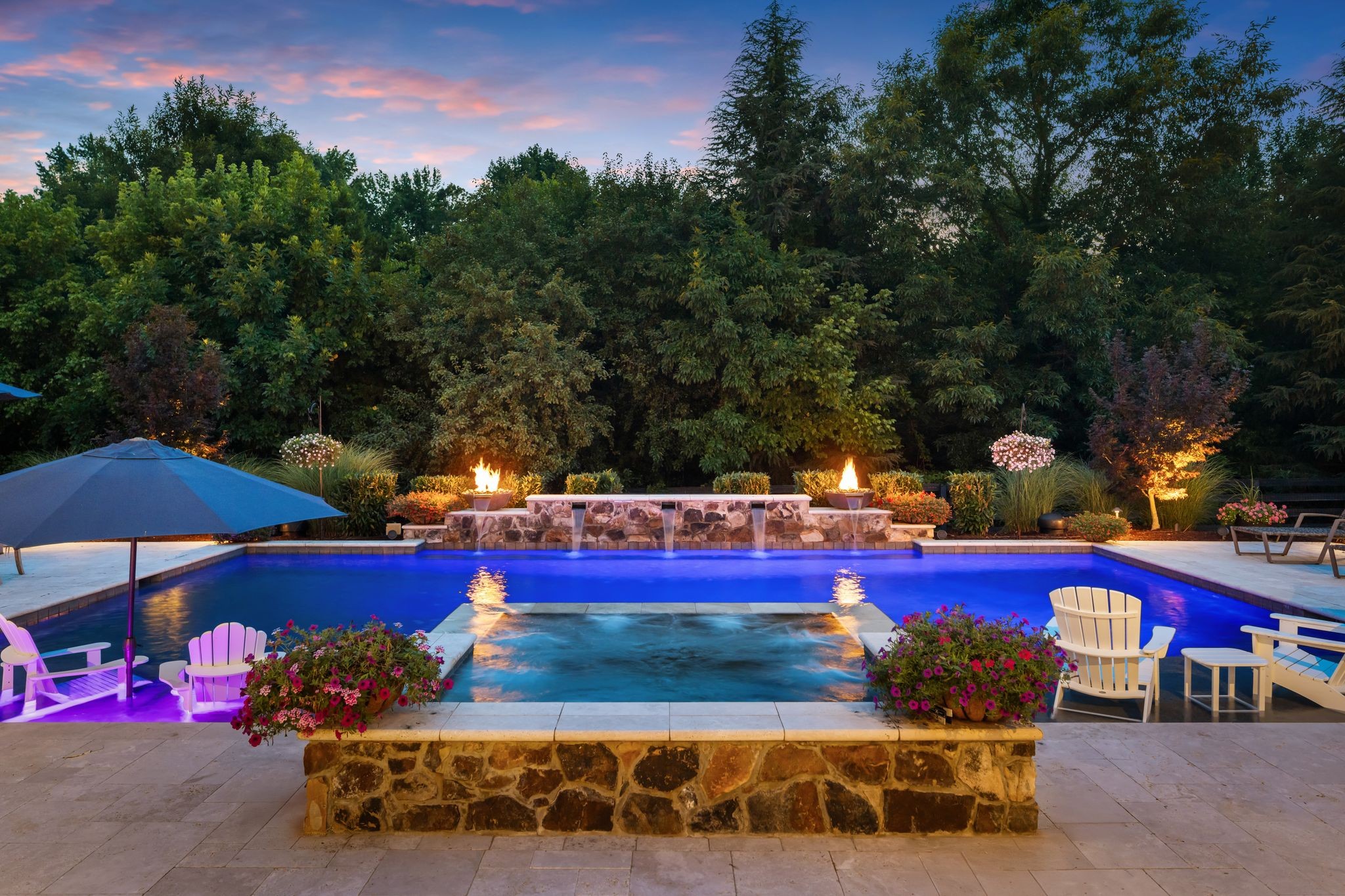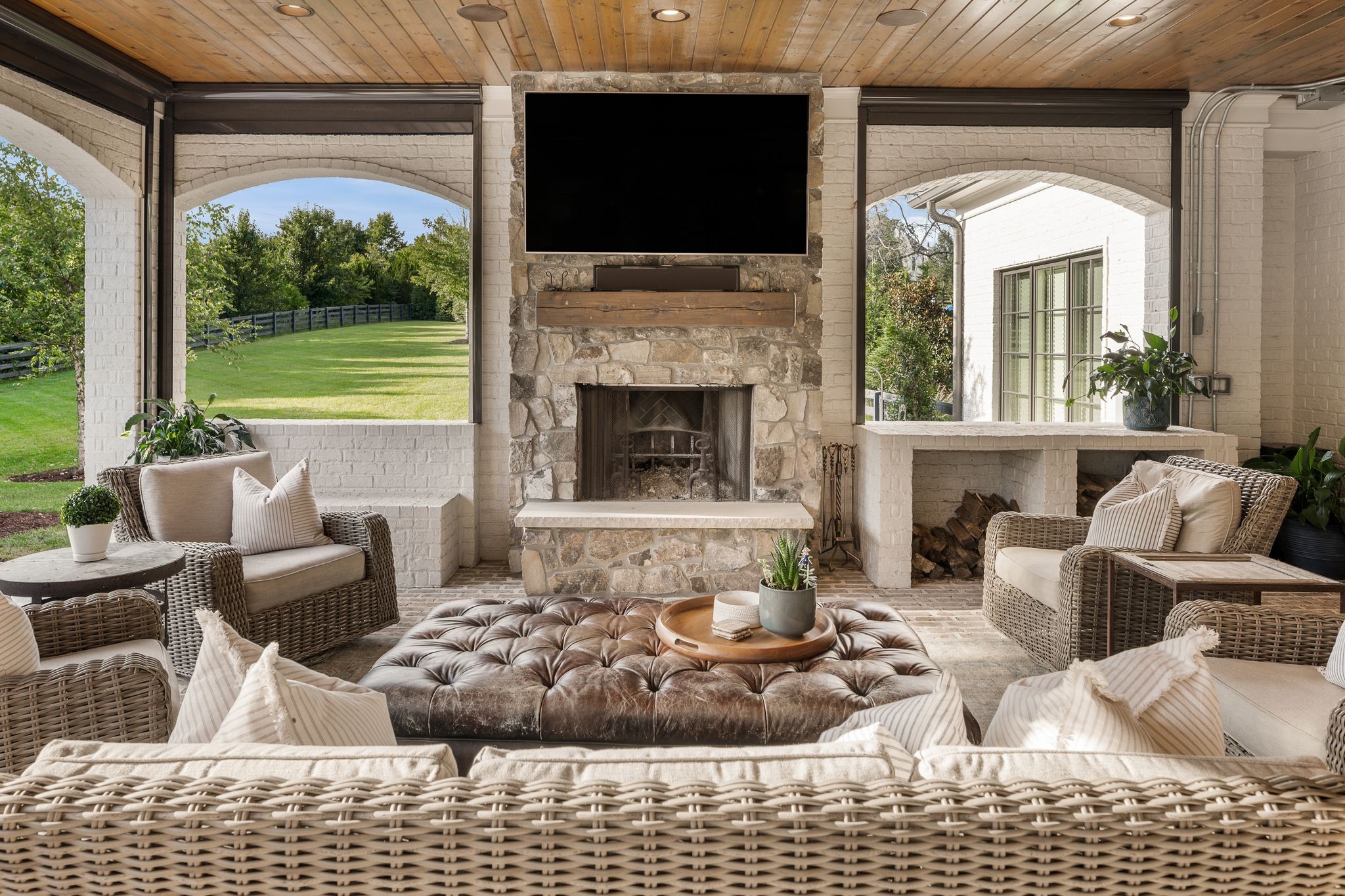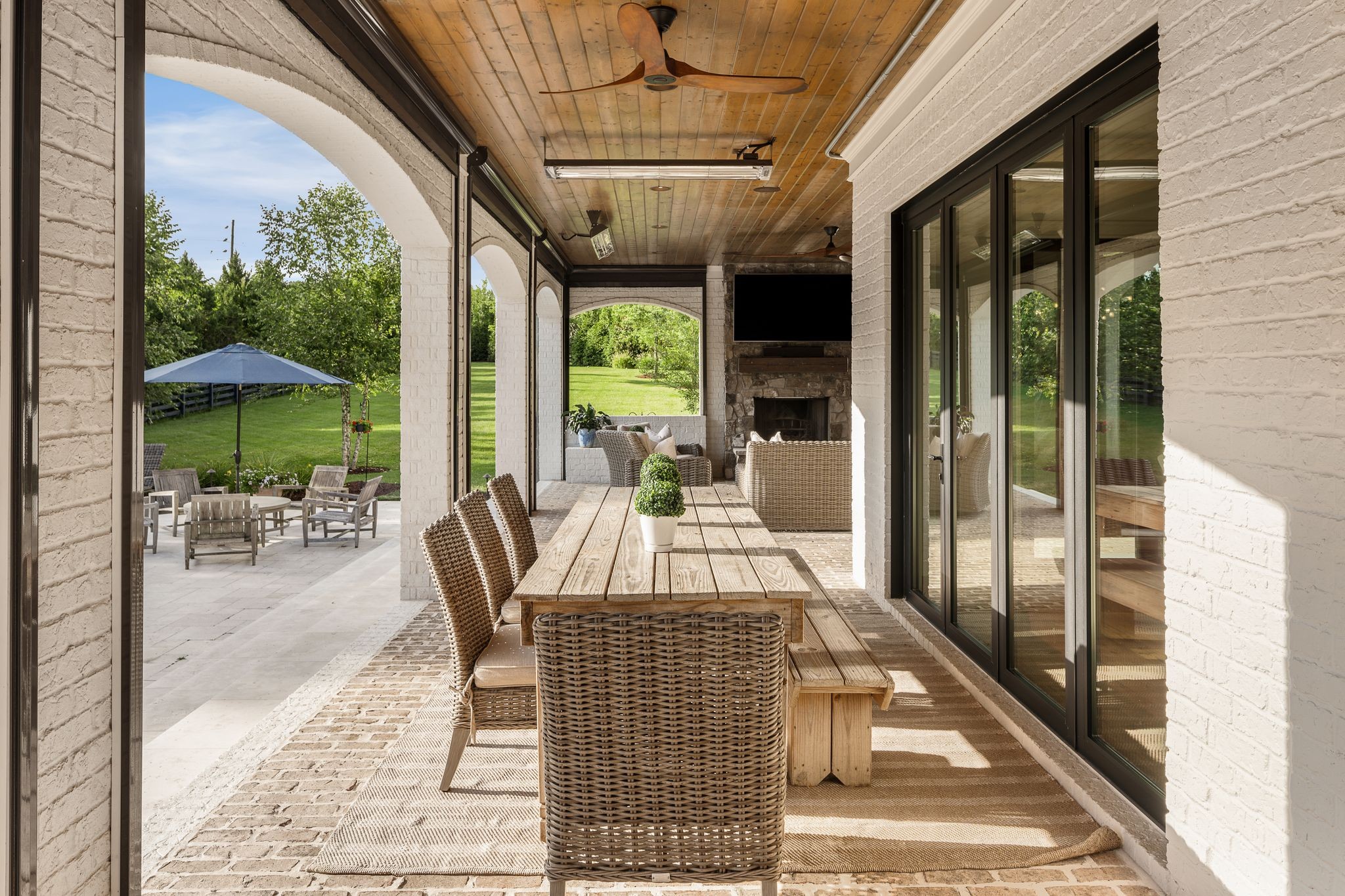 A defining highlight of the estate is its extraordinary 1,500‑square‑foot outdoor living space, crafted as a true extension of the home. The entire back façade opens completely to the outdoors, creating a harmonious connection between interior luxury and the natural surroundings. This expansive area is enhanced with built‑in heaters, power shades, and multiple zones for lounging and dining, allowing year‑round enjoyment. Overlooking the grounds is a resort-style pool, surrounded by thoughtfully designed spaces that invite relaxation, connection, and celebration.