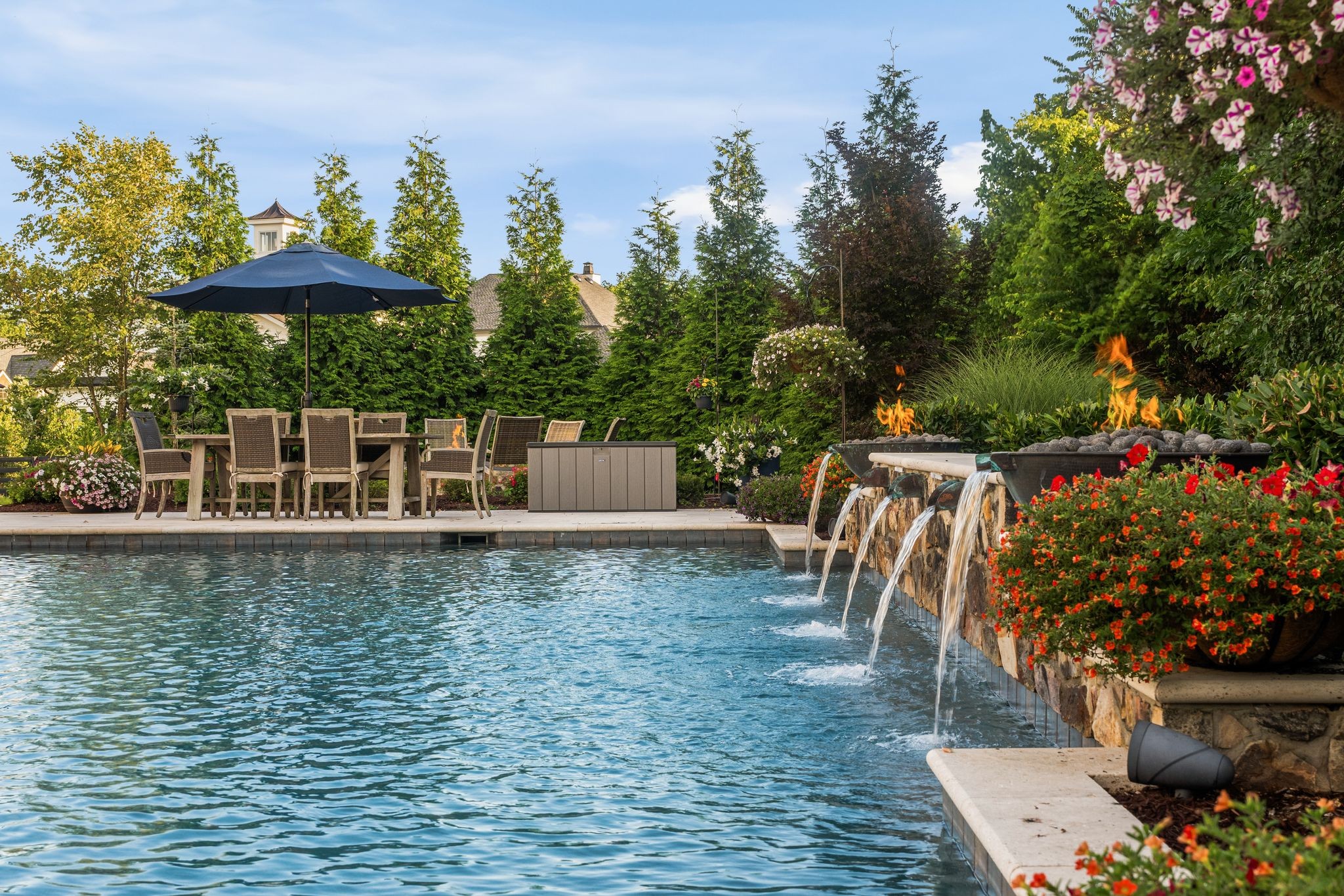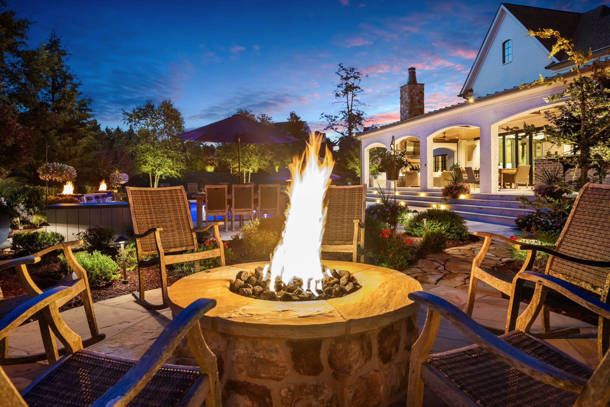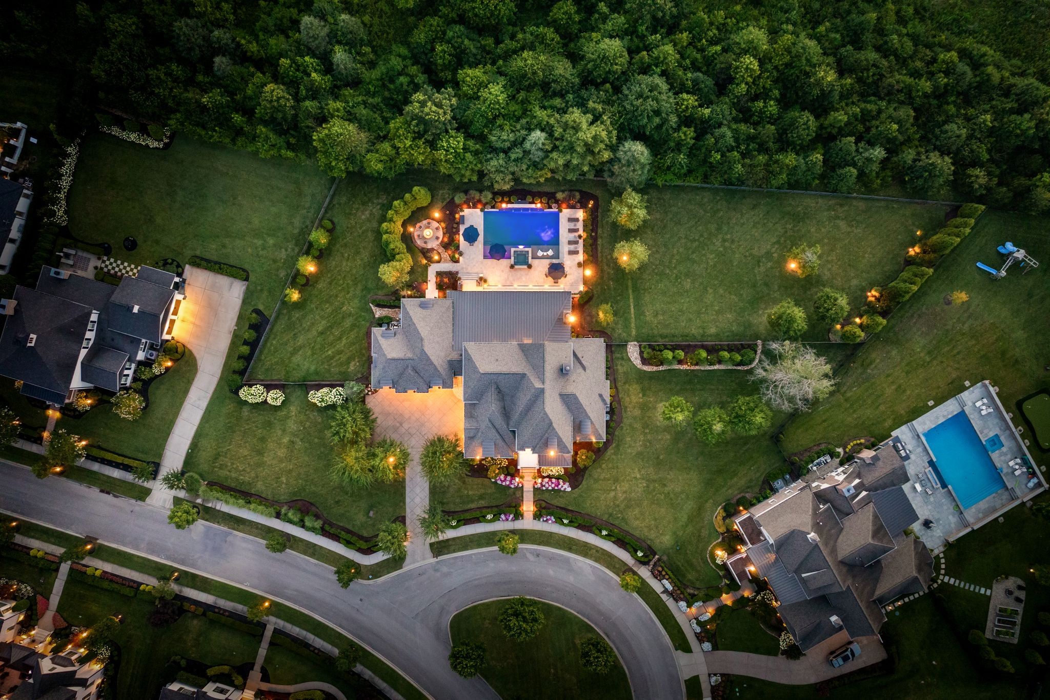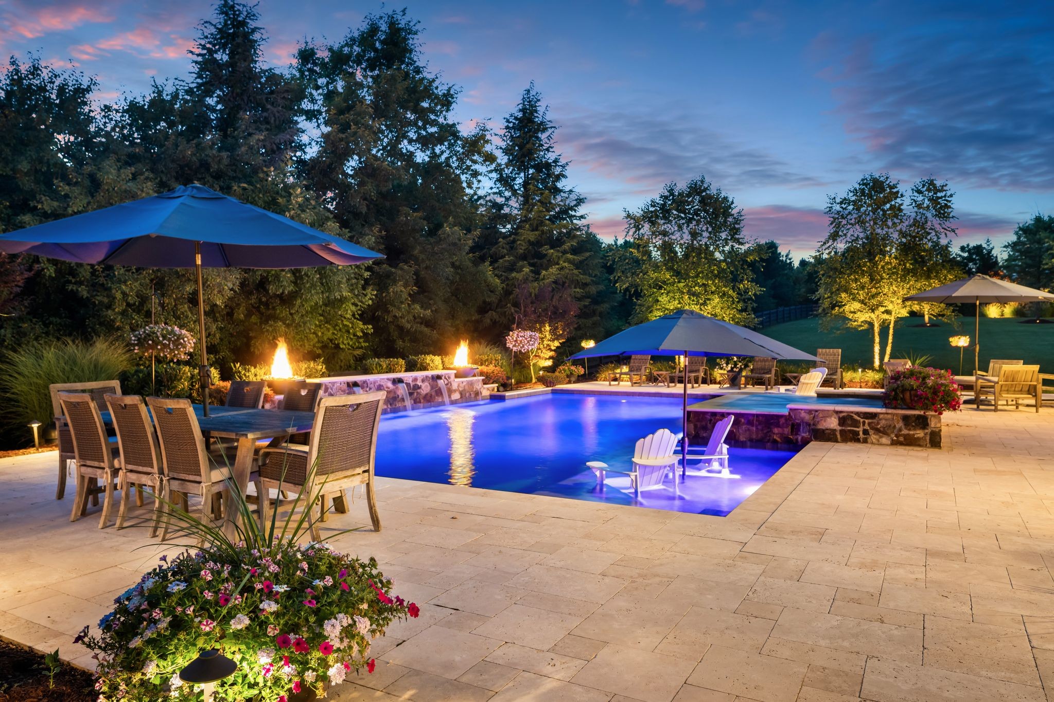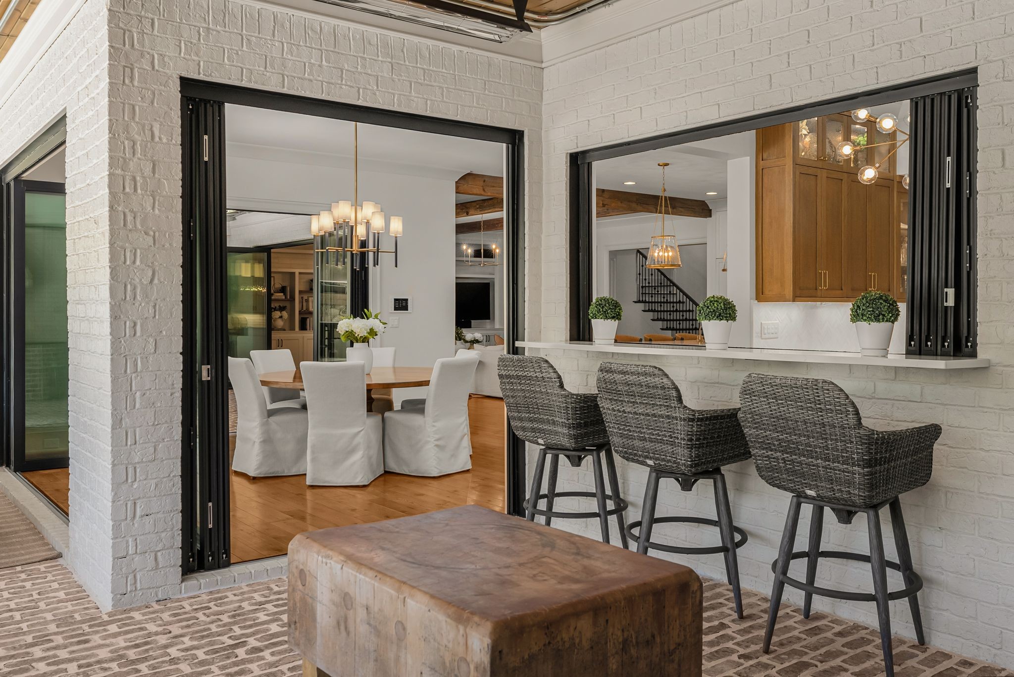 A defining highlight of the estate is its extraordinary 1,500‑square‑foot outdoor living space, crafted as a true extension of the home. The entire back façade opens completely to the outdoors, creating a harmonious connection between interior luxury and the natural surroundings. This expansive area is enhanced with built‑in heaters, power shades, and multiple zones for lounging and dining, allowing year‑round enjoyment. Overlooking the grounds is a resort-style pool, surrounded by thoughtfully designed spaces that invite relaxation, connection, and celebration.