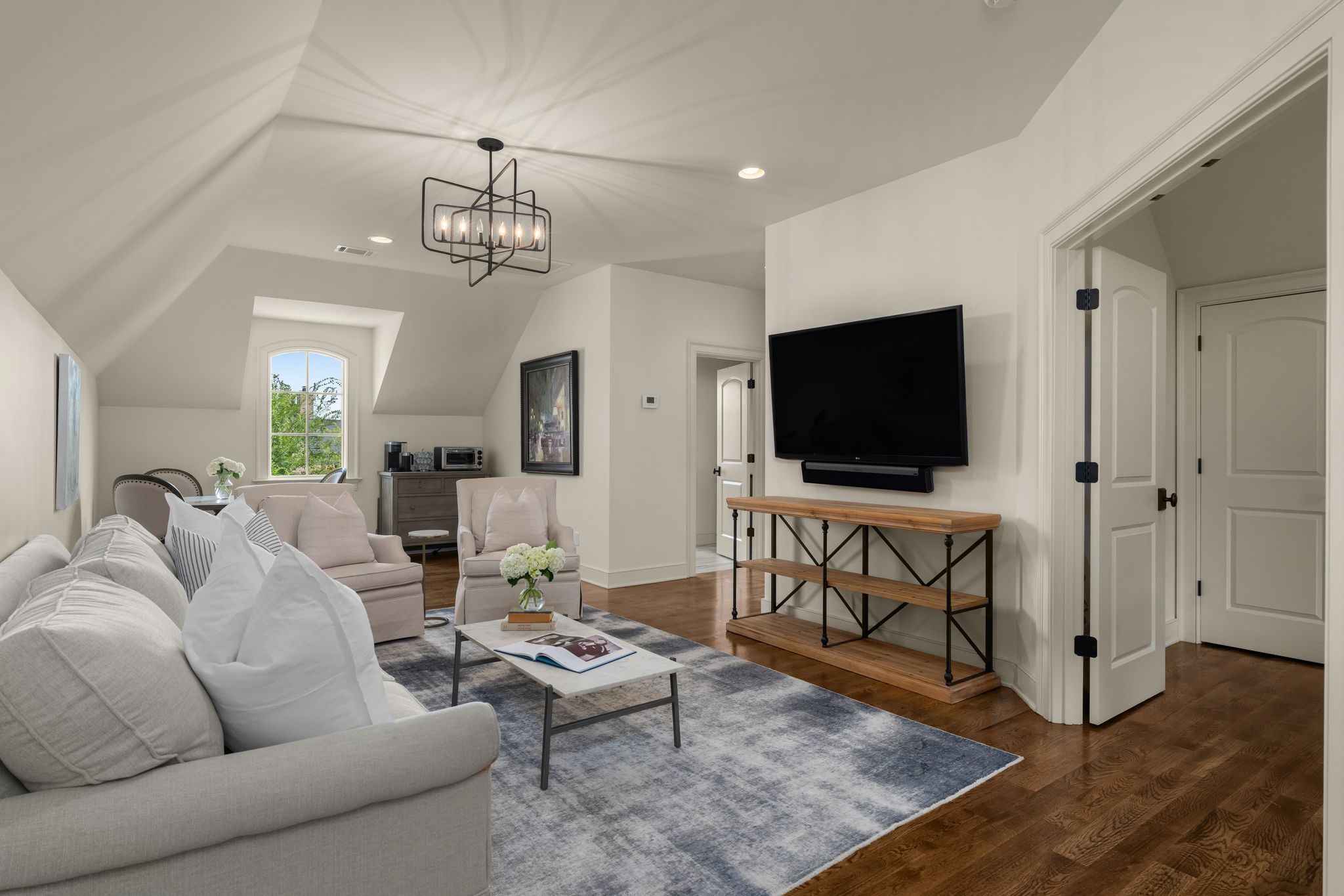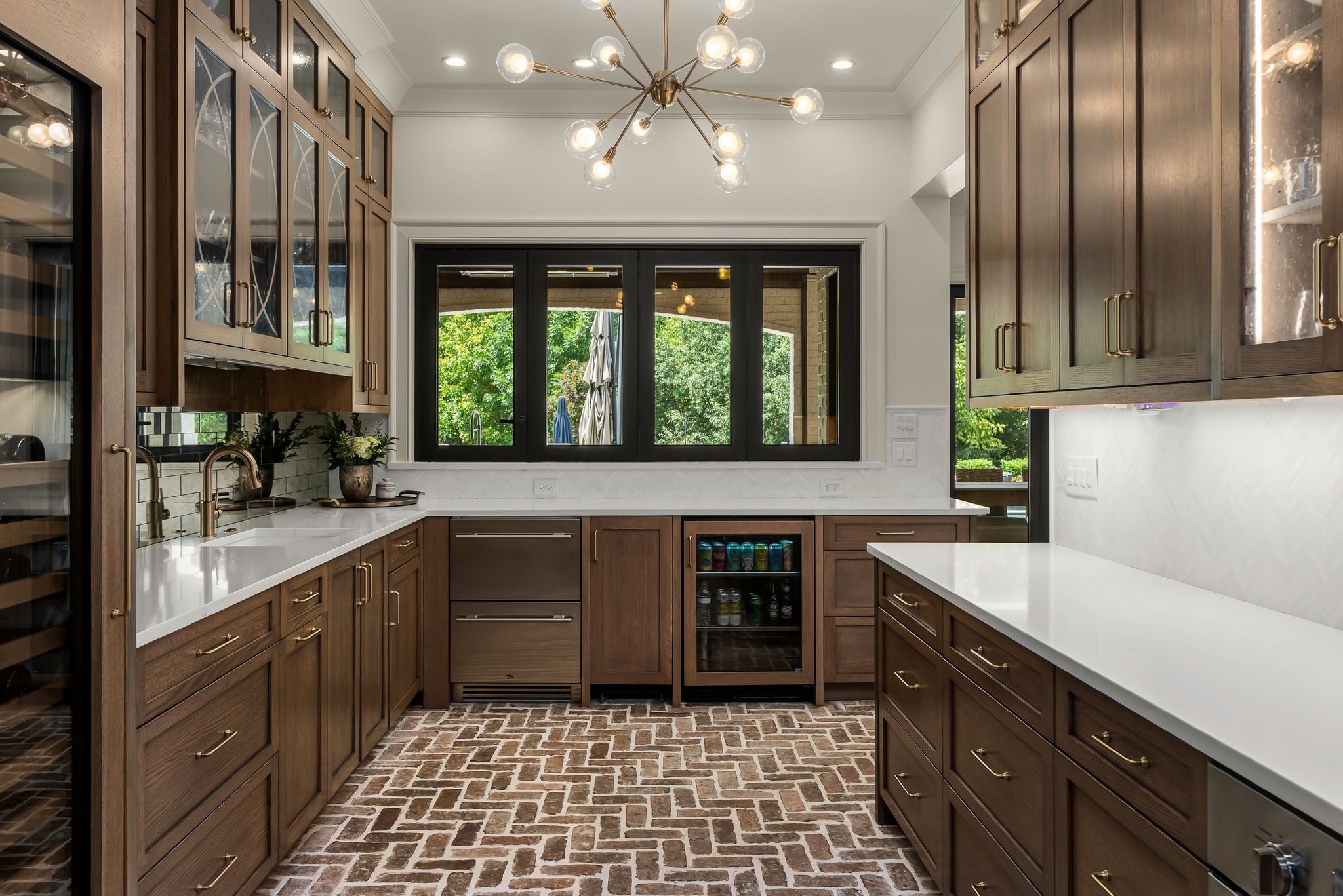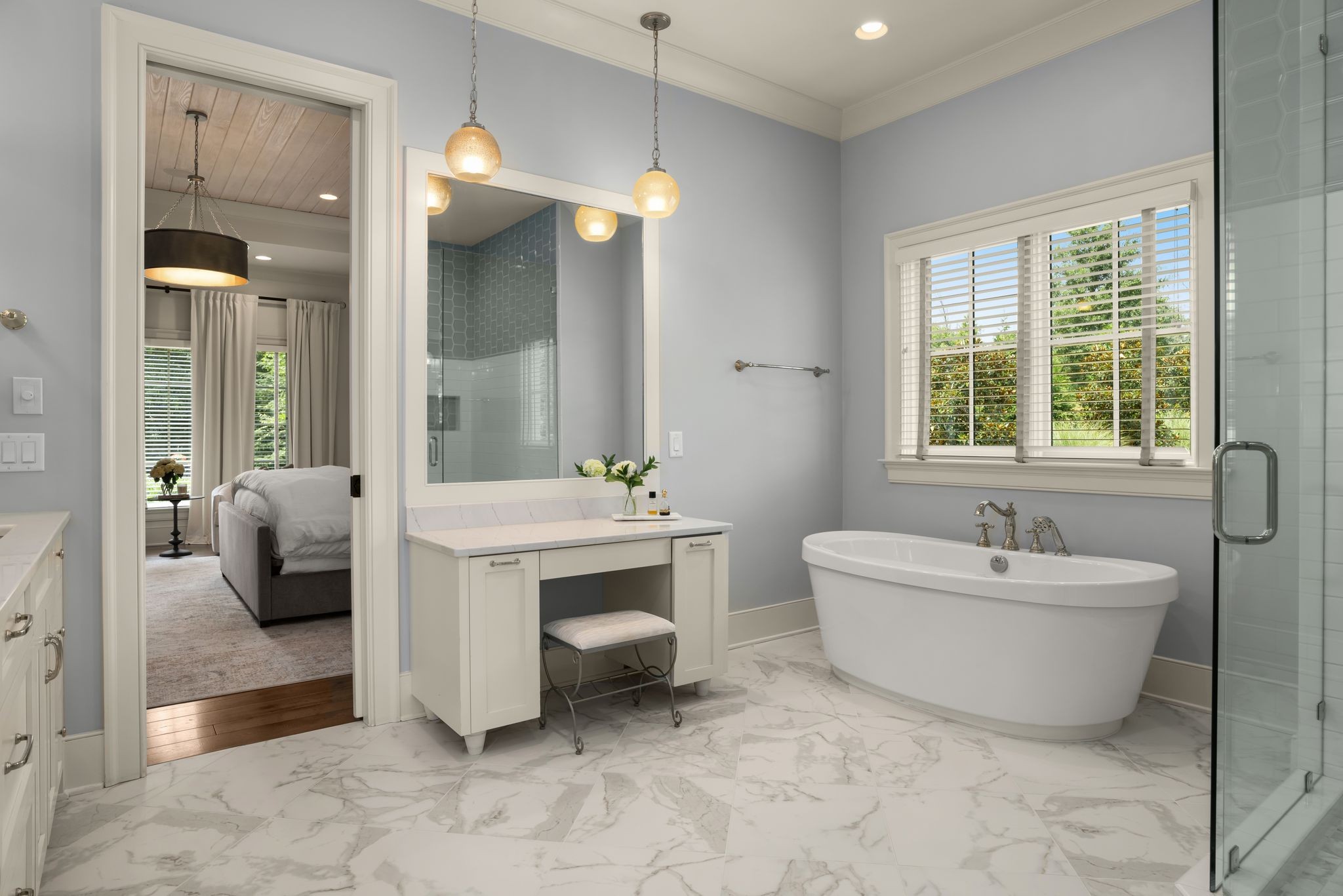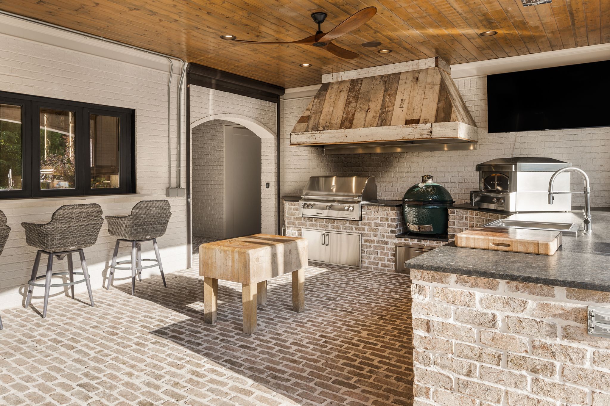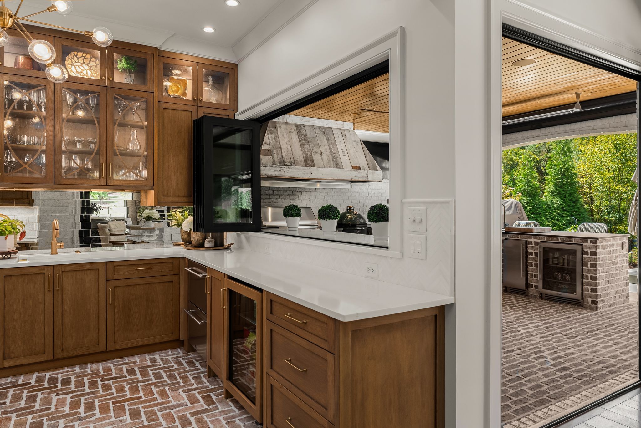A defining highlight of the estate is its extraordinary 1,500‑square‑foot outdoor living space, crafted as a true extension of the home. The entire back façade opens completely to the outdoors, creating a harmonious connection between interior luxury and the natural surroundings. This expansive area is enhanced with built‑in heaters, power shades, and multiple zones for lounging and dining, allowing year‑round enjoyment. Overlooking the grounds is a resort-style pool, surrounded by thoughtfully designed spaces that invite relaxation, connection, and celebration.