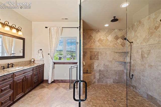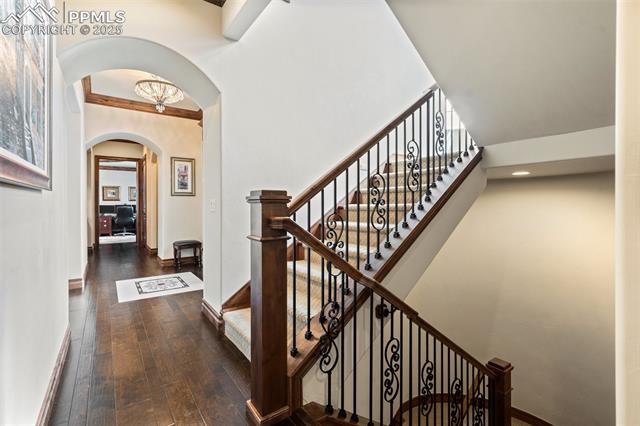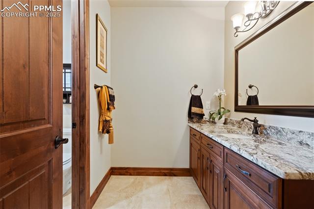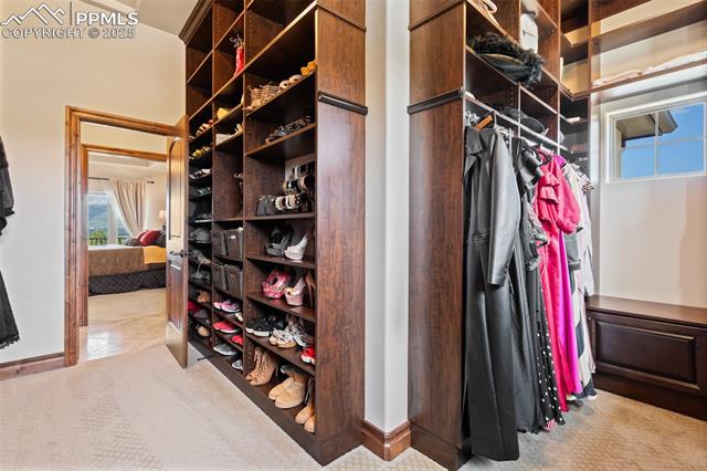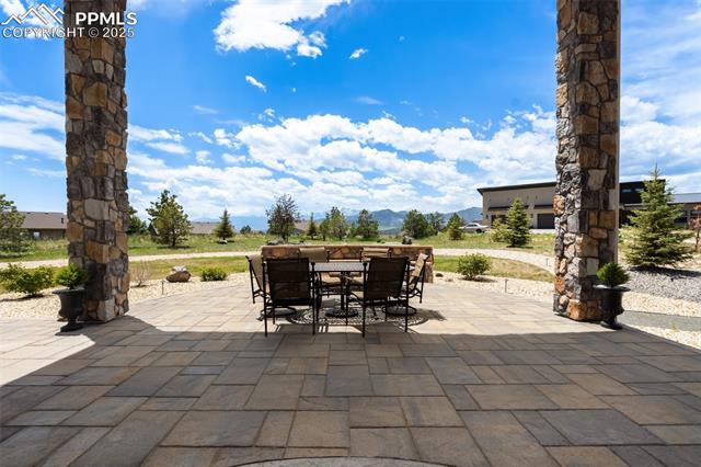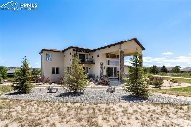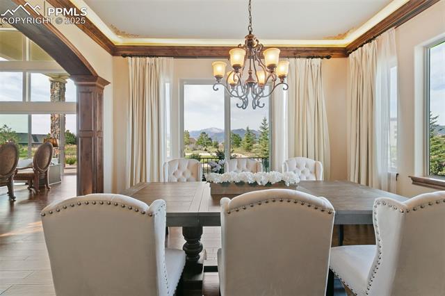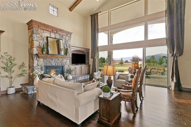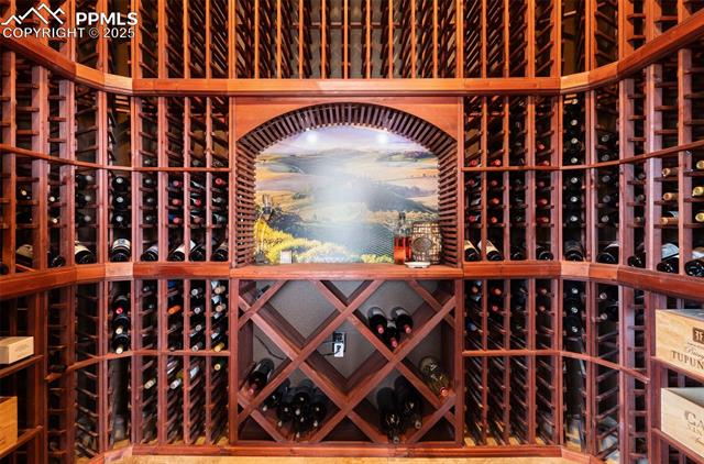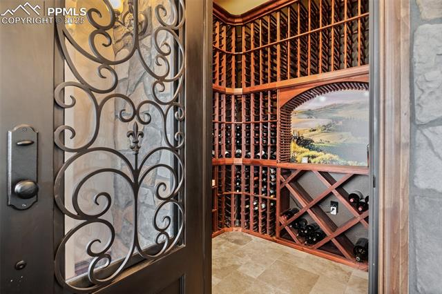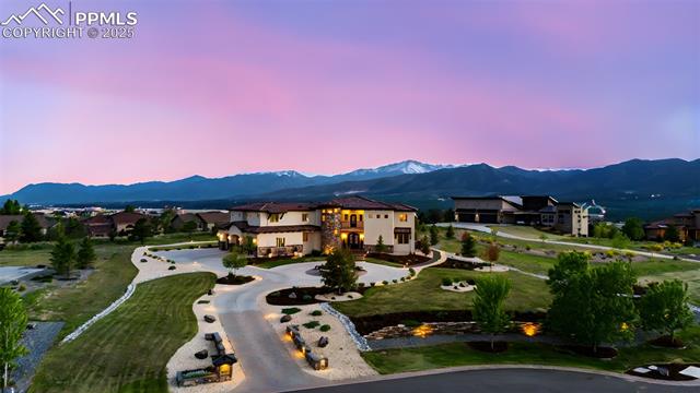 Welcome to the pinnacle of luxury living in the gated Village of Toscano, an exclusive retreat within Flying Horse. This custom Tuscany inspired home offers 7 bedrooms, 5 baths, and approximately 6500 square feet of living space on 1.45 acres of professionally landscaped grounds. The moment you arrive, the stone exterior, circular driveway, and stone gas fire pit create a captivating first impression. The outdoor areas are inviting with a pond less water feature and an additional stone gas firepit, perfect for Colorado evenings with unforgettable views. Inside, the home reveals extraordinary craftsmanship with handcrafted wood details and rich architectural elements. A 23 foot vaulted beam ceiling frames a direct view of Pikes Peak, creating a dramatic focal point as you step inside. Nearly every space offers sweeping views of Pikes Peak, the Front Range, the USAF Academy, and the Tom Weiskopf designed course at Flying Horse. The independently temperature controlled wine room is a showcase with space for 1000+ bottles. Storage throughout the home is impressive, and the oversized four car garage provides generous room for vehicles. Both the main and lower levels feature ten foot ceilings and eight foot doors, giving the residence an open and elegant feel. The home is designed for a future private elevator, now appointed as expansive storage areas. The primary suite is a private retreat with a fireplace, integrated entertainment, and unobstructed mountain views. The five piece bath features a freestanding tub, two vanities, a zero entry spa shower, and a spacious walk in closet with custom built dressers over ten feet long. This residence offers a blend of privacy and convenience, located minutes from I25, Powers Blvd, dining, shopping, parks, award winning D20 schools, the Ford amphitheater, and the Flying Horse Clubhouse and Steakhouse. Experience timeless craftsmanship, stunning views, and luxury living in one of Colorado Springs most sought after communities.
