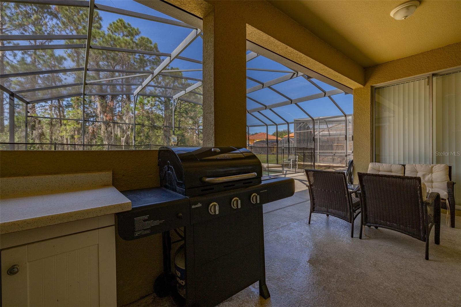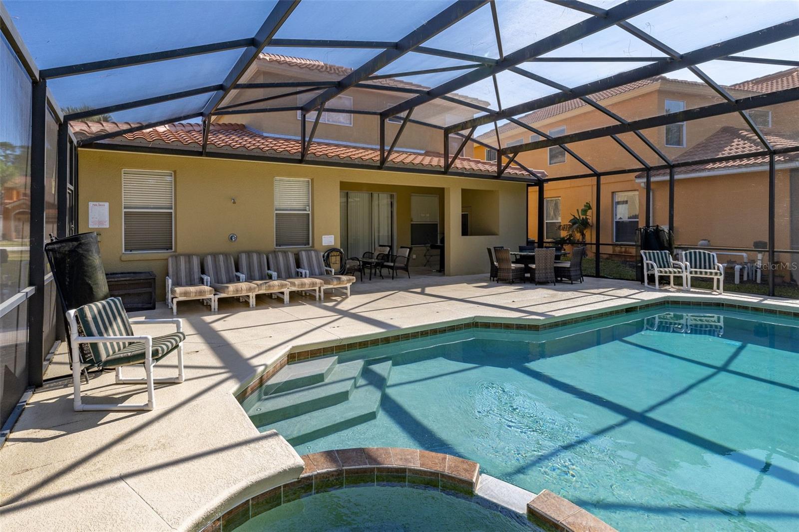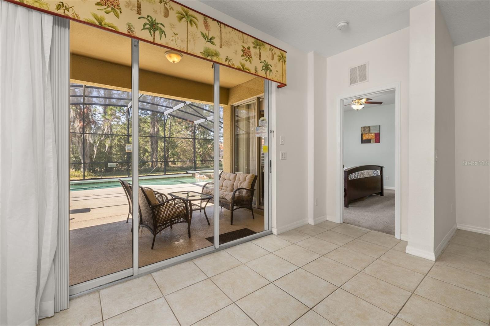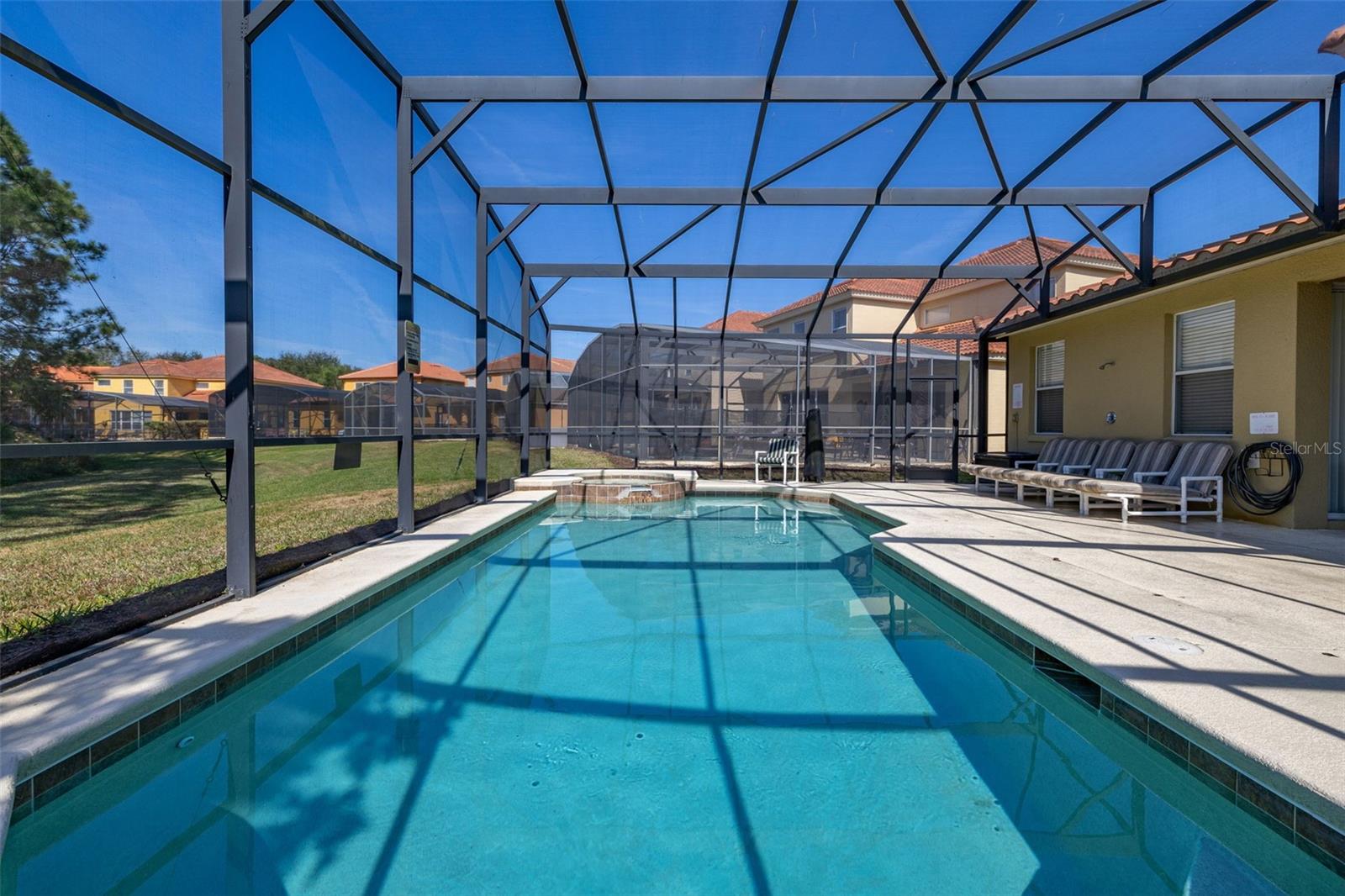 Step outside to the covered lanai, accessible through a three-panel sliding glass door, and enjoy the optional poolside half bath. The expansive screened pool deck includes a large private pool and in-ground spa, perfectly positioned to soak in peaceful pond and woodland views. A professional pool safety fence is installed, and the pool heater guarantees comfort year-round.