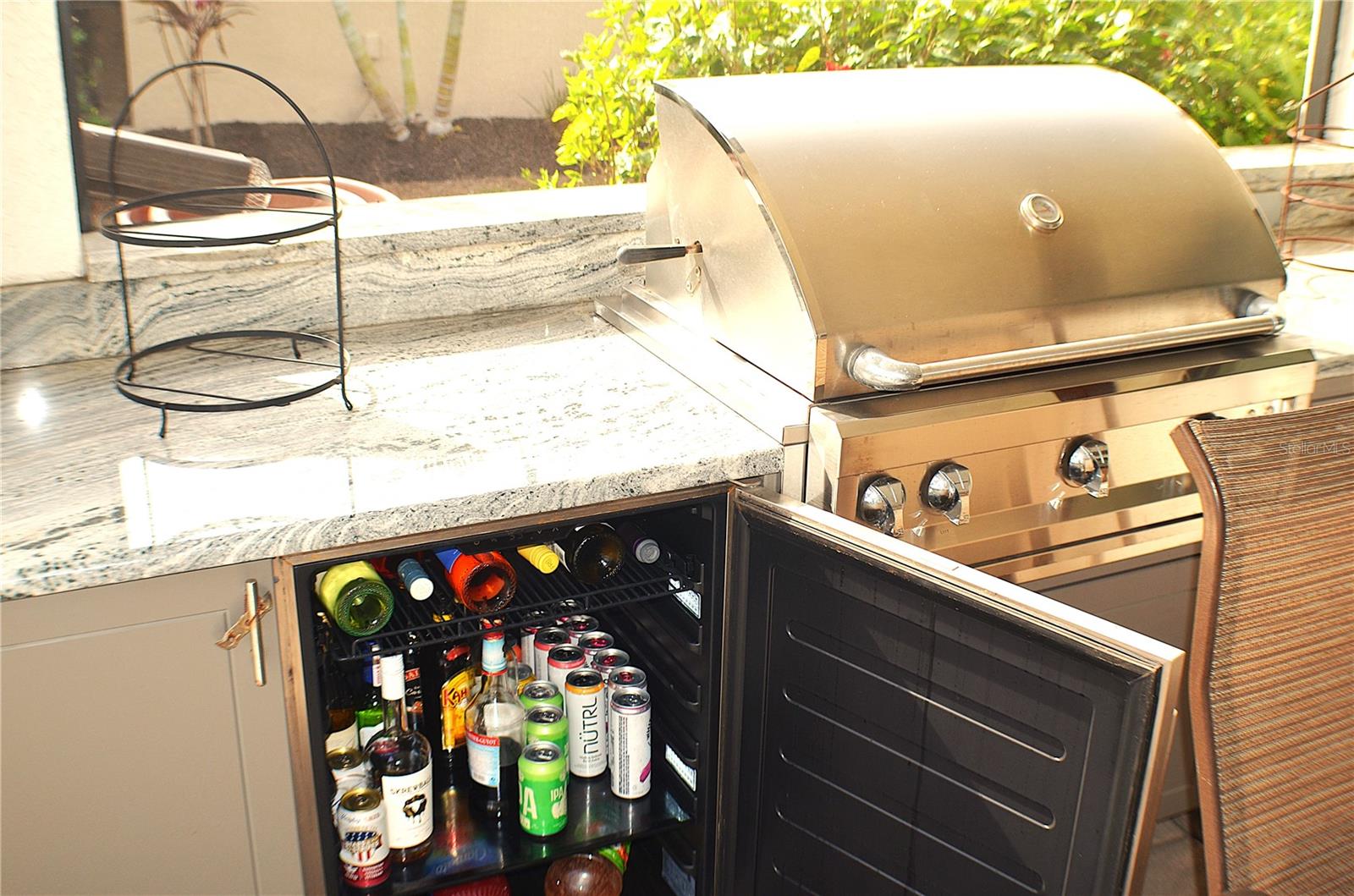 Slide back the triple glass doors, and the home transforms. An expanded covered lanai leads to a private, resort-inspired outdoor retreat: heated pool with sun shelf, tranquil water features, and lush tropical landscaping that shields the space with movement and color. The outdoor kitchen brings the entire area to life, letting you cook, serve, and host poolside without ever stepping indoors. When the early light hits the water and the lake beyond the screen, the scene borders on cinematic.