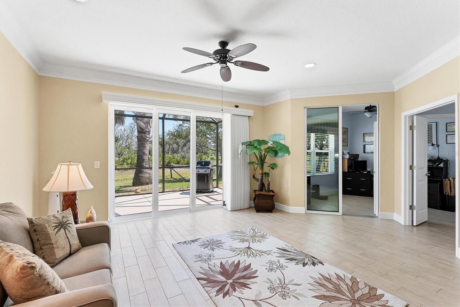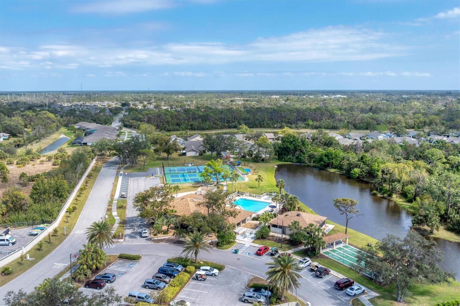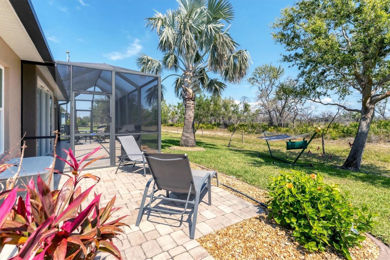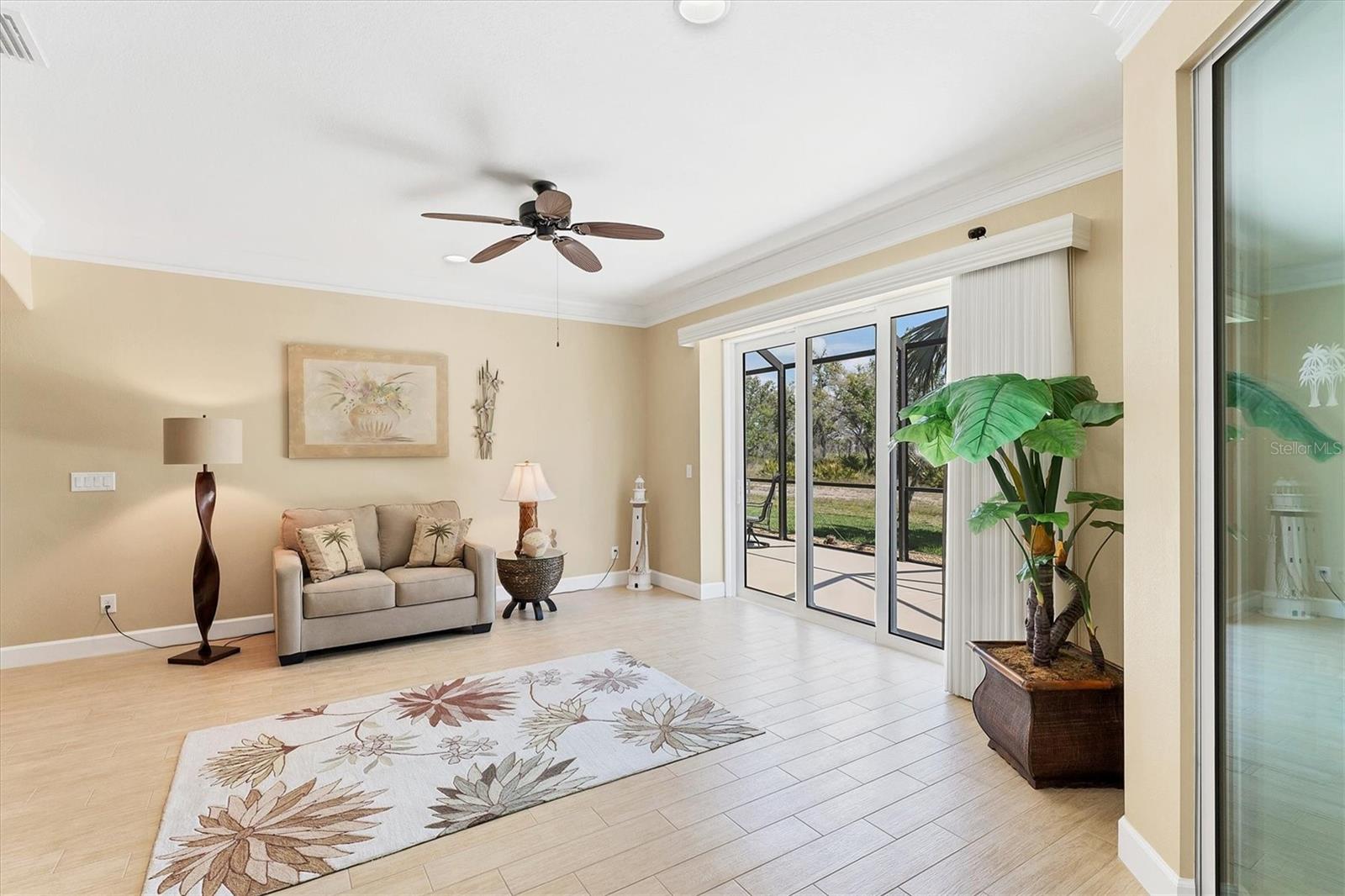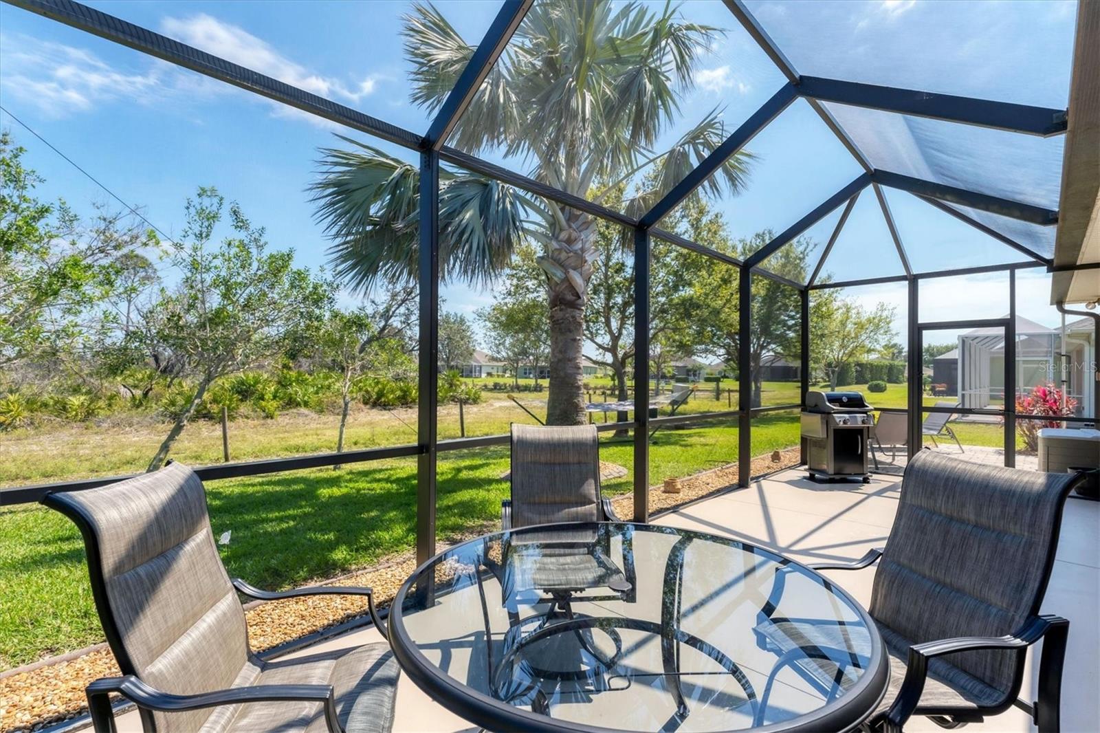 Live the Good Life in Park Forest - A Golf Cart Friendly 55+ Gated Community with Wildlife & Activities! This beautifully maintained, one-owner Pearl Model designed home offers three bedrooms, two bathrooms, an oversized two-car garage, and is in the X flood zone. Thoughtfully updated with comfort and style in mind, it’s located in one of Englewood’s most sought-after 55+ communities. Outside, you’ll appreciate the paver driveway, hurricane rated insulated garage door with power screening, mature landscaping, and no-see-um screened entry. Step inside through the decorative leaded glass front door into a bright, open space featuring top-tier wood-look tile flooring throughout, crown molding, custom window treatments, impact windows and doors, an accordion shutter for the front entry, and a 2023 A/C system with ionizer. The spacious kitchen opens to the great room and features cream-colored wood soft-close cabinets with custom handles, granite countertops, under-cabinet lighting, stainless steel appliances, and a raised breakfast bar. A dry bar and closet pantry in the adjoining casual kitchen cafe area provide additional storage and convenience. Sliding glass doors and a formal dining area in the great room offer plenty of space for entertaining. Double doors lead to the ensuite master retreat, complete with a tray ceiling, plant shelves, a large walk-in closet, and convenient access to the study/home office area. The master bathroom showcases a custom-designed dual sink vanity with ample countertop space and storage, along with a fully tiled, glass-enclosed walk-in shower. The guest bedrooms feature reach-in closets, and the well-appointed guest bath includes a tiled shower/tub combo and a granite-topped vanity. The interior laundry room is equipped with built-in cabinets and a utility sink for added convenience. The garage was designed with space in mind and extended to accommodate a workshop and additional storage options and pull down stair access to the floored attic with lighting provides even more storage opportunities. Outside, the extended screened lanai offers a peaceful wooded view, where you may spot turkeys, sandhill cranes and their chicks, deer, and a variety of birds that frequent the preserve and conservation area behind the home. An open-air paver patio makes grilling and dining al fresco a breeze, while the outdoor shower with both hot and cold water adds a touch of luxury to your outdoor living - ideal for rinsing off in comfort anytime you like. Park Forest is a vibrant 55+ gated community in Englewood, Florida, offering a variety of recreational amenities and social activities. Residents have access to a variety of amenities including a pool, spa, tennis and shuffleboard courts, and a clubhouse for social events and gatherings. Need space for your toys? The community features convenient RV and boat storage. Ideally located just minutes from golf courses, world-class fishing, boating, and the stunning Gulf beaches. Nearby towns like Englewood, Venice, Wellen Park, and Sarasota offer an abundance of dining, cultural attractions, and shopping destinations. From potluck suppers to dinner dances, Park Forest’s social calendar is filled with activities, and there are plenty of opportunities for residents to get involved and volunteer. Don’t miss your chance to see this beautiful home, schedule your private showing today!