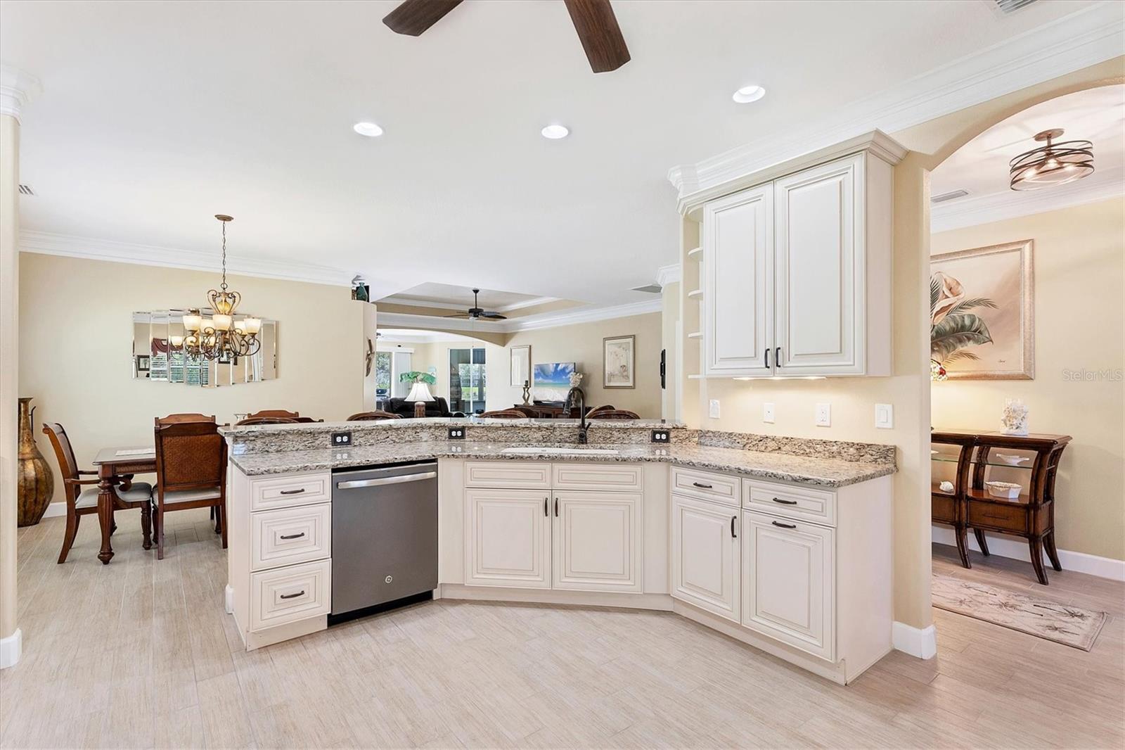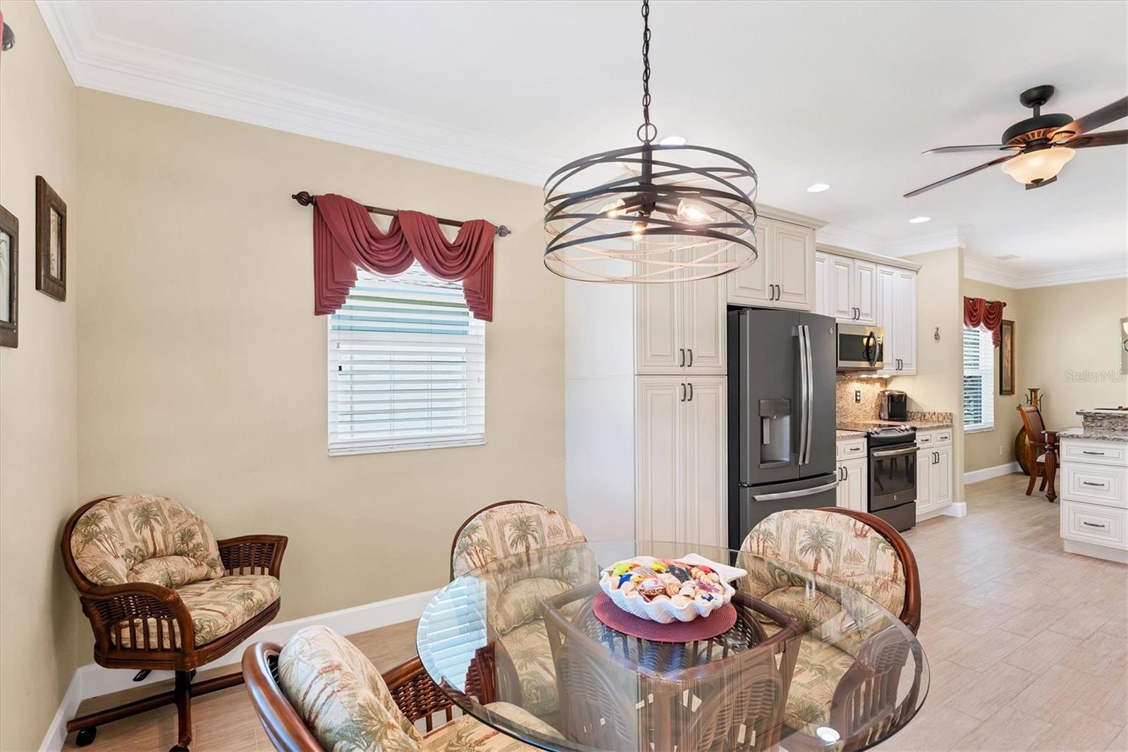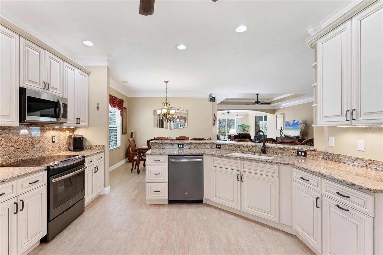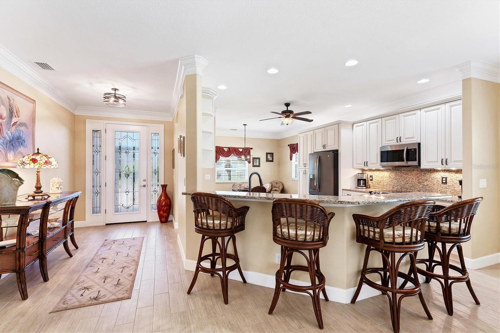 Live the Good Life in Park Forest - A Golf Cart Friendly 55+ Gated Community with Wildlife & Activities! This beautifully maintained, one-owner Pearl Model designed home offers three bedrooms, two bathrooms, an oversized two-car garage, and is in the X flood zone. Thoughtfully updated with comfort and style in mind, it’s located in one of Englewood’s most sought-after 55+ communities. Outside, you’ll appreciate the paver driveway, hurricane rated insulated garage door with power screening, mature landscaping, and no-see-um screened entry. Step inside through the decorative leaded glass front door into a bright, open space featuring top-tier wood-look tile flooring throughout, crown molding, custom window treatments, impact windows and doors, an accordion shutter for the front entry, and a 2023 A/C system with ionizer. The spacious kitchen opens to the great room and features cream-colored wood soft-close cabinets with custom handles, granite countertops, under-cabinet lighting, stainless steel appliances, and a raised breakfast bar. A dry bar and closet pantry in the adjoining casual kitchen cafe area provide additional storage and convenience. Sliding glass doors and a formal dining area in the great room offer plenty of space for entertaining. Double doors lead to the ensuite master retreat, complete with a tray ceiling, plant shelves, a large walk-in closet, and convenient access to the study/home office area. The master bathroom showcases a custom-designed dual sink vanity with ample countertop space and storage, along with a fully tiled, glass-enclosed walk-in shower. The guest bedrooms feature reach-in closets, and the well-appointed guest bath includes a tiled shower/tub combo and a granite-topped vanity. The interior laundry room is equipped with built-in cabinets and a utility sink for added convenience. The garage was designed with space in mind and extended to accommodate a workshop and additional storage options and pull down stair access to the floored attic with lighting provides even more storage opportunities. Outside, the extended screened lanai offers a peaceful wooded view, where you may spot turkeys, sandhill cranes and their chicks, deer, and a variety of birds that frequent the preserve and conservation area behind the home. An open-air paver patio makes grilling and dining al fresco a breeze, while the outdoor shower with both hot and cold water adds a touch of luxury to your outdoor living - ideal for rinsing off in comfort anytime you like. Park Forest is a vibrant 55+ gated community in Englewood, Florida, offering a variety of recreational amenities and social activities. Residents have access to a variety of amenities including a pool, spa, tennis and shuffleboard courts, and a clubhouse for social events and gatherings. Need space for your toys? The community features convenient RV and boat storage. Ideally located just minutes from golf courses, world-class fishing, boating, and the stunning Gulf beaches. Nearby towns like Englewood, Venice, Wellen Park, and Sarasota offer an abundance of dining, cultural attractions, and shopping destinations. From potluck suppers to dinner dances, Park Forest’s social calendar is filled with activities, and there are plenty of opportunities for residents to get involved and volunteer. Don’t miss your chance to see this beautiful home, schedule your private showing today!