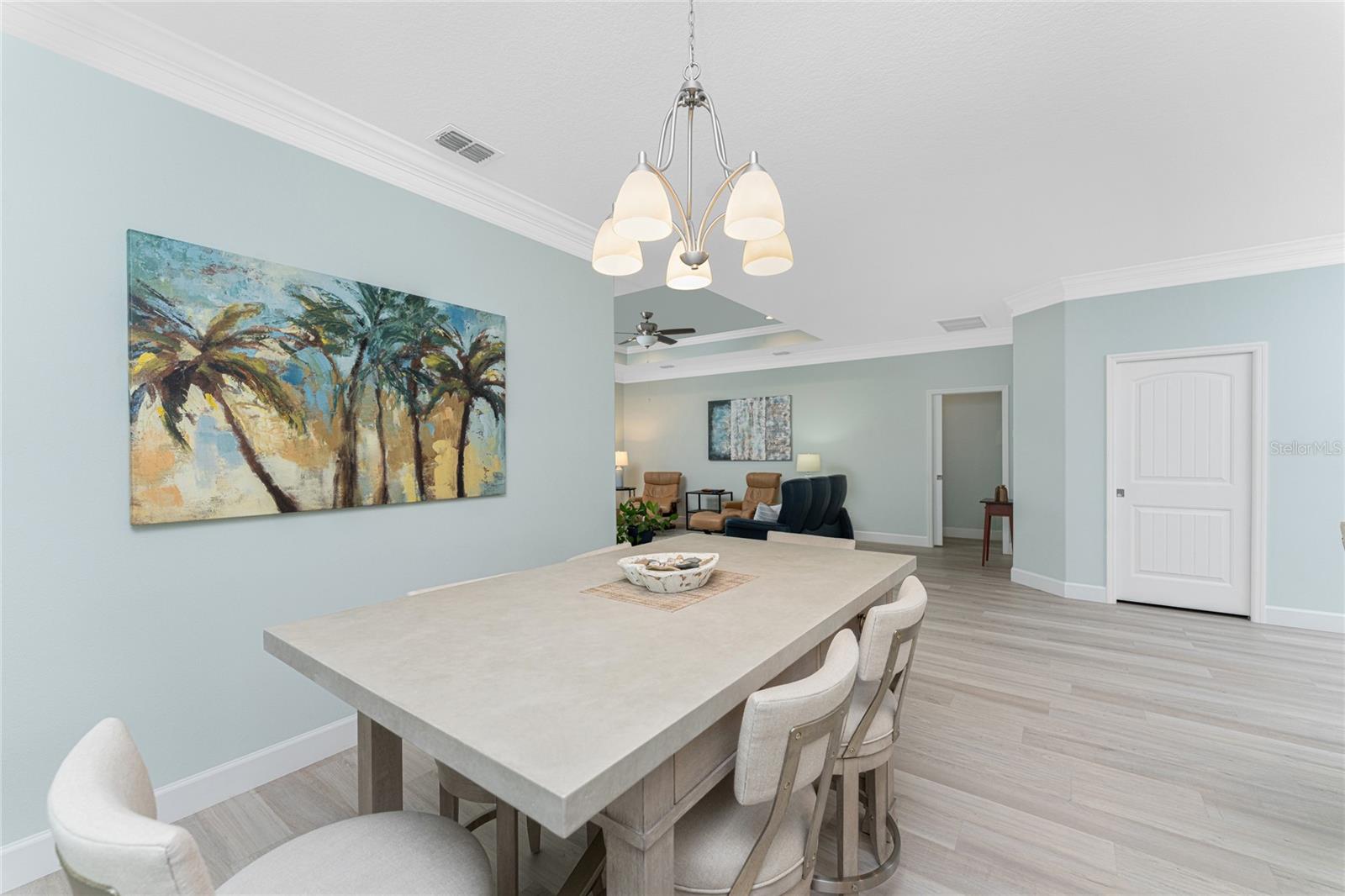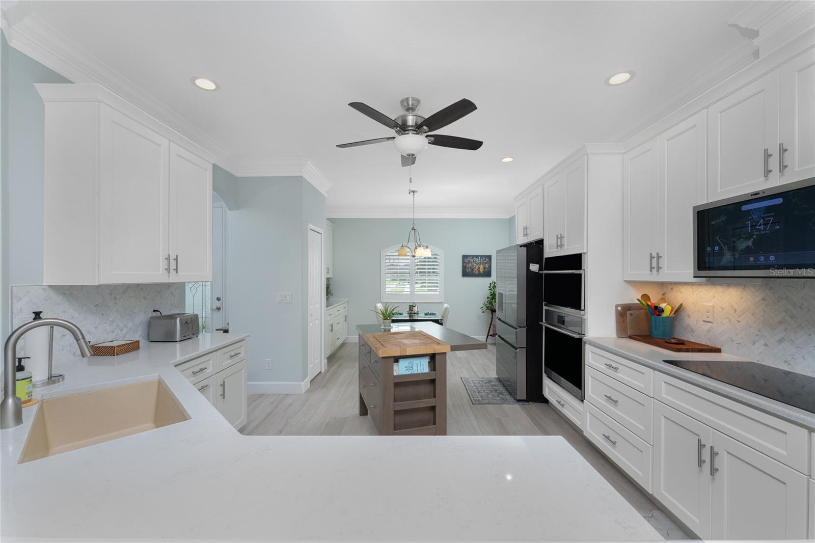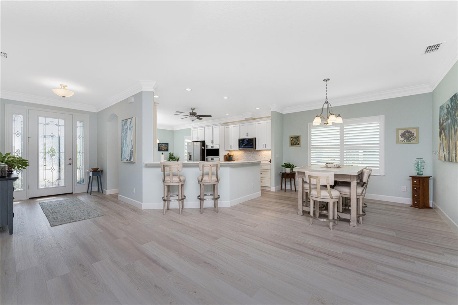 WHY BUILD OR BUY NEW? This 3 bedroom, 2 bath, 2 car garage home has so many upgrades that if you build, will cost you $1000's of dollars extra! Luxury Vinyl Plank flooring through out, crown molding in all major rooms, upgraded kitchen appliances, screened entry with pavers, extended screened lanai area, USB'S in some outlets, Impact windows and doors and so much more!!! Popular Pearl floor plan features a spacious Living area with a tray ceiling with a ceiling fan and pocket sliding doors to the lanai! Adjacent dining area is spacious with plenty of room for entertaining! Kitchen has upgraded Quartz counter tops, upgraded composite sink, pretty backsplash, closet pantry, breakfast bar, ceiling fan and a dinette area with additional cabinetry added for plenty of storage! Appliances include: GE Kitchen Hub Entertainment and Ventilation System, GE Cafe French door refrigerator, GE Cafe microwave, GE Cafe built in oven, GE Cafe dishwasher and GE Profile induction range! Main bedroom has a tray ceiling with crown molding and a ceiling fan, walk in closet with built ins, separate office/den area and another set of sliding glass doors to the lanai!! Main bath has a double vanity with upgraded Quartz top, added cabinetry for lots of storage, Oversized shower with door, privacy commode area and a linen closet. Bedrooms #2 and #3 have ceiling fans and wall closets. The adjacent Guest bath is handily located in between the Guest bedrooms, and features upgraded wood vanity with solid surface countertop, Shower with door (shower walls are tiled to the ceiling, so no wet drywall!) and linen closet. Pocket door to the guest bedrooms adds extra privacy for your guests! Laundry room has a pocket door for access, GE front load washer and dryer, utility tub, and extra cabinetry above for extra storage. The screened lanai has a ceiling fan, OUTDOOR KITCHEN with built in sink with water and electric, perfect for outdoor entertaining! The CAGED AREA has been dramatically increased, so there's plenty of outdoor living area for a firepit, plants, hot tub or whatever you choose!. The 2 car garage has an automatic garage door and pull down stairs for extra storage in the attic! The beautiful tropical landscaping adds to this amazing home. This is a special home and you would do well to call it your Florida paradise! This home is located in one of Englewood's favorite communities, with great amenities such as: clubhouse, pool, tennis/pickleball courts, RV/Boat Parking, and more activities than you could possibly take advantage of! Come take a tour today!