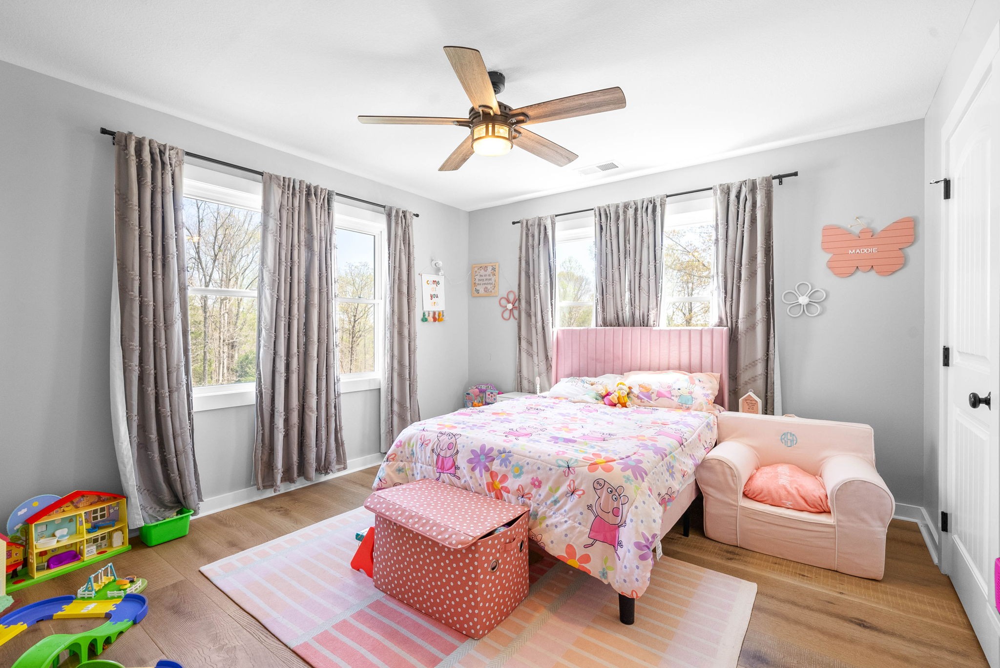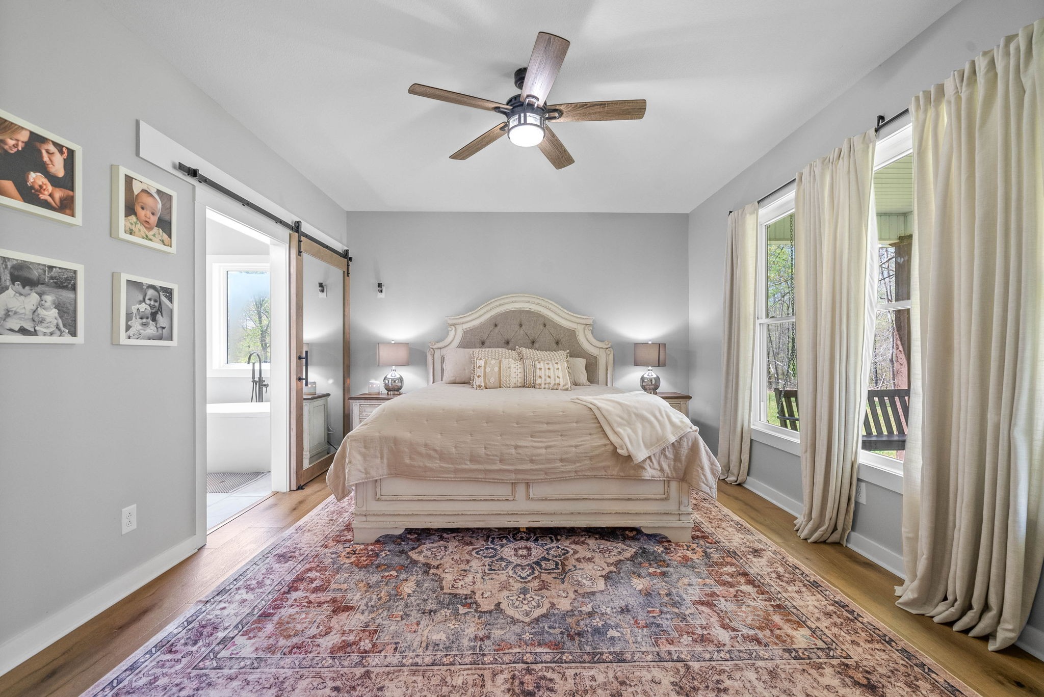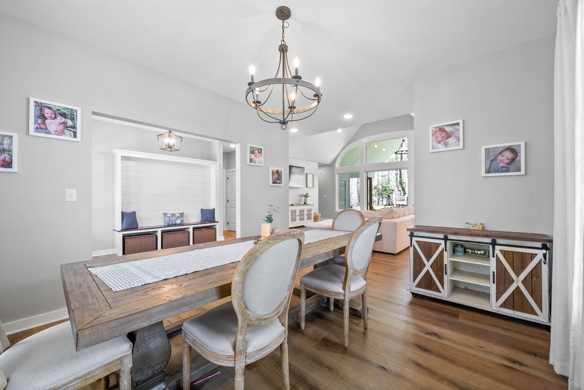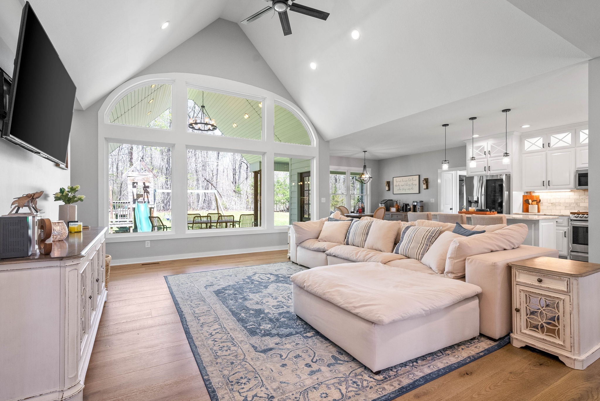 Welcome to your dream modern farmhouse, an exquisite three-story retreat nestled on a sprawling five-acre estate. This stunning home features cathedral ceilings and wide plank wood flooring throughout, creating a warm and inviting ambiance.