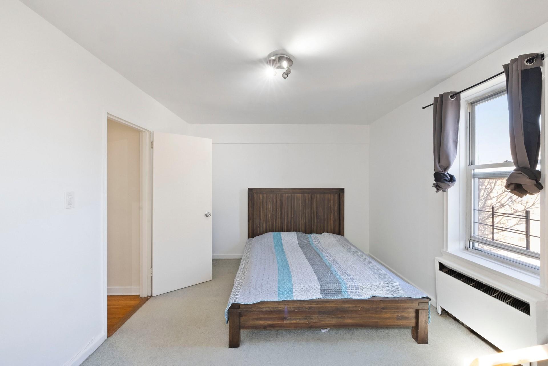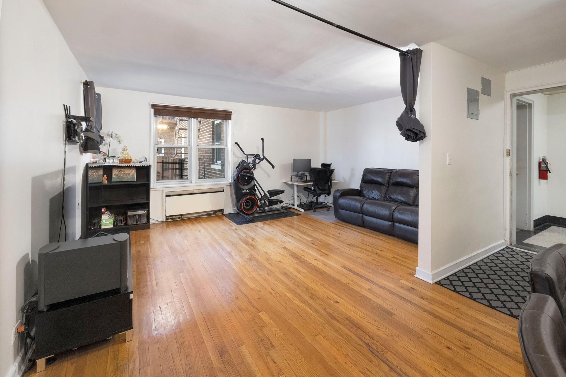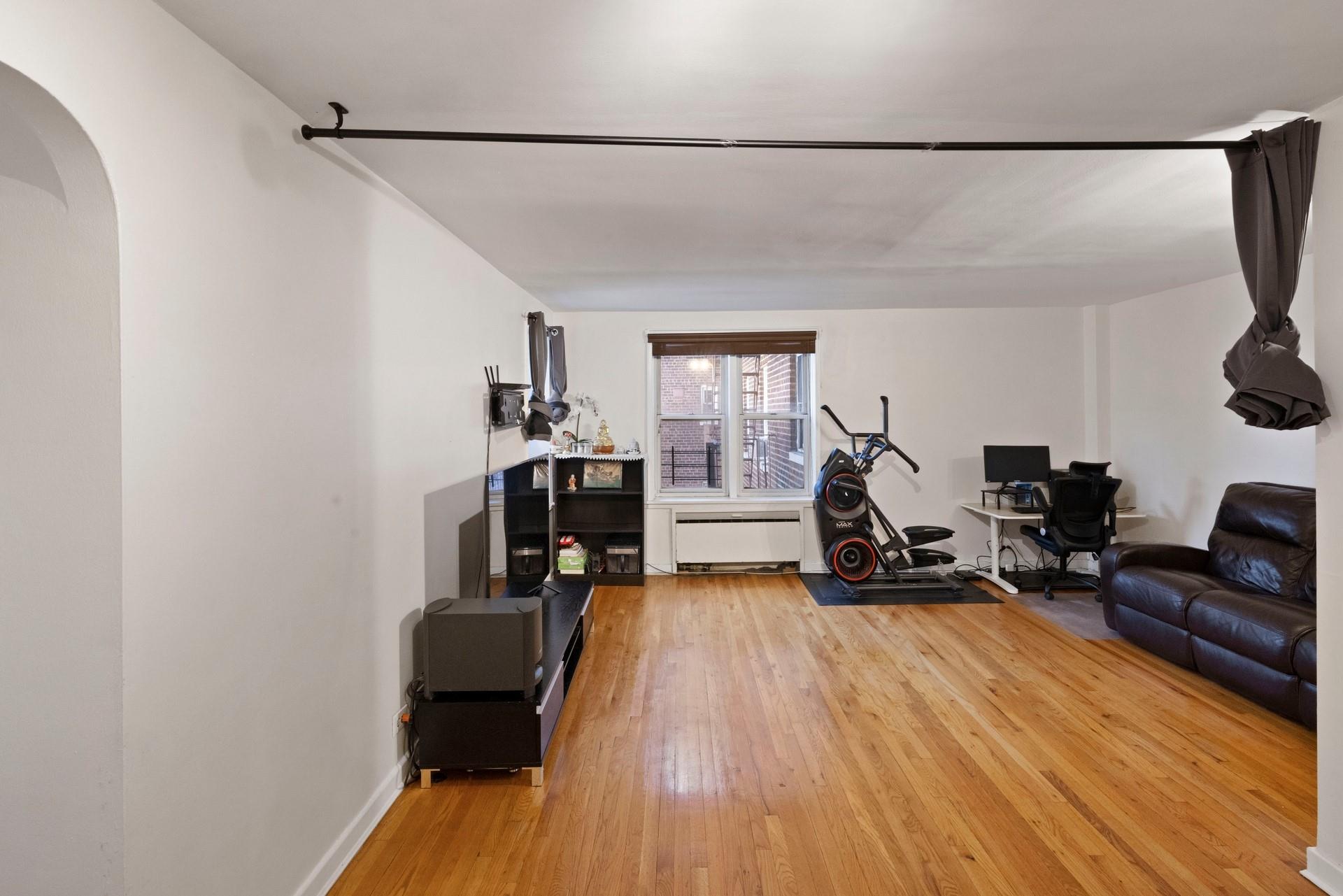 Discover this spacious, 1BR co-op nestled on a quiet and residential street in the heart of Forest Hills. The entryway leads to an open layout living room/dining area with sunlit exposure. The galley kitchen features large cabinets with generous countertops. The hallway leads to an updated windowed bathroom with vanity, tiled walls and floors. The large bedroom easily accommodates a Queen-size bed with double exposure windows and nature views. Freshly painted walls and rich, hardwood floors accentuate the space. (4) floor-to-ceiling closets for ample storage. Sunlit exposure for a bright and airy living experience. A full-service, elevator building that offers a gorgeous, new lobby area, new laundry center, private-gated courtyard/playground, community garden and more. Easy access to all transportation - E/F subway trains (three blocks), MTA buses into Manhattan, LIRR, Forest Hills stadium. Convenient access to LaGuardia/Kennedy airports.