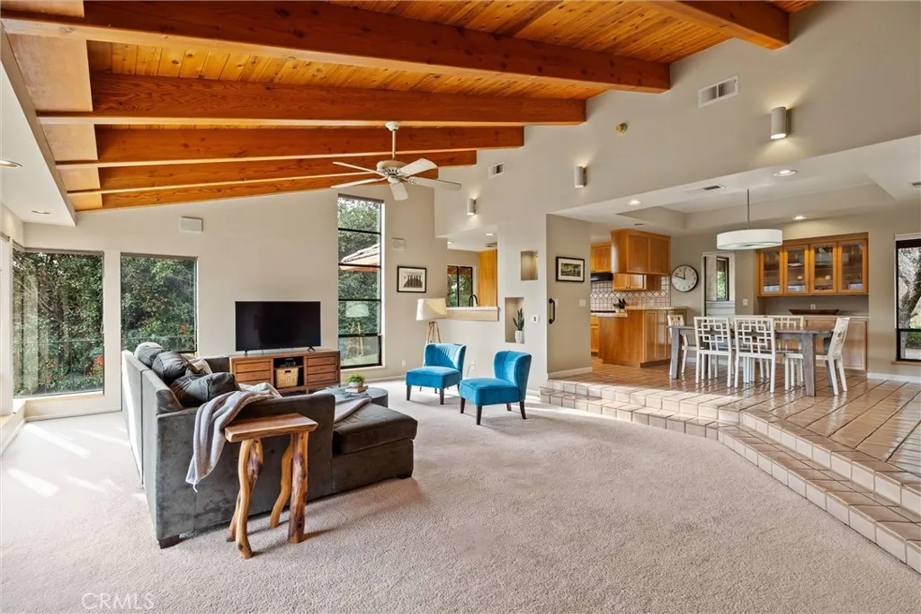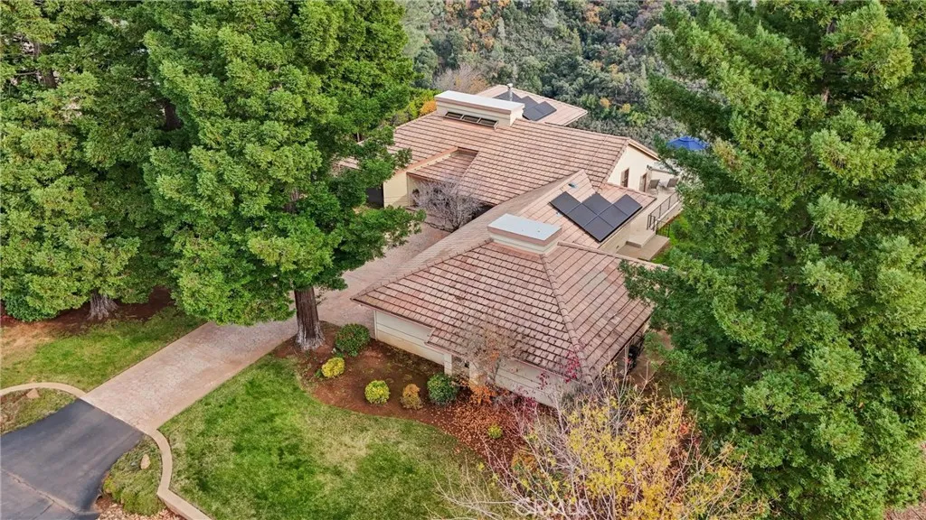 Welcome to 14836 Eagle Ridge Drive, where every day begins and ends with a view that feels almost unreal. Perched above the treetops in the gated Humboldt Highlands community, this 3-bedroom, 2-bathroom, 2,464 sq. ft. home offers serenity, privacy, and scenery that feel worlds away, yet is only a short, scenic drive to Chico. From the moment you step inside, the landscape unfolds around you. Walls of windows, soaring tongue-and-groove wood-beamed ceilings, and thoughtfully placed skylights fill the home with natural light while framing panoramic views of the valley and city lights below. The sunken living room, anchored by a cozy wood-burning stove and oversized windows, creates the perfect space to unwind, gather, or simply take in the breathtaking surroundings. The kitchen sits at the center of the home and is thoughtfully designed with generous counter space, ample cabinetry, and excellent storage. Just off the kitchen are the indoor laundry room and a dedicated craft or overflow space, adding everyday convenience and flexibility. Storage is truly a standout feature of this home, with multiple hallway closets, built-ins throughout, and well-planned spaces that make staying organized effortless. The primary suite is its own tranquil retreat, featuring walls of windows capturing the views, a walk-through closet plus two additional closets, and an ensuite bath with dual sinks, a built-in vanity, and a walk-in shower. Two additional bedrooms offer comfort and versatility, while storage continues to impress throughout the home. The garage expands the possibilities even furthe