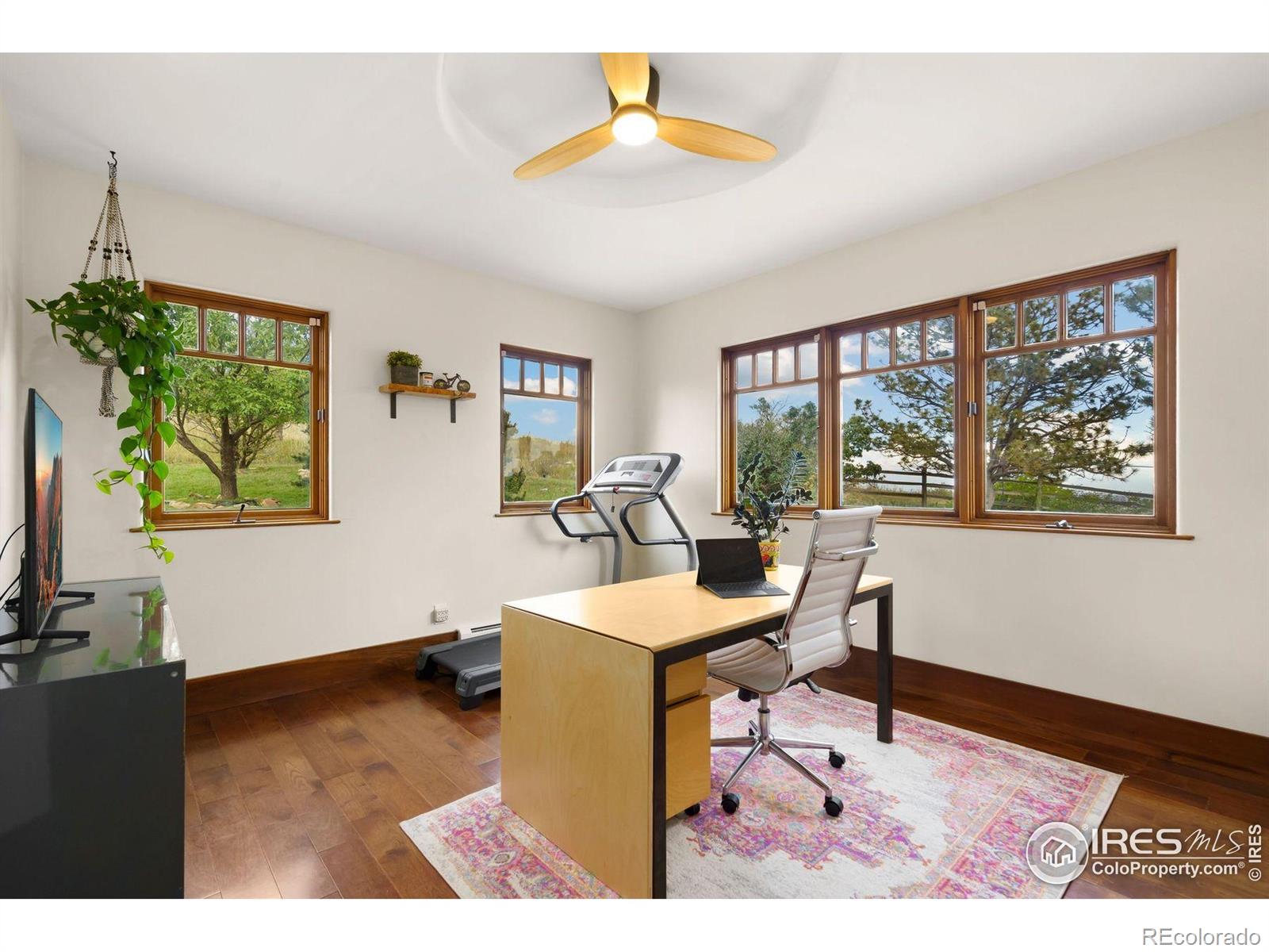 The Colorado dream looks a lot like a 1-of-1 sanctuary perched above Horsetooth Reservoir. Set on 35 acres on a private ridge, 5815 Bighorn Crossing is a retreat that marries rare land, soulful architecture, and everyday livability-minutes to town yet a world apart. The residence spans 4,127 sf with 4 bedrooms and 3 full bathrooms, originally crafted in 1988 with modern touches throughout, thoughtfully oriented to frame sunrise-to-sunset views from nearly every room. Statement fireplaces, high ceilings with wood beams, and rich wood floors create an inviting interior while sprawling windows pull the outdoors in. Entertaining flows naturally from the timeless kitchen to sunny lounges and out to multiple terraces that gaze across the reservoir and city lights. Ascend up a private staircase to the primary retreat offering panoramic views of all that Fort Collins has to offer. A spa like ensuite bathroom awaits you. There is a separate room included in the primary - perfect for a library, home office, or use as the bedroom to give yourself an extra living room upstairs. The "penthouse" primary suite also includes two closets, a cozy gas fireplace, and additional light filled sitting room. What truly sets this property apart is the combination of acreage, architecture, and access: a scenic, gated foothills enclave with quick connections to Harmony/Taft for dining, groceries, and city conveniences-without sacrificing privacy. Properties with this scale of land and outlook seldom change hands here; and this masterpiece is among Horsetooth's limited collection of ridge-top homes. Whether you're hosting fireside dinners, opening French doors to morning light, or immersing yourself in the wildlife that surrounds, this isn't just a home-it's a Northern Colorado lifestyle waiting to be lived.