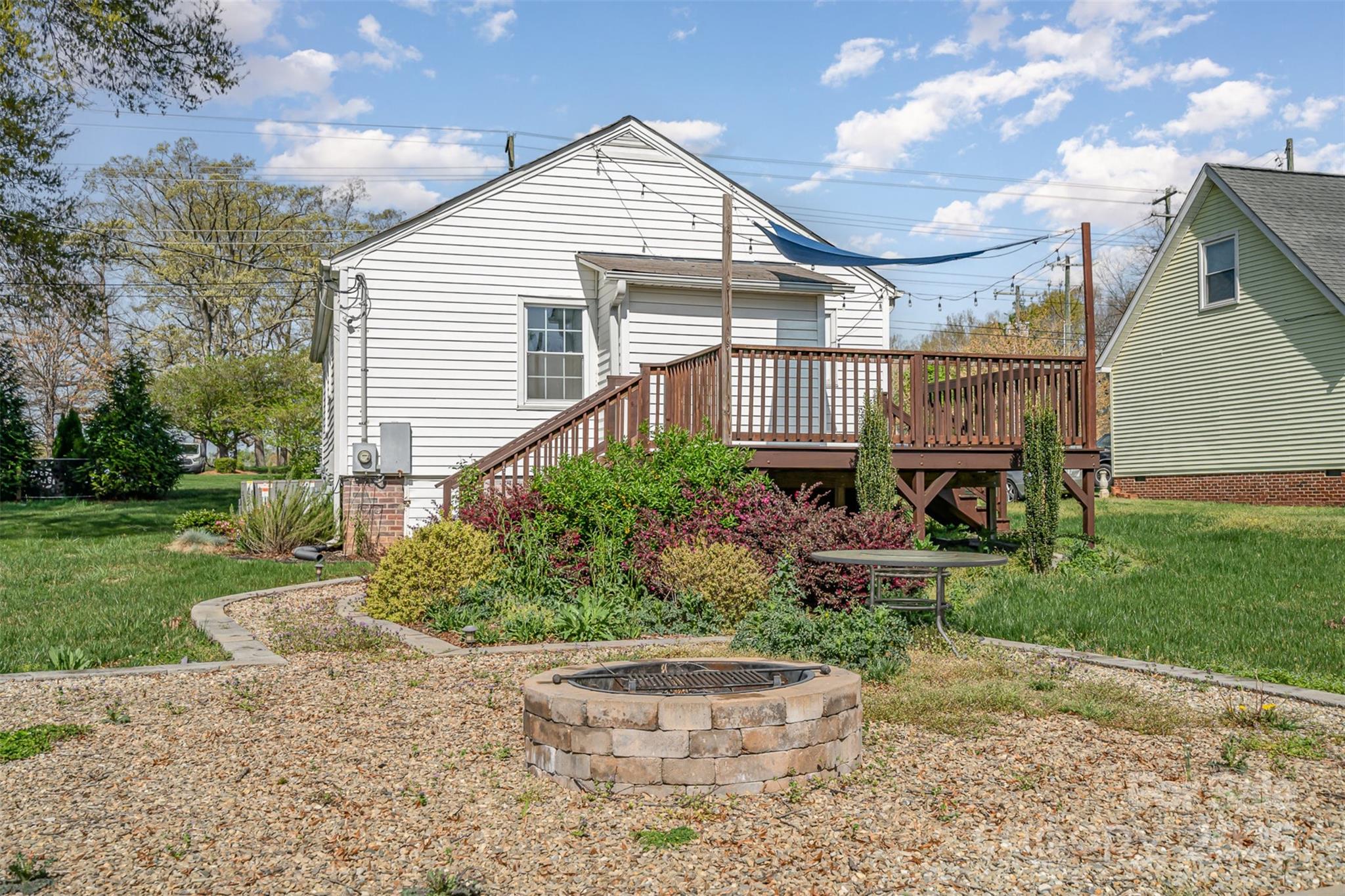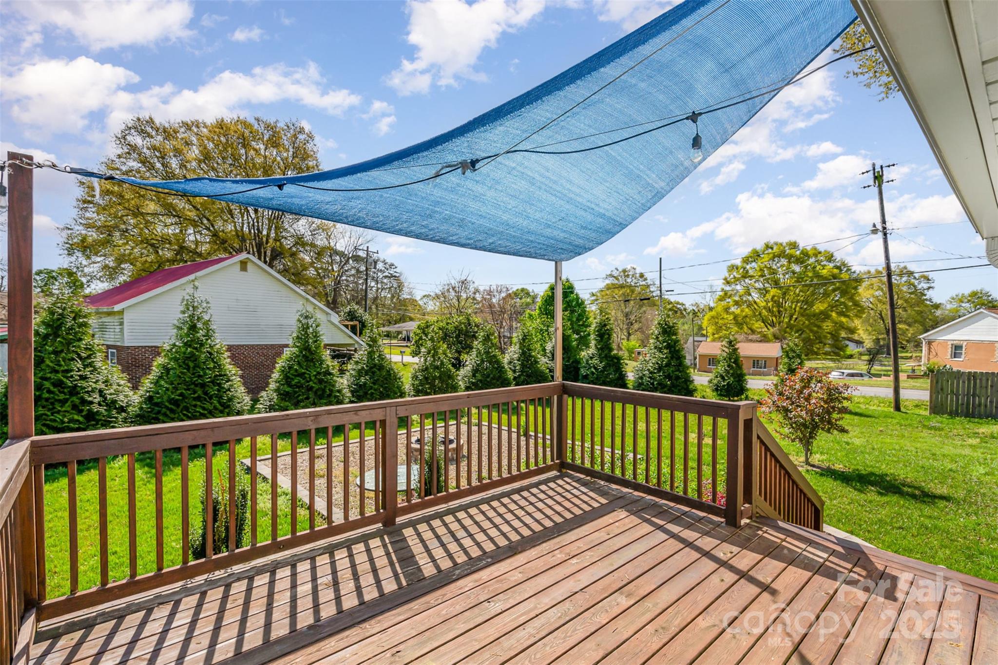 Step outside and enjoy your own backyard retreat featuring a spacious deck shaded by a sun sail, a cozy firepit perfect for gatherings, and beautifully landscaped gardens framed by evergreens and stone borders for added privacy.