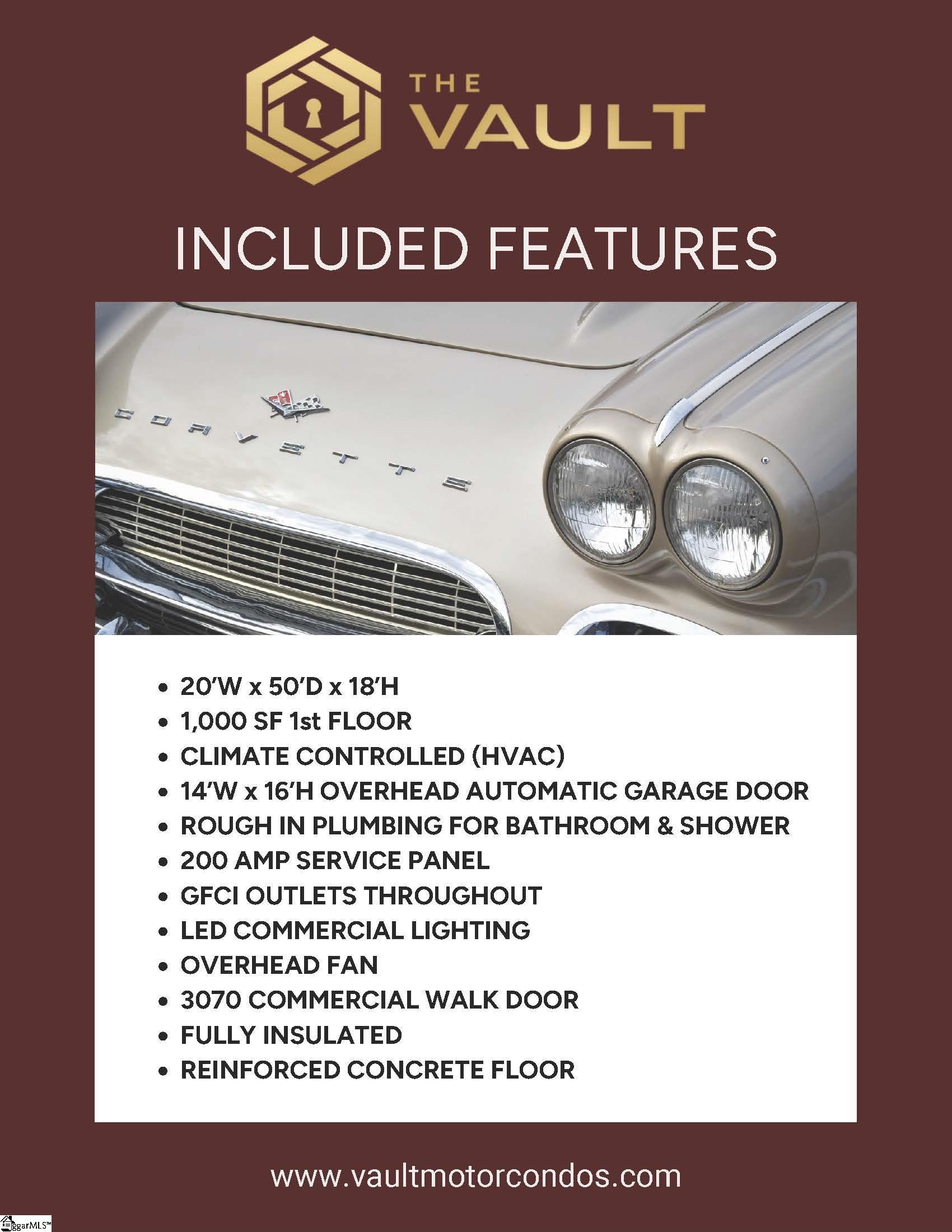 The Vault Motor Condos, Greenville's FIRST and ONLY Luxury 'Motor Condominium' Gated Community with private (safe and secure) garage condos that you OWN - meet a community and lifestyle of like-minded owners. The Vault Motor Condos - Greenville, is a private gated community, includes 20'Wx50'Dx19'H, 1000 sqft (1st floor), climate controlled (HVAC), 14'WX15'H overhead automatic garage door, 3070 commercial walk door, rough in plumbing for bathroom and shower, 200 AMP service panel, GFCI outlets throughout, LED commercial lighting, overhead fan, fully insulated, reinforced concrete floor. Each unit will have its own electric meters and a commercial grade mini-spilt for heating and air. EACH CONDO CAN BE CUSTOMIZED WITH OPTIONAL AMENITIES: full bath, custom bar, personal office, luxury lounge area, gourmet kitchen, home theatre.... POSSIBILITIES ARE ENDLESS! This is an exceptional opportunity for those seeking to merge their passion for cars, hunting/firearms, boats/watercraft, ATV's, RVs, motorcycles ect. with their lifestyle aspirations to create the Ultimate "Man Cave." If more space is needed, additional suites can be purchased and combined. Many units have already sold and these won't last long at this introductory pricing. Other locations are available throughout the United States as well, for more information please reach out. *NOT for use of operating a business or residential housing.