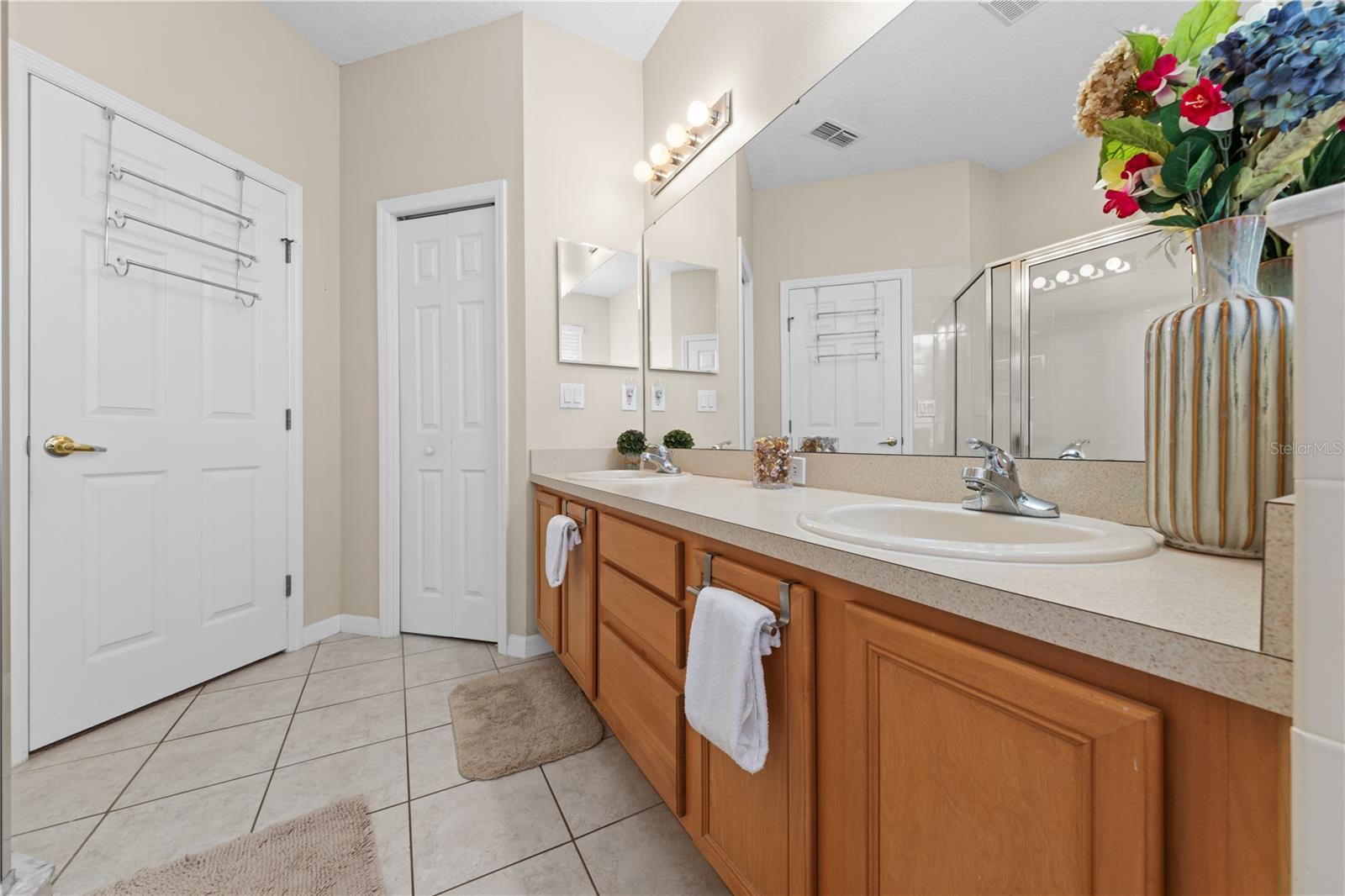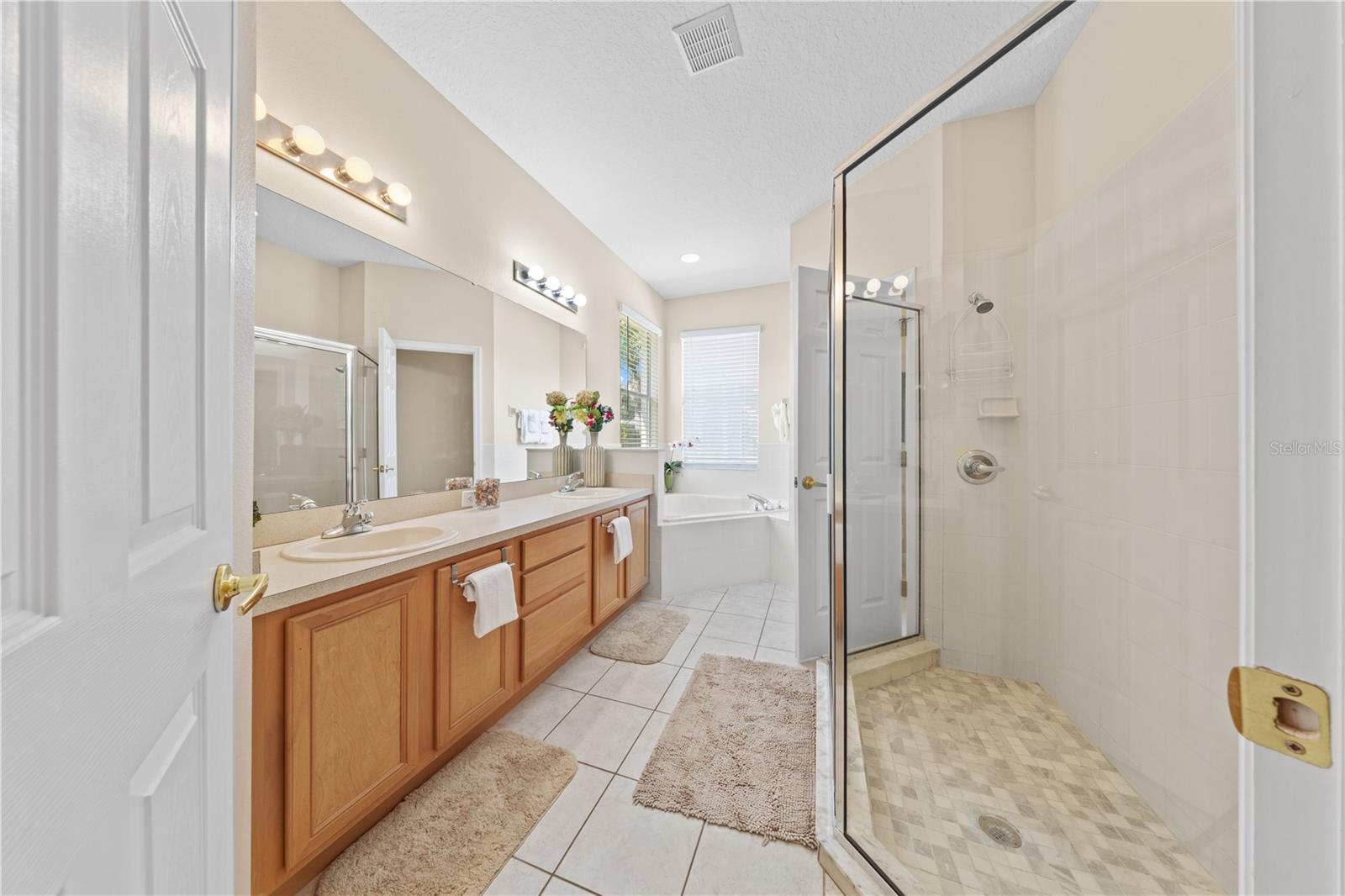 The primary suite features private patio access, a large walk-in closet, and an en-suite bath with dual vanities, soaking tub, and separate shower. A second en-suite bedroom offers privacy for guests or extended family, while two additional bedrooms share a third full bathroom.