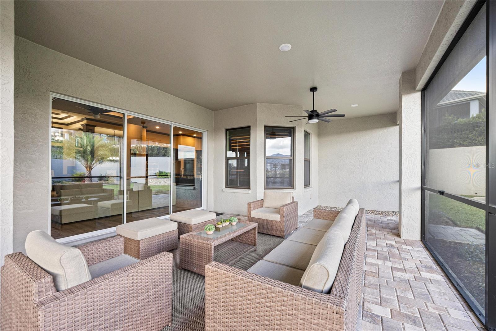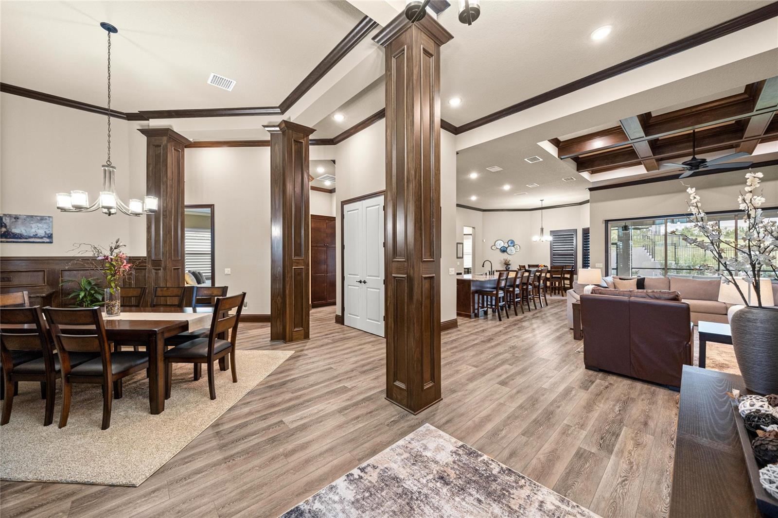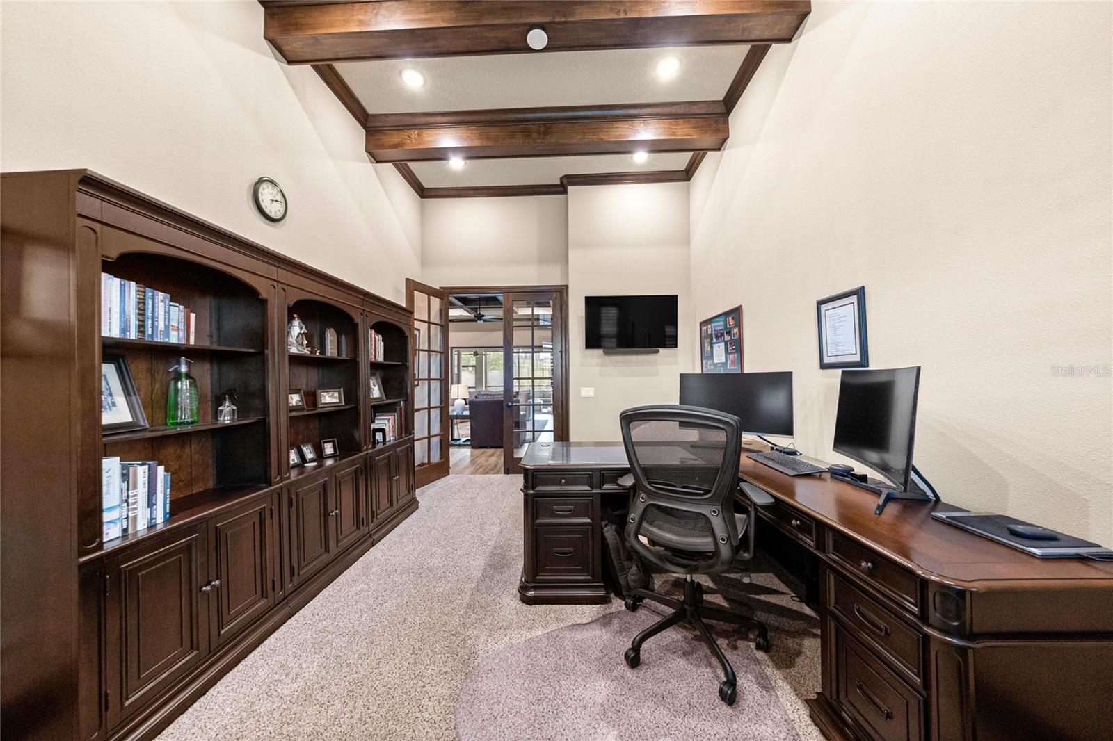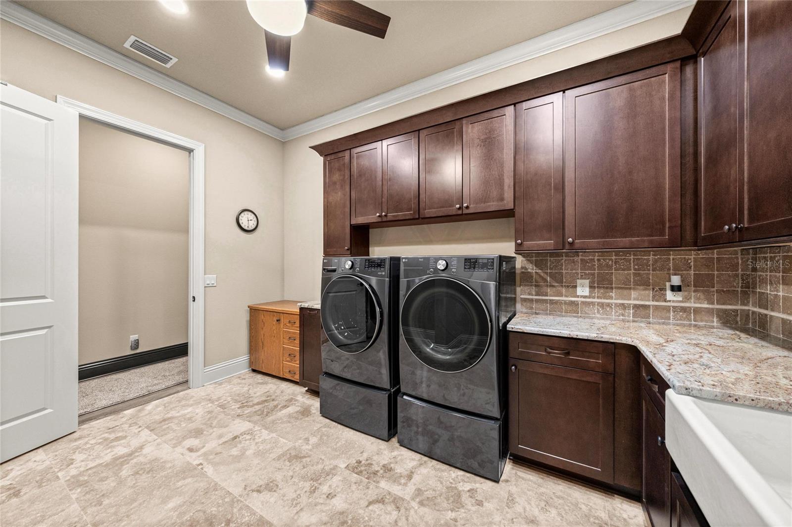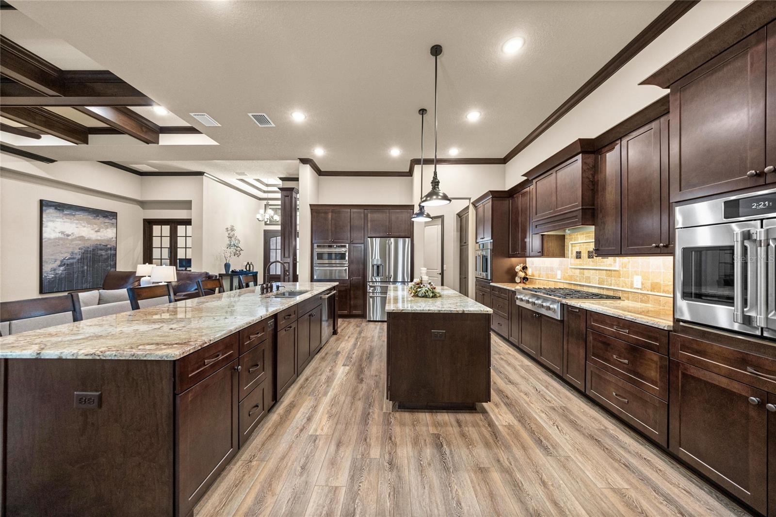 Looking for a NEW home without the stress and hassle of building it? This is a custom built, 4/3.5, split ranch open floor plan at 3,405 sq. ft of living space and an additional spacious 3.5 car garage at 1,286 s.f. This home sits inside the double-gated community of Hall’s Reserve inside the community of Terra Vista in the master planned community of The Villages of Citrus Hills. This home is ready to move into. The on-site amenities in this community are amazing; 3, 18-hole golf courses, two fitness centers including the newest 55,000 sq. ft. center within a 2-minute drive and an entirely new sports complex under construction 6-minutes away, 3, on-site restaurants from casual through fine dining, tennis court complex, 8-pickleball courts (with another 24-courts and outdoor recreation complex under construction), indoor & outdoor pools, and numerous clubs and activities for residents. This Hudson-style 2025 home is less than 6-months old. Owners moved in June 2025 and are relocating back to Georgia. Owners selected almost every upgrade offered by the Developer (less an outdoor kitchen, plumbed for natural gas/ready to go) in addition to many incremental upgrades added by Owners. Premium custom trim and finish work throughout the home with upgraded ceilings throughout. Gourmet kitchen is equipped with two split French–door ovens (w/ convection and air fryer features), warming drawer, a 6-burner gas range top, double wide refrigerator, dishwasher and water softener. Granite countertops everywhere throughout the home including the garage sink vanity along with custom cabinetry throughout the home. Entry door is a double-wide, custom, American-made, wrought iron-door. Home’s trim package includes solid core doors throughout, upgraded crown molding in every room with a stunning coffered ceiling in the Great Room complemented with a stone fireplace floor to ceiling with a built-in fireplace insert to heat 400 s.f. of Great Room living area for chilly winter evenings. Separate formal Dining Room, (in addition to the separate breakfast nook) with beautifully trimmed wainscot with custom built buffet and refrigerated wine cooler. Home comes with a spacious, high-end laundry room that is loaded with custom cabinetry, travertine flooring, granite countertops, farmhouse porcelain sink and built-in ironing board. Owner’s Suite flows into an ensuite bathroom with custom travertine tile work, and walk-in shower. The home is finished with plantation shutters throughout. Oversized three-car garage plus a golf-cart bay with an extended length bay for boat storage/larger vehicle as well. Owners added a storage/workshop area at ground level for space additive to the 3.5-car garage with stained flooring and special coating for aesthetics and traction. Home’s driveway and lanai built with beautifully adorned pavers (already professionally sealed for long life) and a spacious wide-entry complementing the home’s curb appeal. Owners have invested in a professional, heavy landscaping package for immediate impact rounding out a stunning curb presentation of the home. Unlike many Florida homes with undersized garages, you will have a very large garage with ground level storage in this home. Located 6-minutes from convenient shopping and restaurants and 6-minutes from the recently approved Tampa General Hospital construction and 8-minutes from the new on-ramp for the Suncoast Parkway straight into Tampa.
